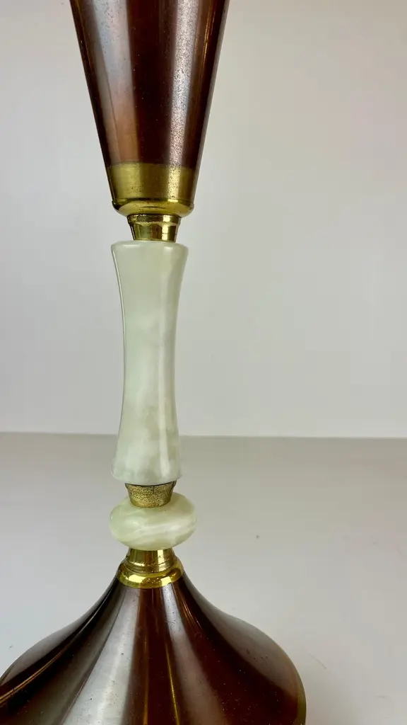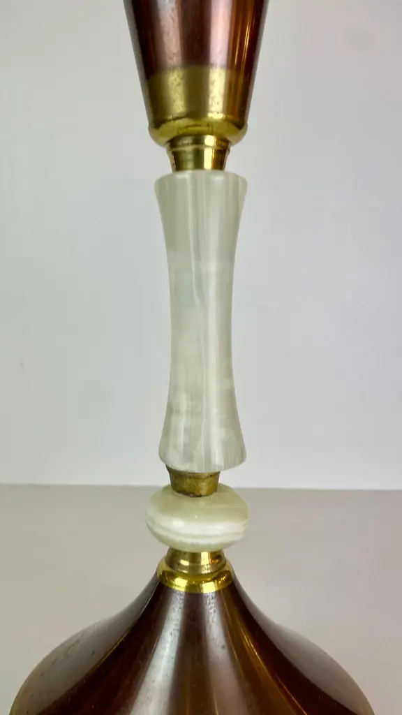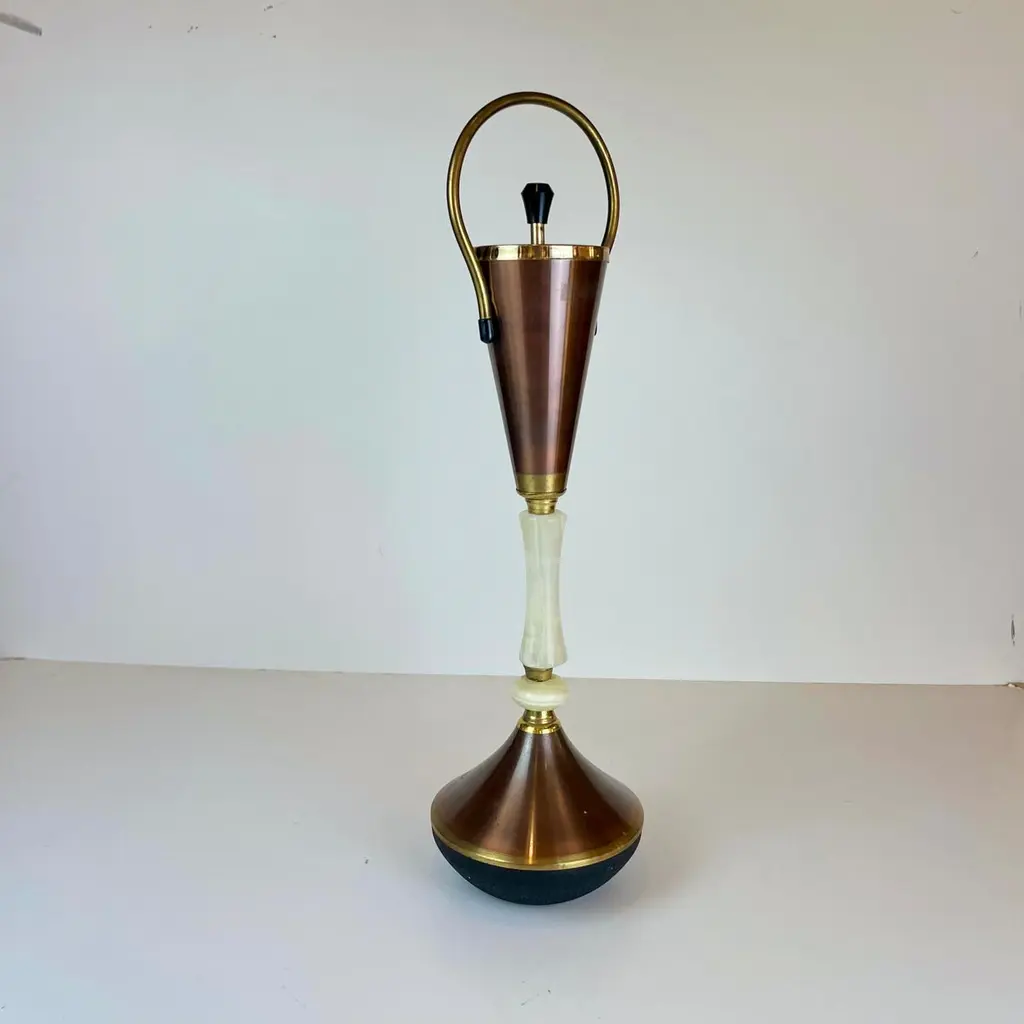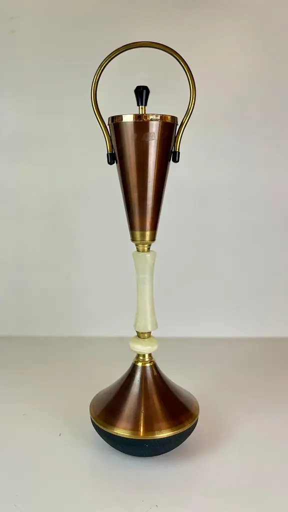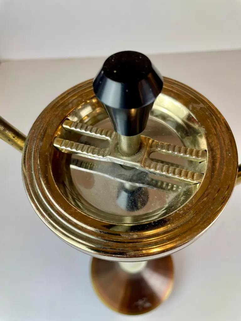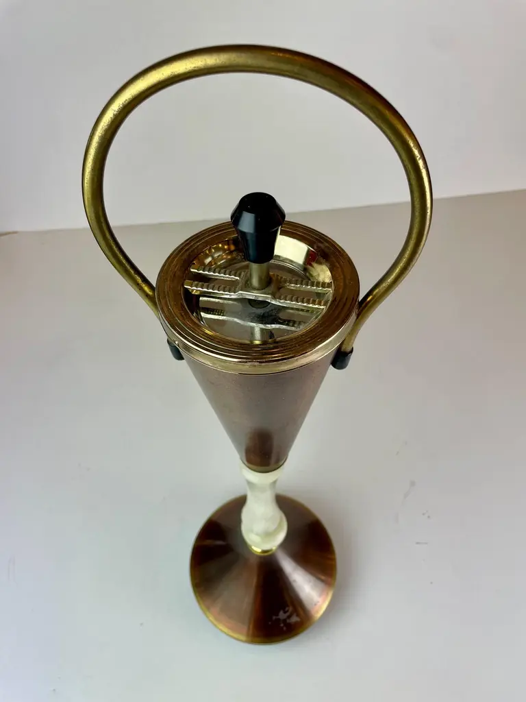 Clean and functional Culbuto ashtray with handle, made of brass and copper, designed in Italy in the late 1950s or early 1960s.-Cendrier Culbuto propre et fonctionnel, avec poignée, fabriqué en laiton et cuivre, conçu en Italie à la fin des années 1950 et au début des années 1960.Origin: ItalyDesign period: 1950s ~ 1960’sMaterials: metalColor: yellow and red goldDimensions: H 63 x D 18 cm
