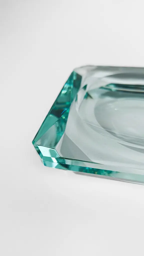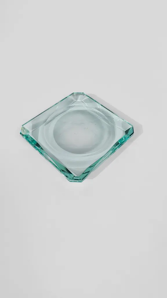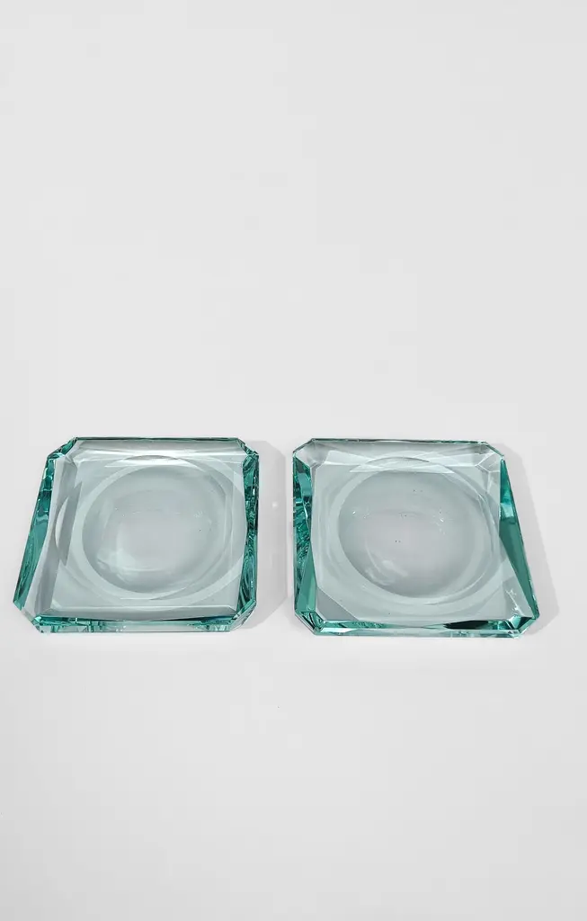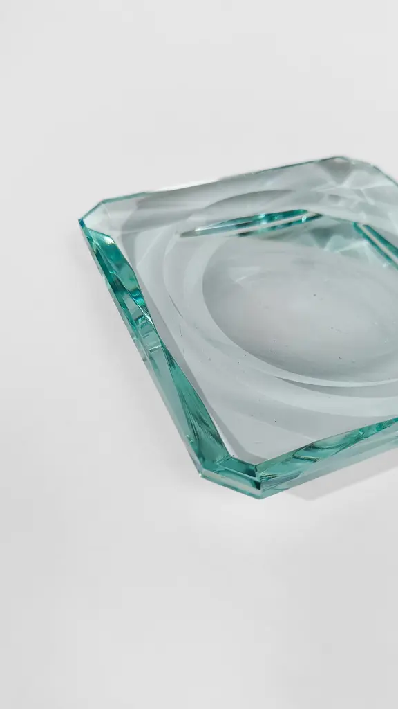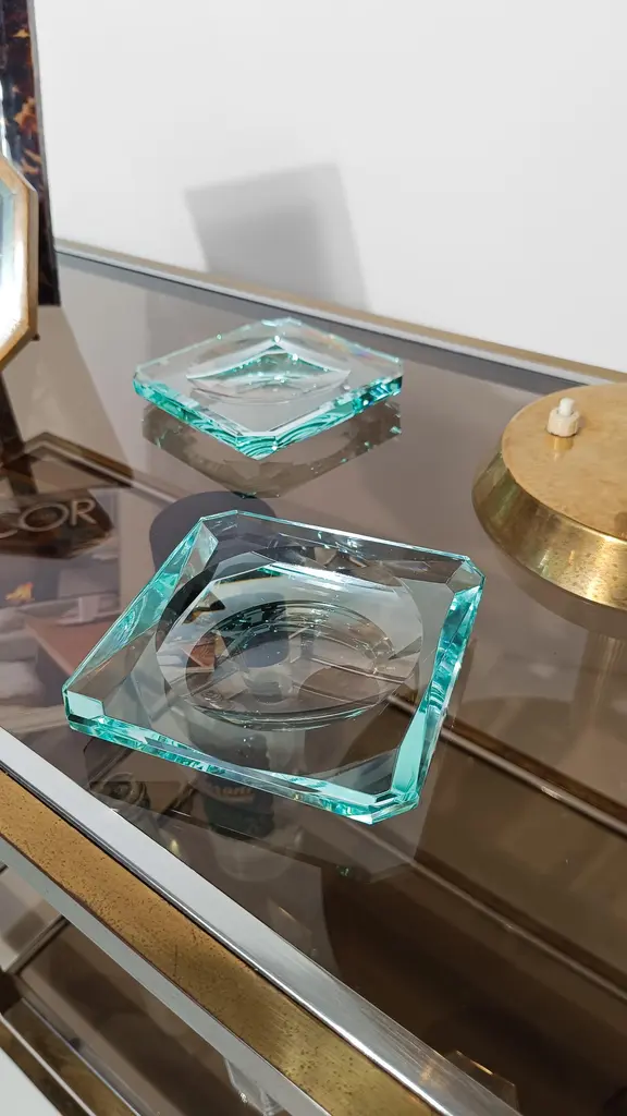 I am offering for sale two twin objects of great charm and elegance in their simplicity.A single material used, a splendid Nile green glass cut and bevelled following an essential and very elegant design.Two blocks of glass measuring 12cm by 12cm, 2cm thick, cut and ground as if they were two diamonds.The bevelled cuts made on these vintage ashtrays create splendid variations in colour by reflecting the light.Depending on the light, they can dematerialise becoming almost transparent or accentuate their presence becoming an intense blue.Made in Italy between the 1960s and 1970s, these splendid decorative objects have no label or signature that can ascertain their origin but the material used and the artisanal manufacturing allow us to attribute their production to the historic Italian manufacturer "Fontana Arte".The items can be purchased separately, both do not have obvious defects such as breakages or chipping but only minimal and imperceptible signs of use and aging.Reach out with questions.