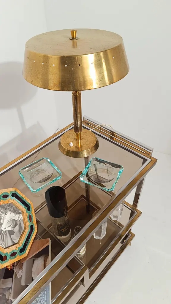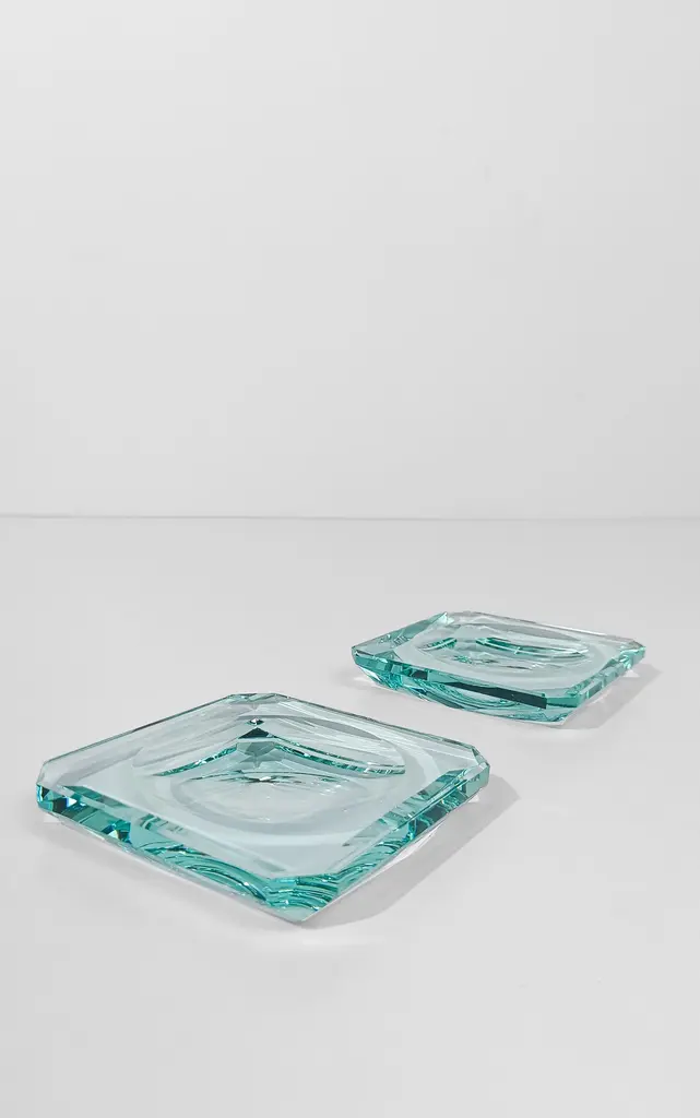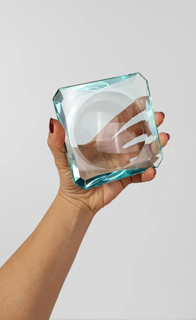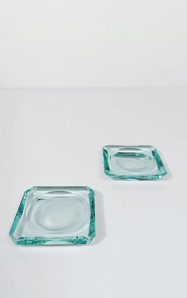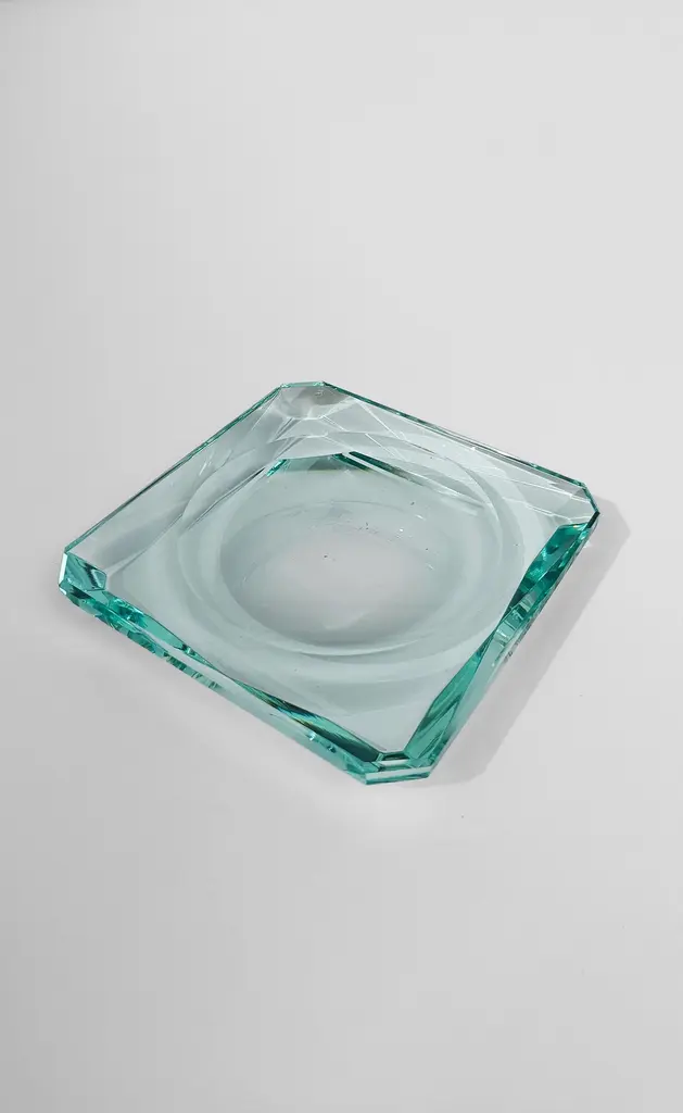 I am offering for sale two twin objects of great charm and elegance in their simplicity.A single material used, a splendid Nile green glass cut and bevelled following an essential and very elegant design.Two blocks of glass measuring 12cm by 12cm, 2cm thick, cut and ground as if they were two diamonds.The bevelled cuts made on these vintage ashtrays create splendid variations in colour by reflecting the light.Depending on the light, they can dematerialise becoming almost transparent or accentuate their presence becoming an intense blue.Made in Italy between the 1960s and 1970s, these splendid decorative objects have no label or signature that can ascertain their origin but the material used and the artisanal manufacturing allow us to attribute their production to the historic Italian manufacturer "Fontana Arte".The items can be purchased separately, both do not have obvious defects such as breakages or chipping but only minimal and imperceptible signs of use and aging.Reach out with questions.