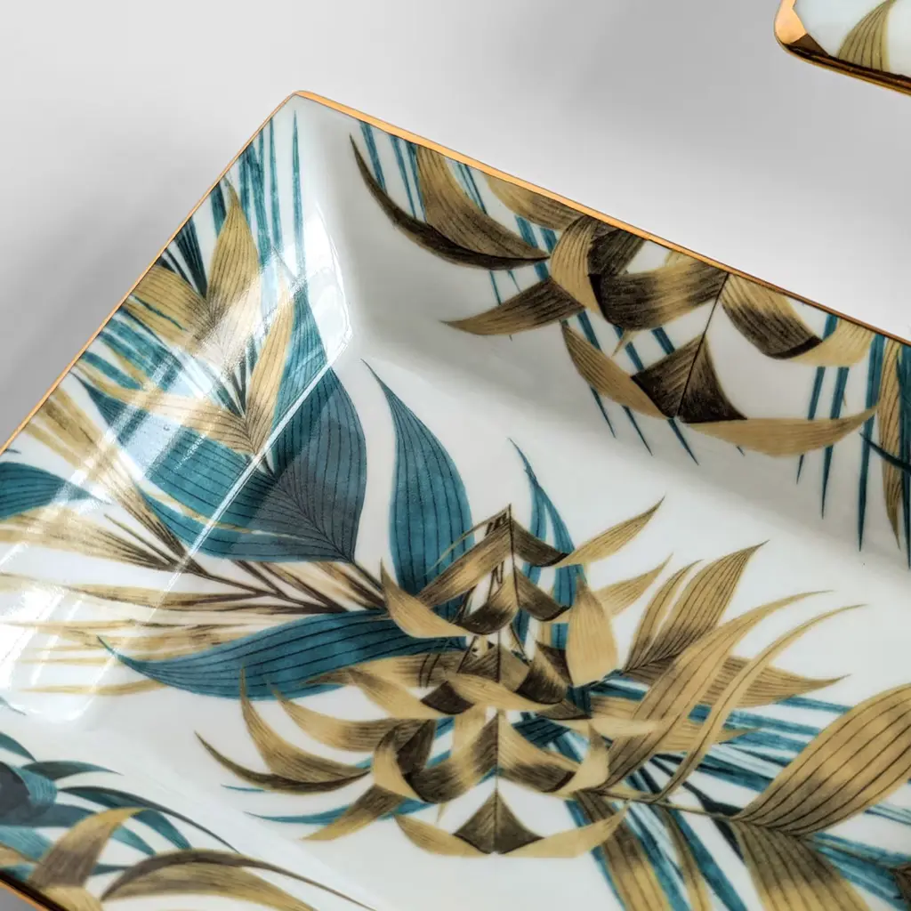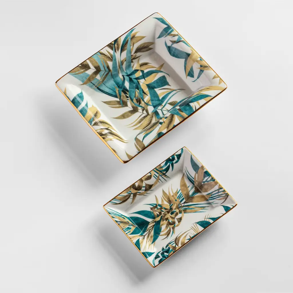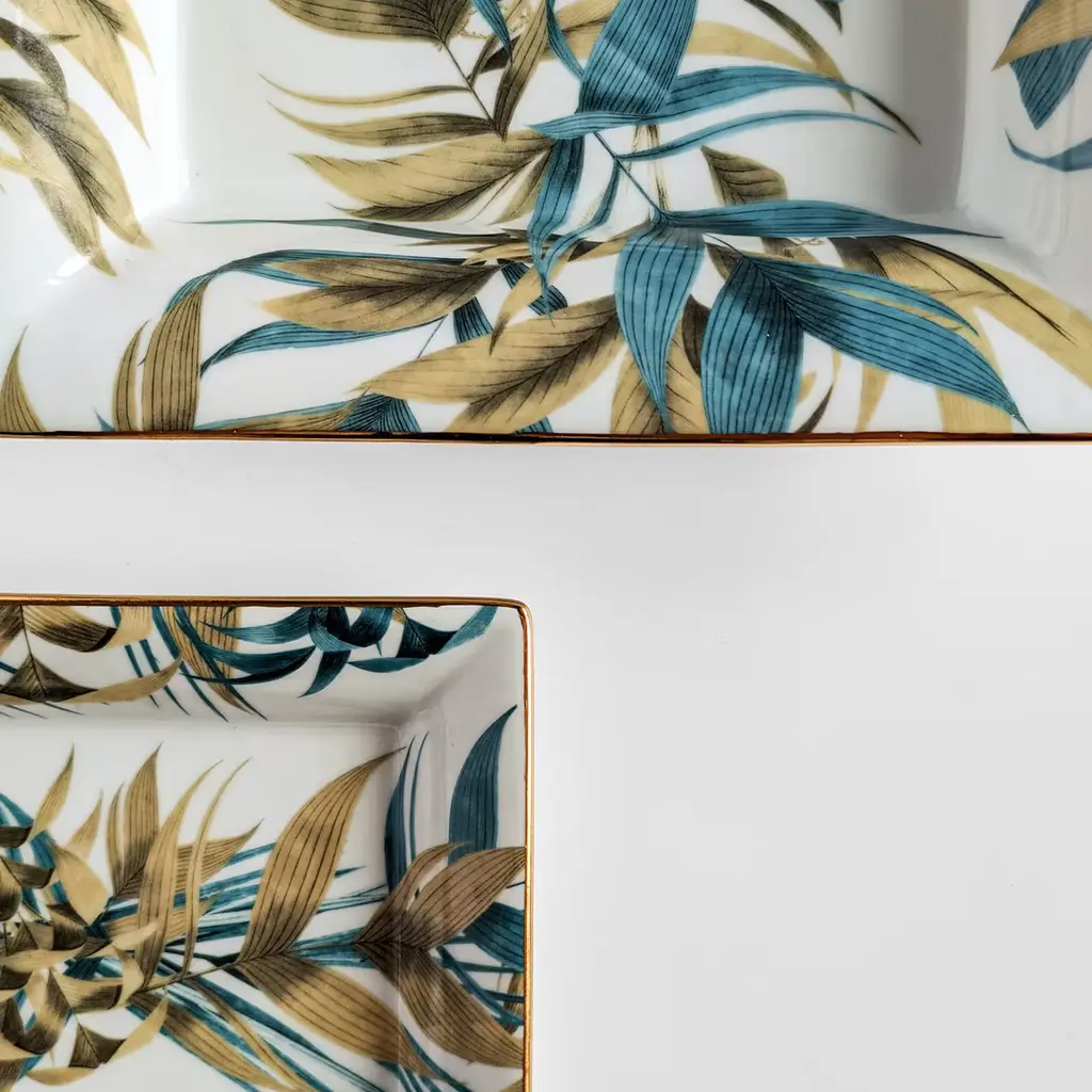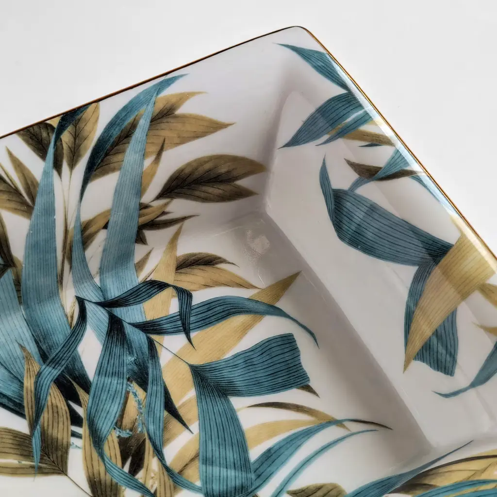 This remarkable porcelain set of an ashtray (cm 15 x 11.5 x 2.5 H) and vide-poche (cm 19.5 x 16 x 4 H) belongs to the Las Palmas Collection, featuring decorations inspired by the rainforest near the city of Palmas, Brazil. Green and blue foliage intertwine while delicately standing out from the glossy, white background with a bright golden rim.