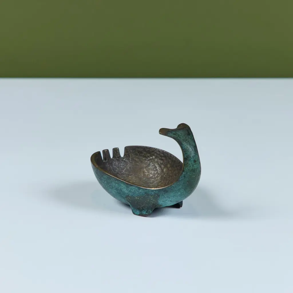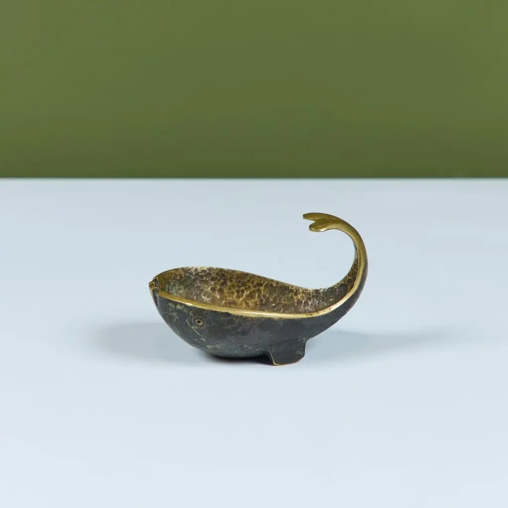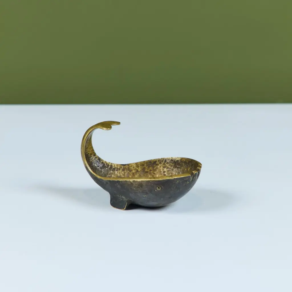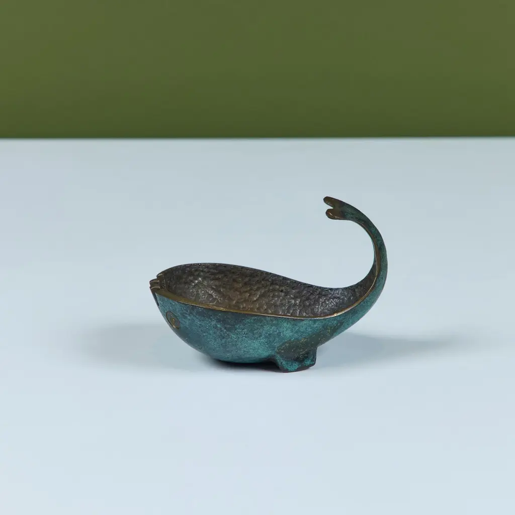 Bronze ashtray in the shape of a whale, with a curved tail and three grooves at the front of the piece. It has a hammered interior and a slight verdigris patina. An embossed stamp on the underside reads Pal-Bell Co. Made in Israel.Dimensions4.5” width x 3” depth x 3” height.ConditionGood vintage condition with age appropriate patina. Multiple available all with varying patina and coloring. Please inquire if you would like a specific coloration pictured.