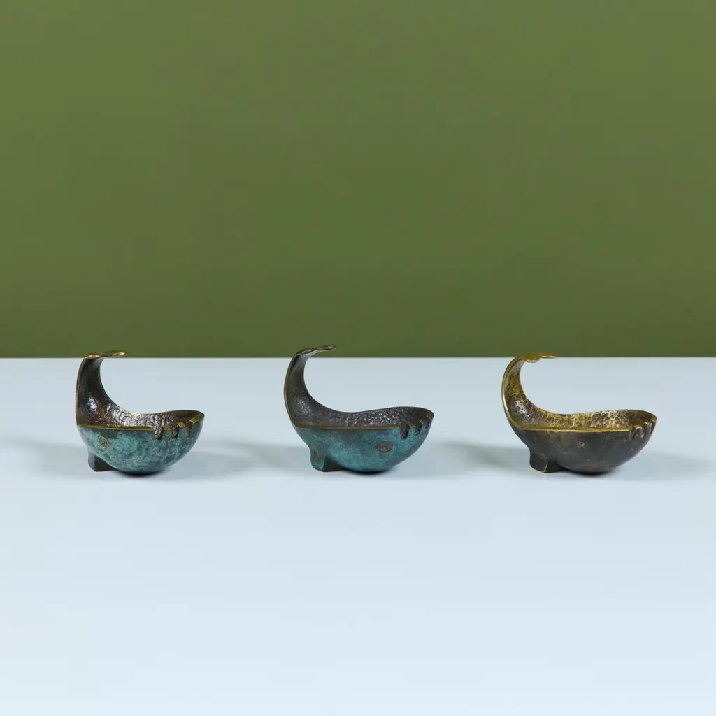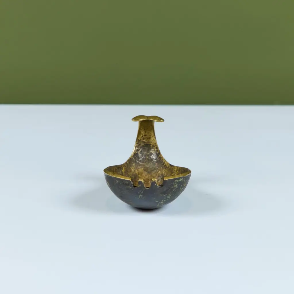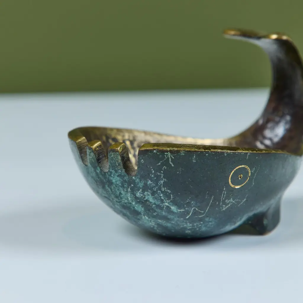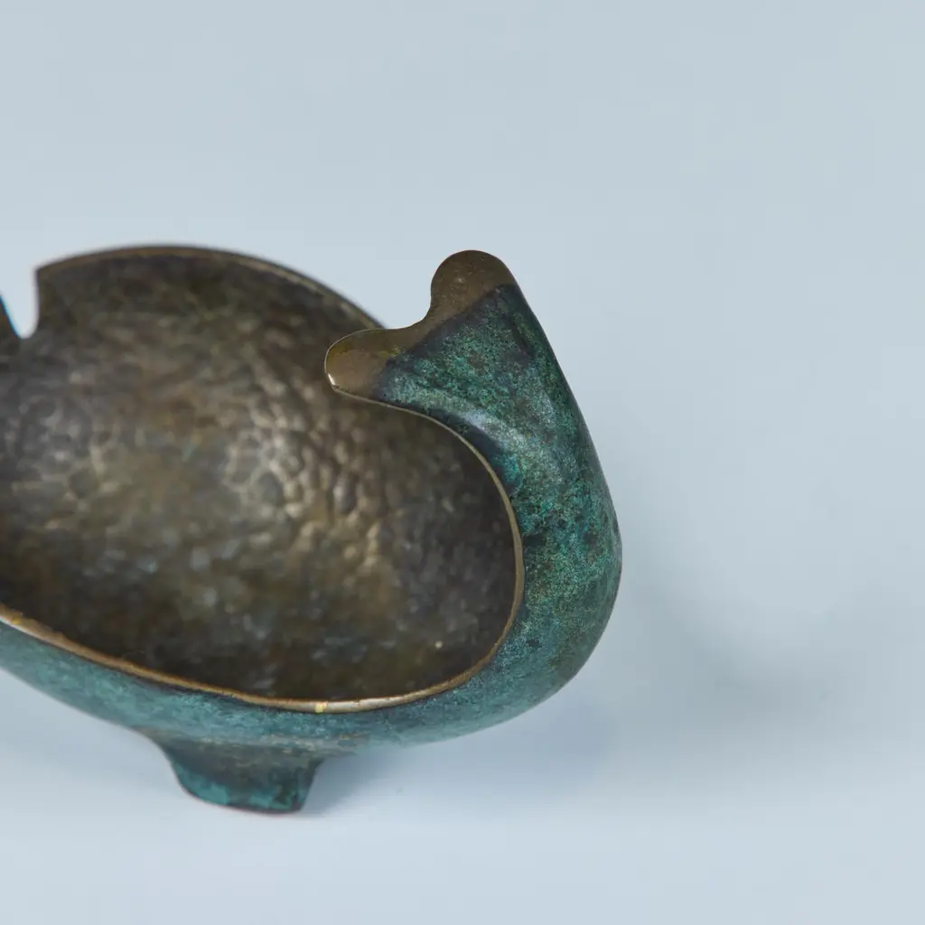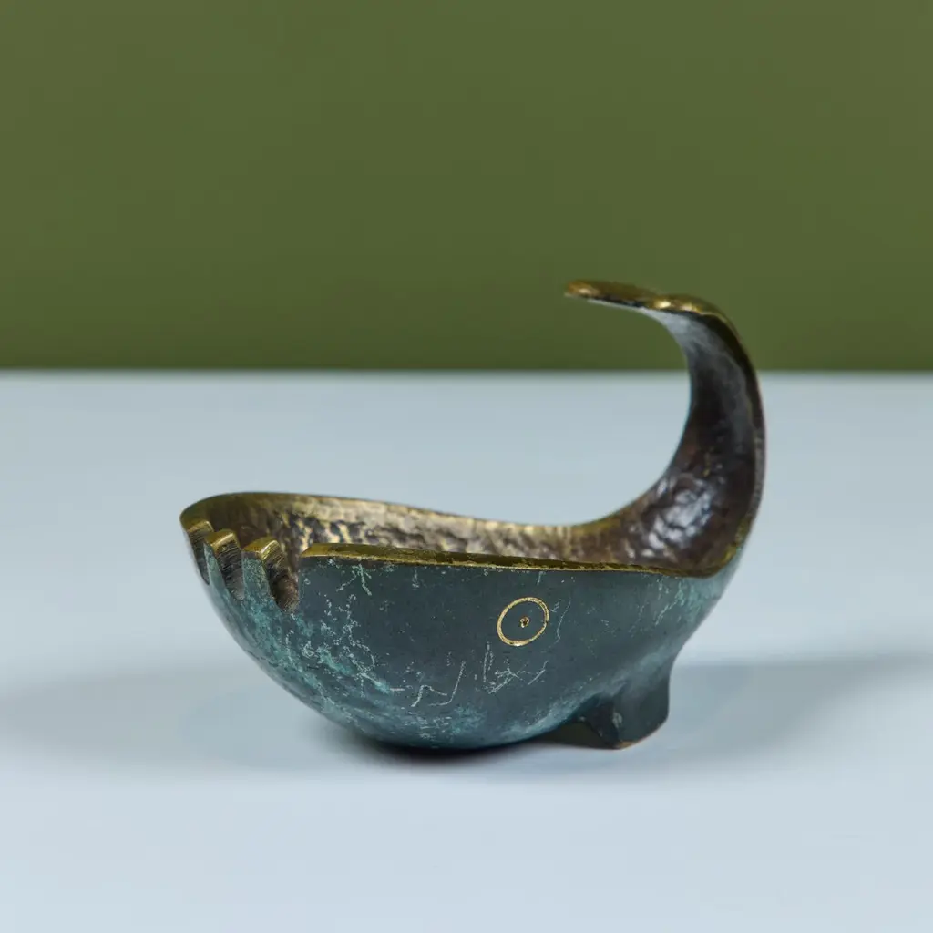Bronze ashtray in the shape of a whale, with a curved tail and three grooves at the front of the piece. It has a hammered interior and a slight verdigris patina. An embossed stamp on the underside reads Pal-Bell Co. Made in Israel.Dimensions4.5” width x 3” depth x 3” height.ConditionGood vintage condition with age appropriate patina. Multiple available all with varying patina and coloring. Please inquire if you would like a specific coloration pictured.
