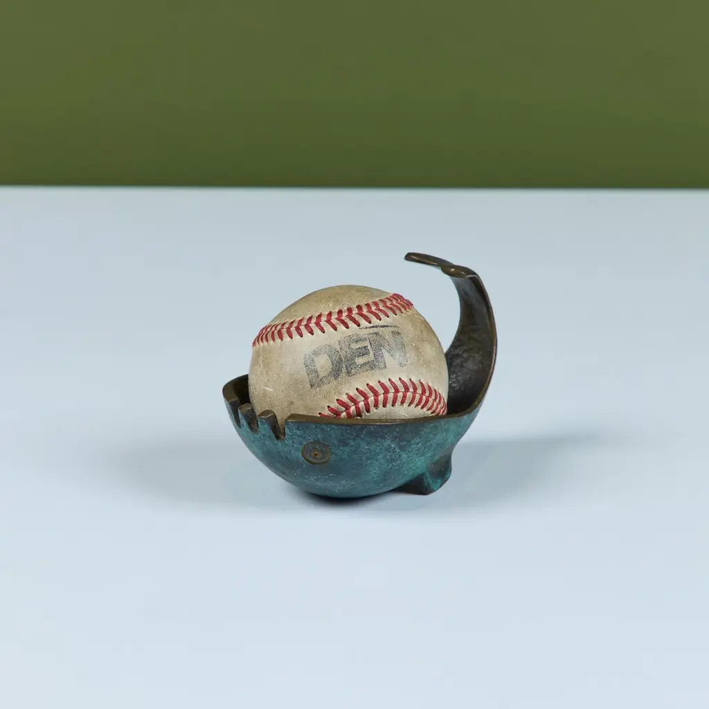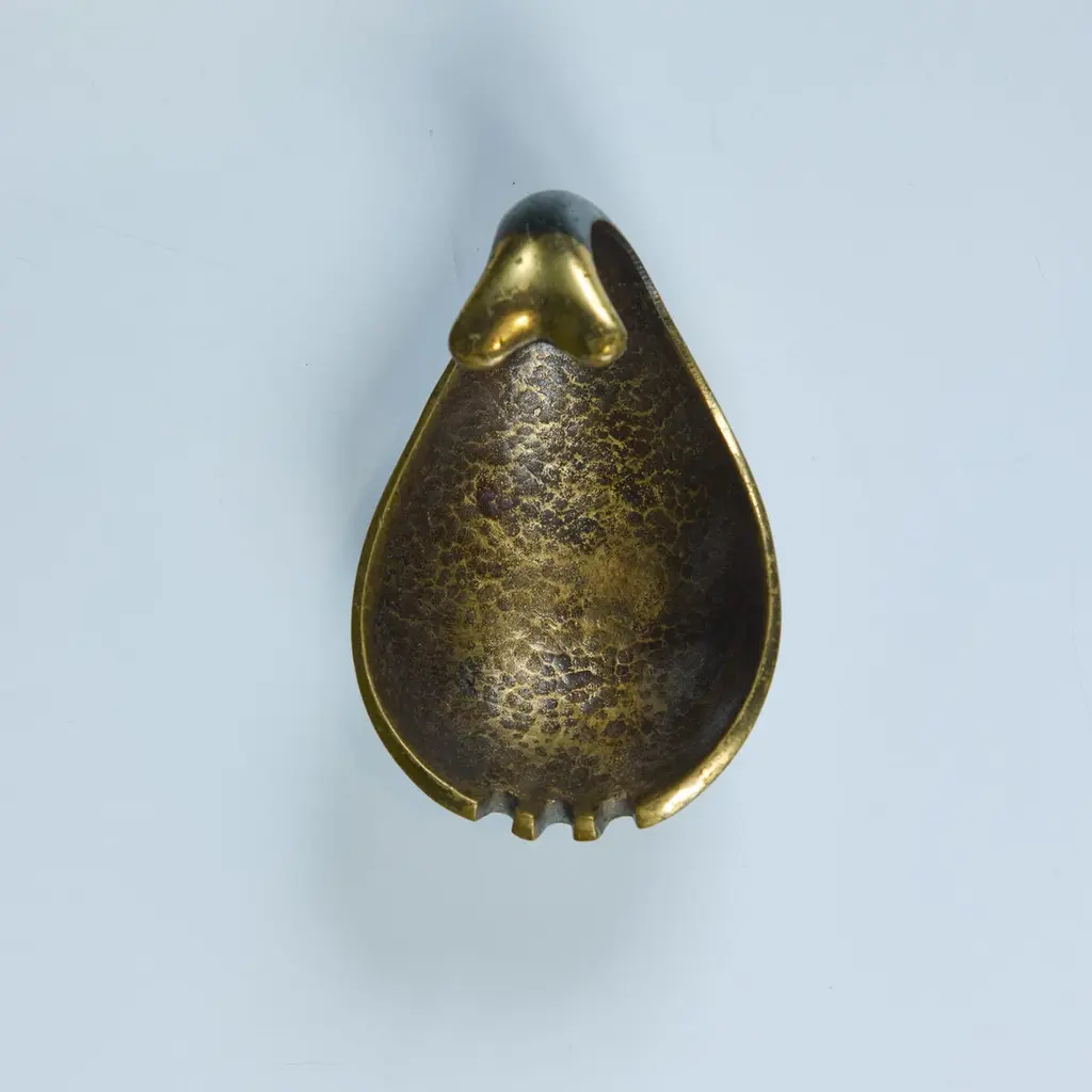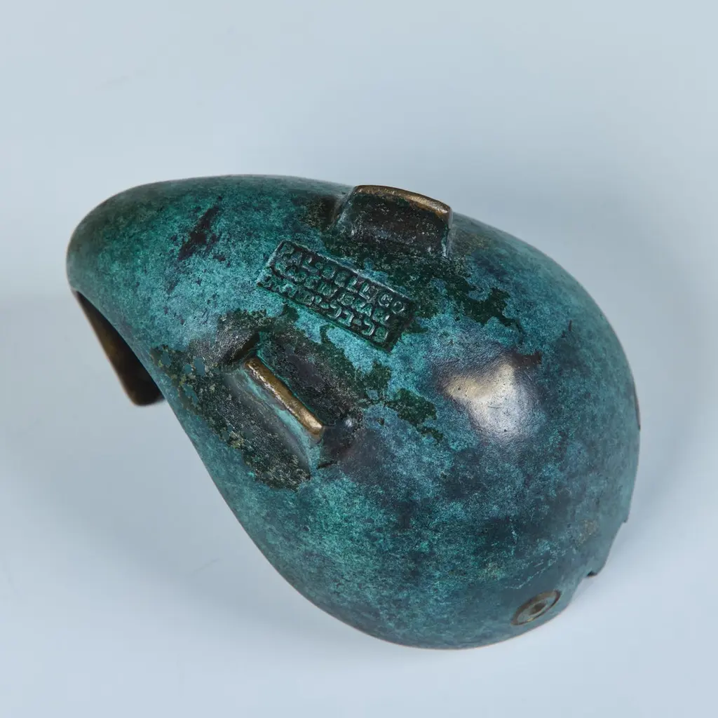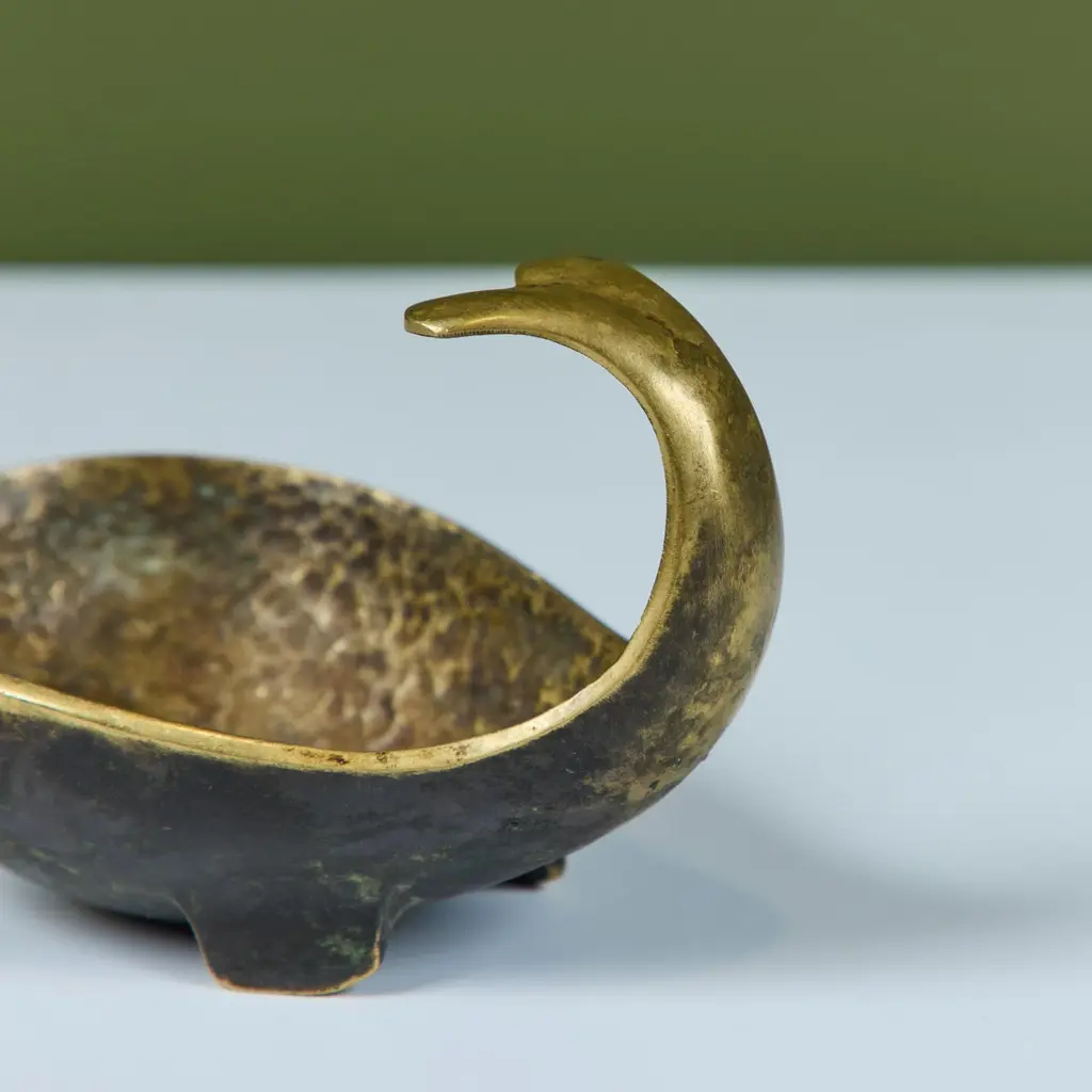 Bronze ashtray in the shape of a whale, with a curved tail and three grooves at the front of the piece. It has a hammered interior and a slight verdigris patina. An embossed stamp on the underside reads Pal-Bell Co. Made in Israel.Dimensions4.5” width x 3” depth x 3” height.ConditionGood vintage condition with age appropriate patina. Multiple available all with varying patina and coloring. Please inquire if you would like a specific coloration pictured.