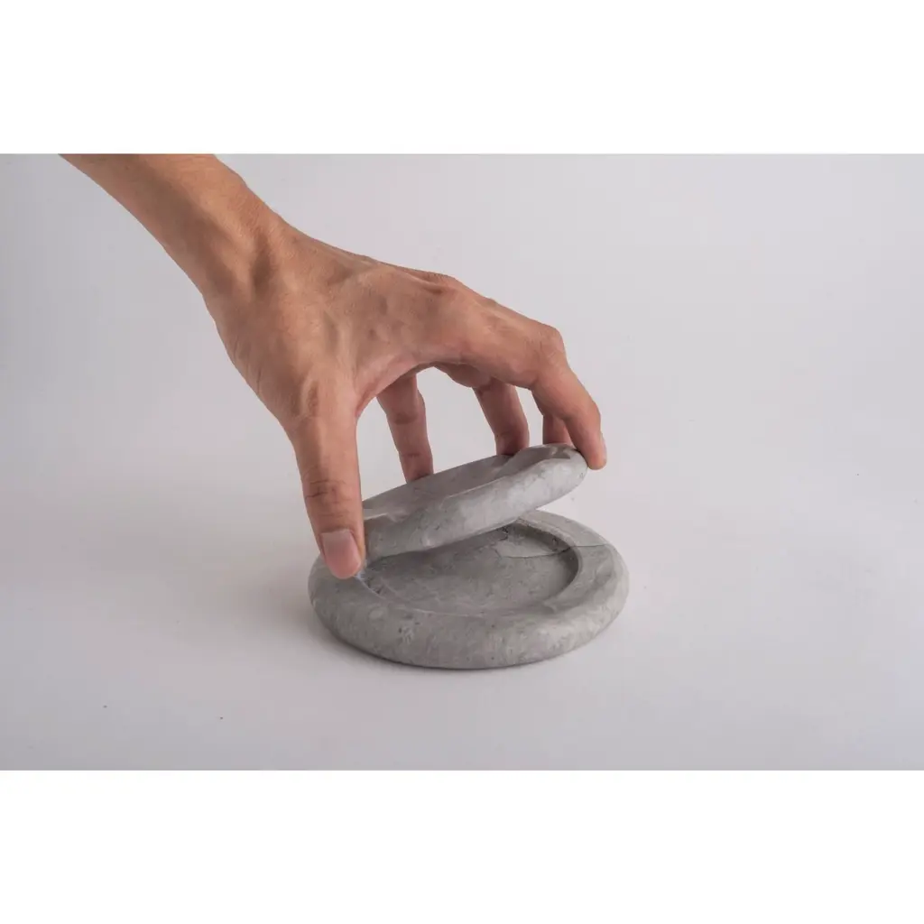 Two-piece ashtray, base and lid hand-carved in marble stone. It belongs to the Pebbles collection, distinguished and inspired by rounded, risky and modern shapes. Unique and beautiful.