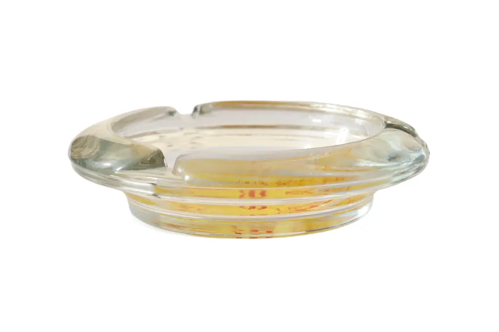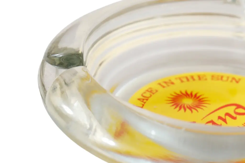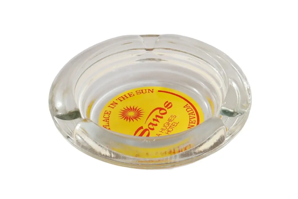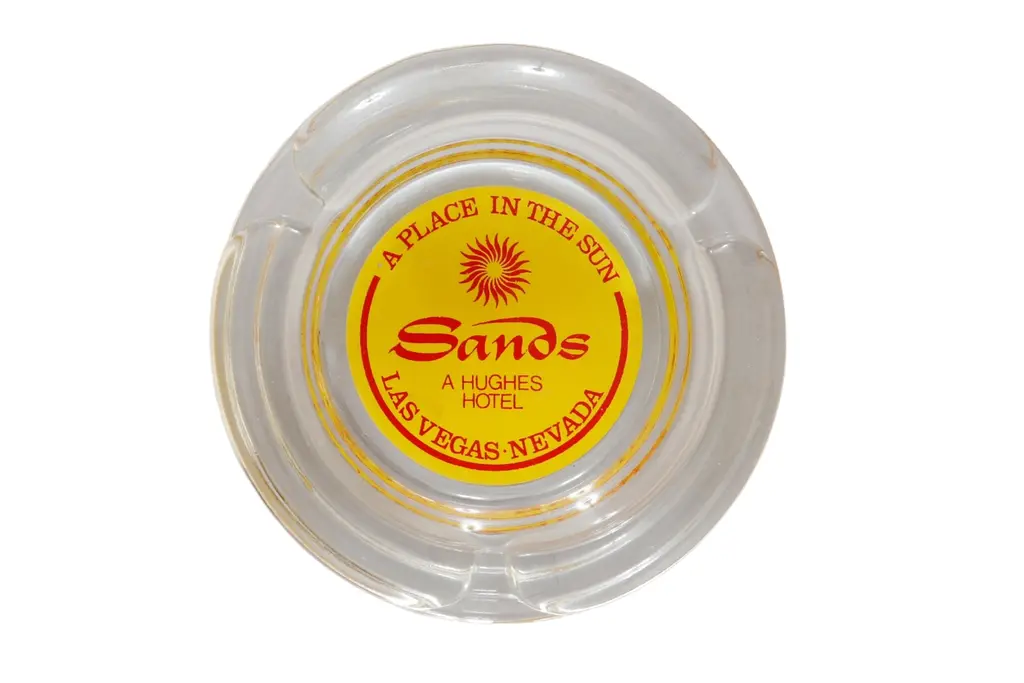 A clear glass ashtray from the Sands Hotel, in Las Vegas, Nevada. The center is printed with their logo in red text against yellow and reads “A Place In The Sun, Sands, A Hughes Hotel, Las Vegas, Nevada”.