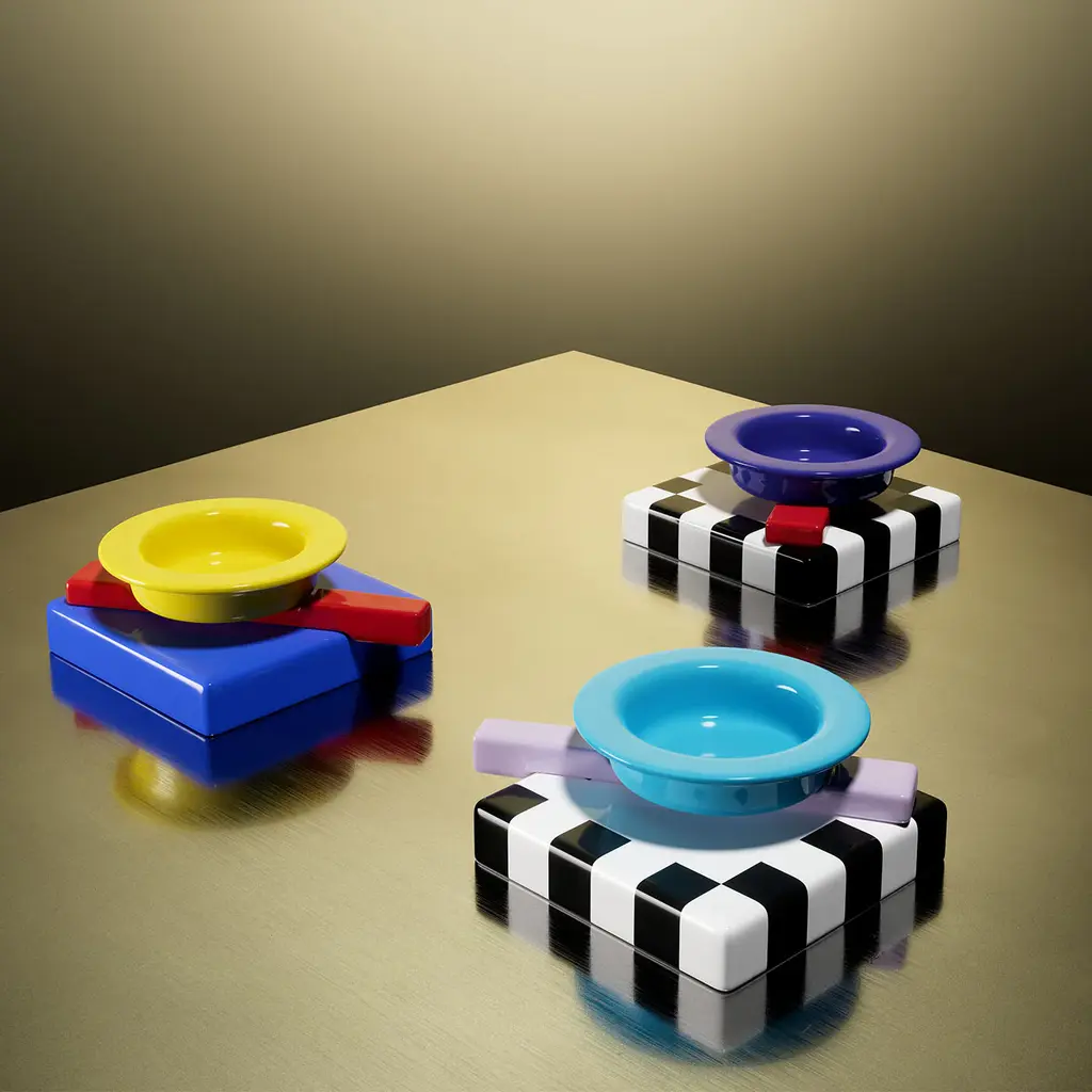Designed by Maria Sanchez, this striking ashtray was created in 1985 as one of the smallest pieces in the Memphis Milano Collection. True to the artistic movement's distinctive aesthetic, this piece combines three overlapping shapes, each marked by a different, vibrant color, imbuing any contemporary space with lively and dynamic flair. The bottom of this sculptural object of functional decor is signed by the designer.