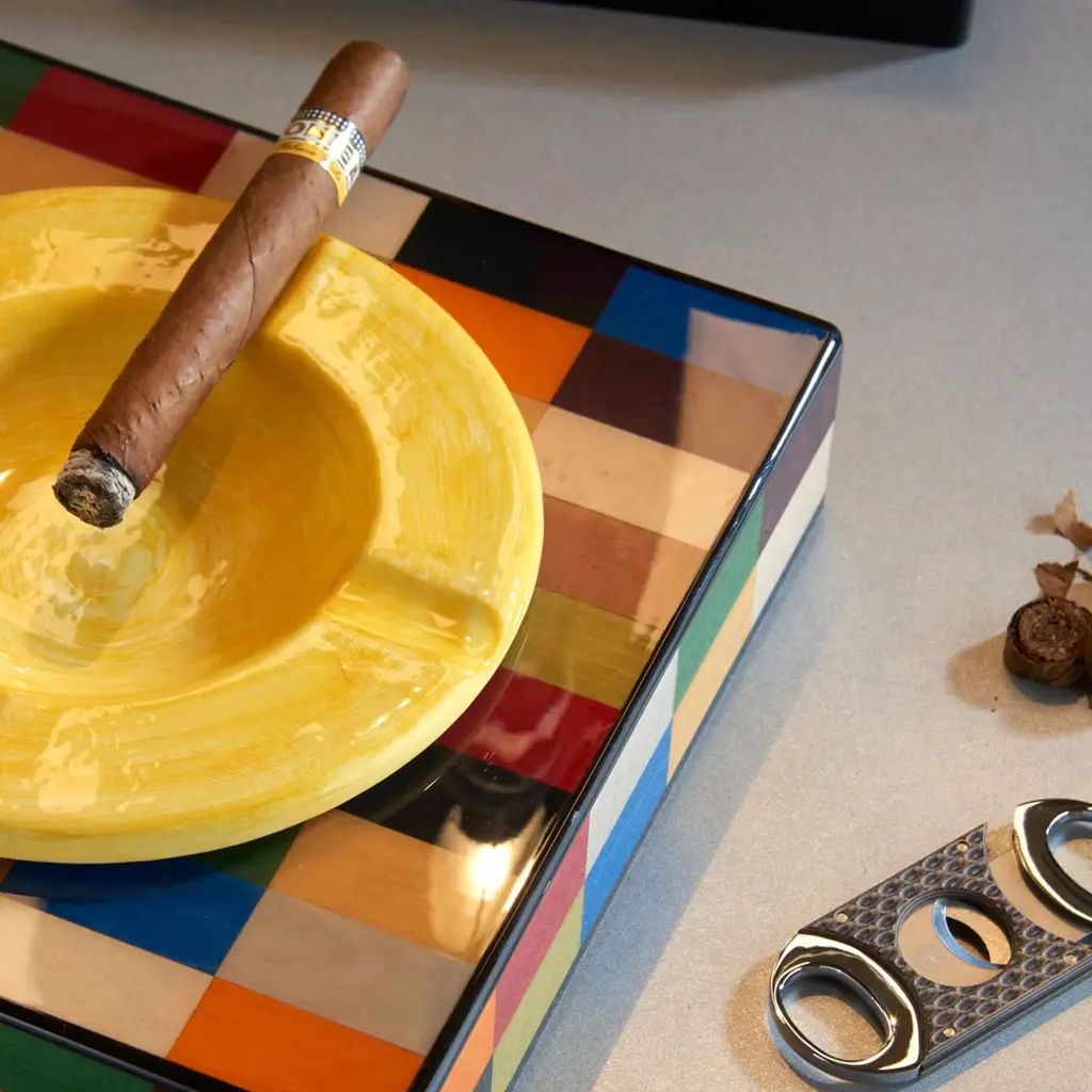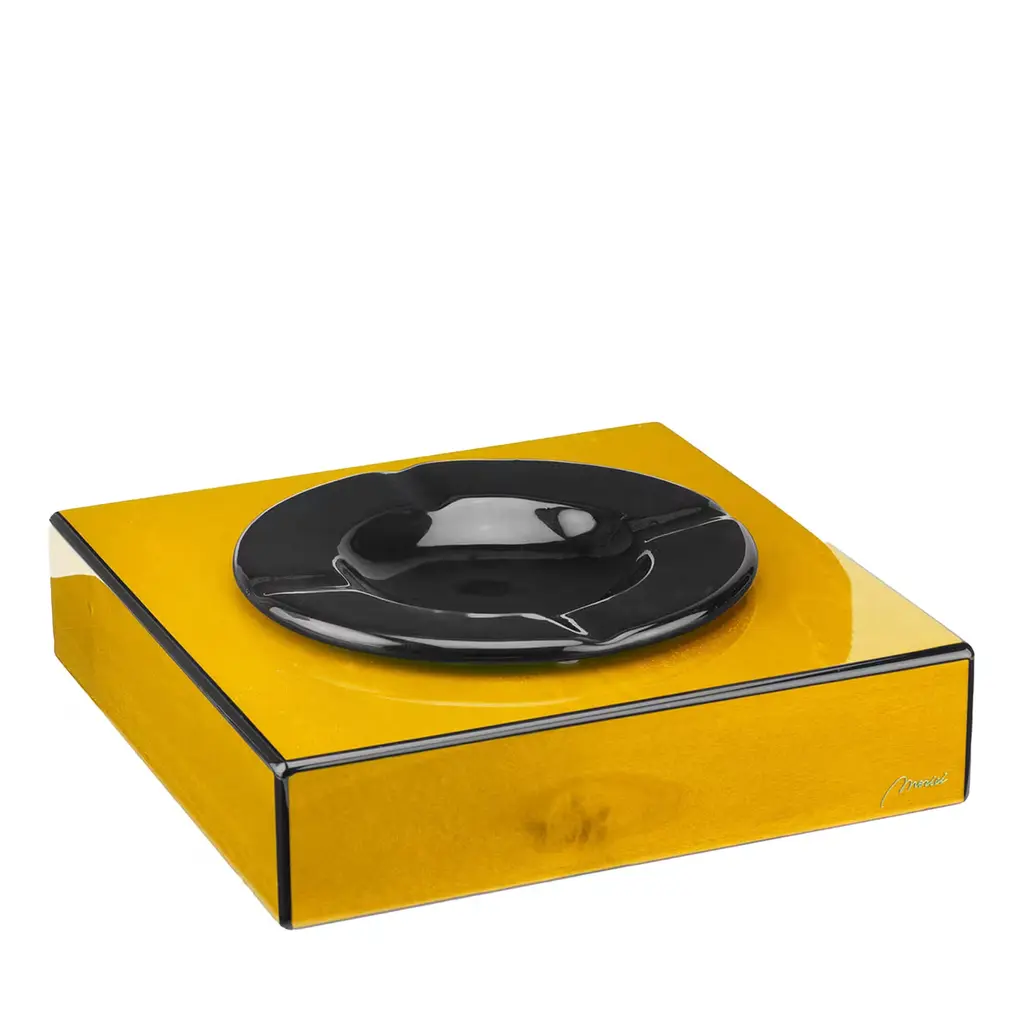 Simple and essential design meet function in this ordinary object transformed into a refined and sculptural objet d'art: a wood and ceramic ashtray splendidly crafted, painted and veneered by hand. Showcasing a vibrant yellow color, the round ceramic ashtray is enclosed in a square wooden frame boasting an inlay work of colorful rectangles polished and brushed for a bright effect.