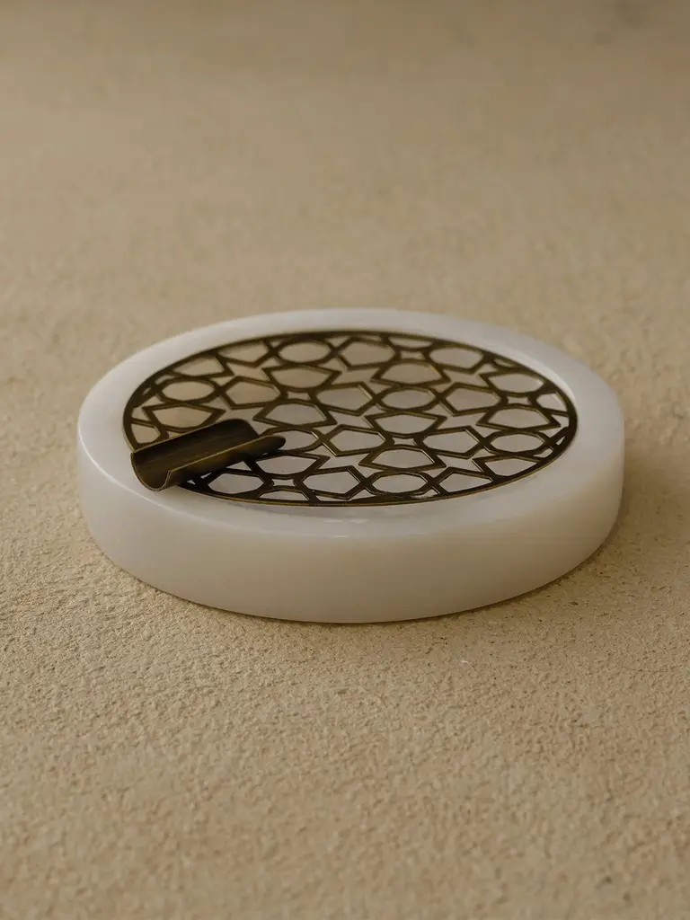 Where traditional artistry meets modern elegance, the White Marble & Brass Laser-Cut Ashtray is a statement of refined taste. The base, carved from smooth white marble, exudes purity and calm, while the intricate brass laser-cut lid draws inspiration from geometric and Middle Eastern motifs. Designed to impress, this piece transcends its practical purpose to become a decorative accent—perfect for luxury coffee tables, terraces, or as a unique gift for those who appreciate artisanal design. Both ornamental and functional, it’s a conversation starter in any setting.