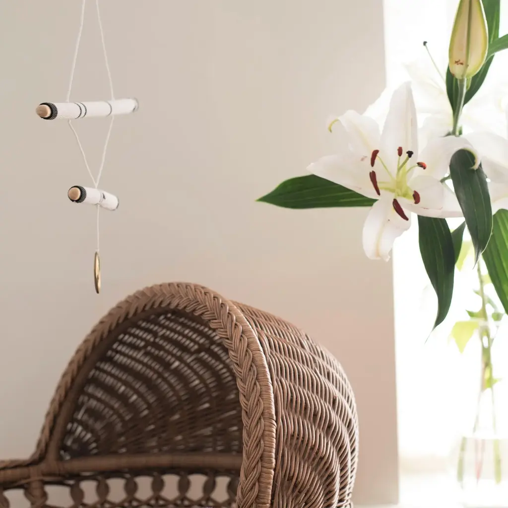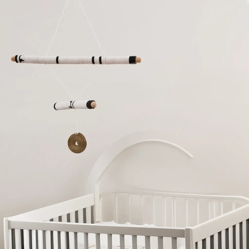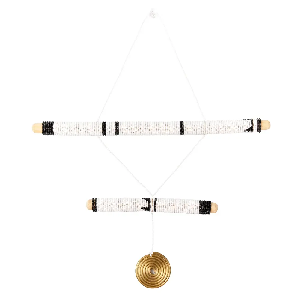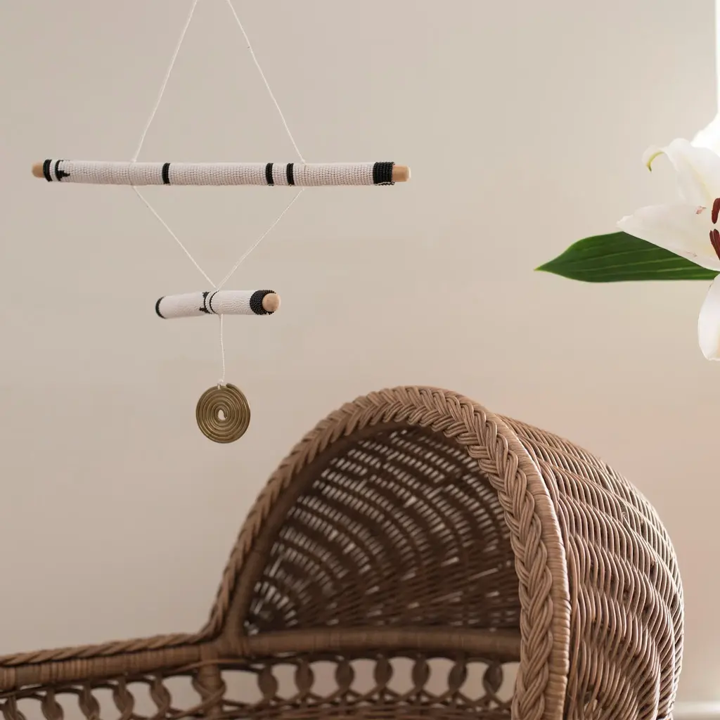 The Black and White Baby Mobile 2 Stick is created in Tanzania in a minimalist white and black design with a touch of metallic elegance. The bassinet mobile is made of wooden sticks that are wrapped with small glass beads. The baby mobile is accented with a brass coil. Place this hanging mobile art in a kids’ nursery alongside baby toys and modern decor.