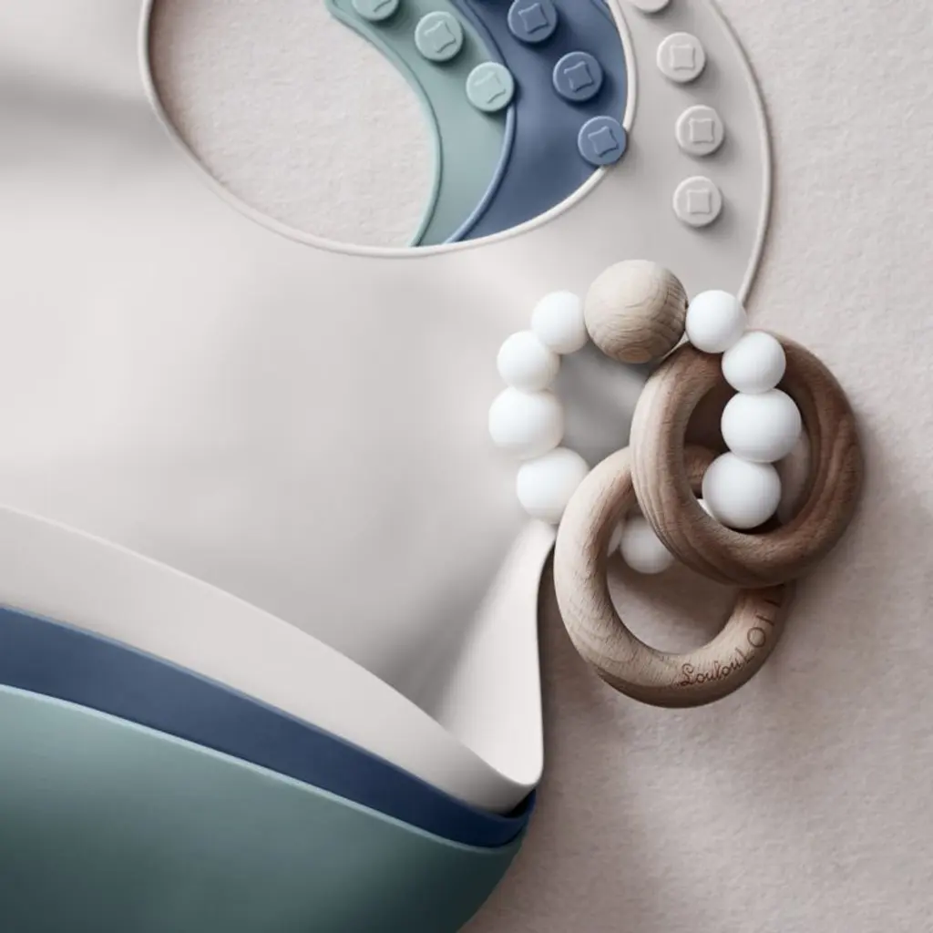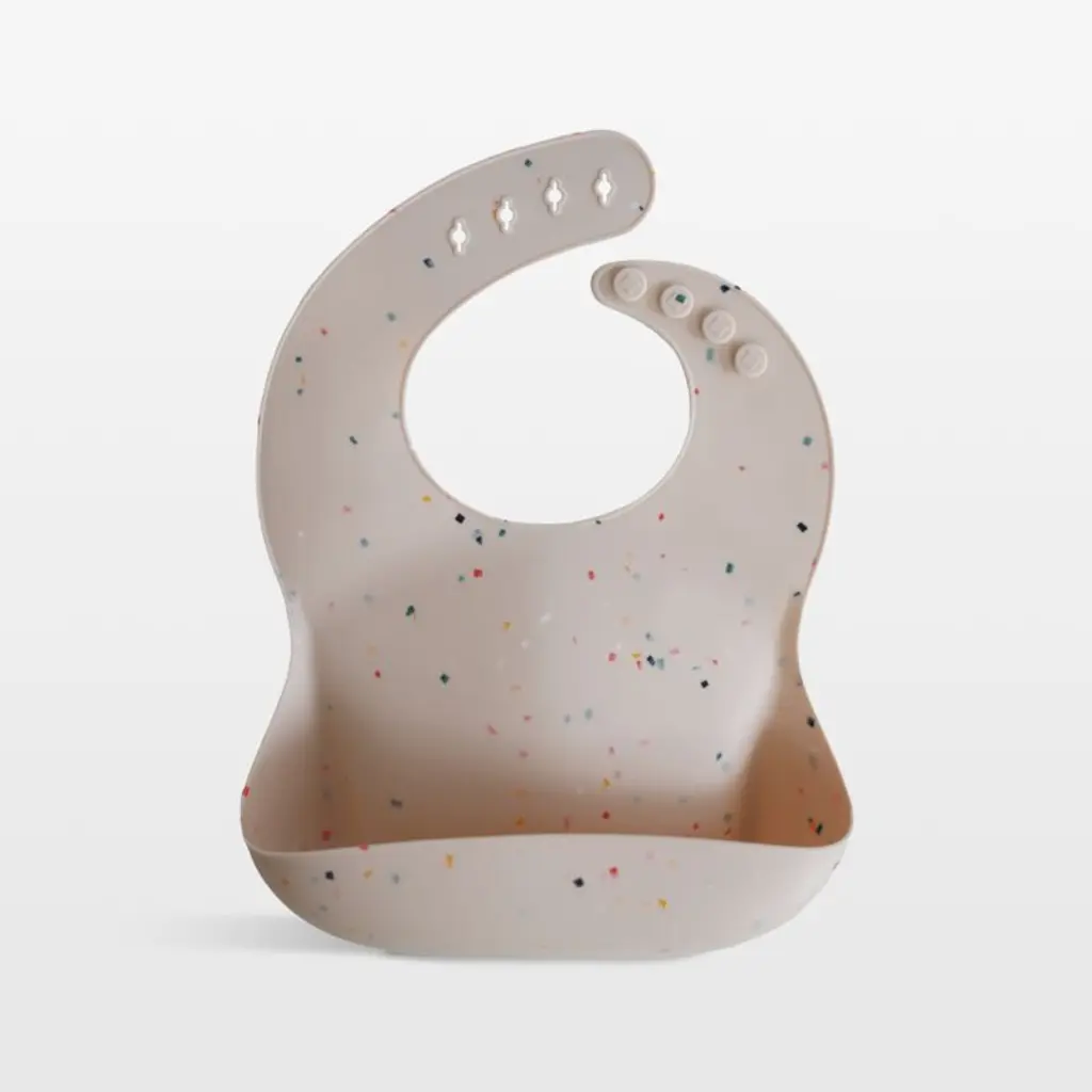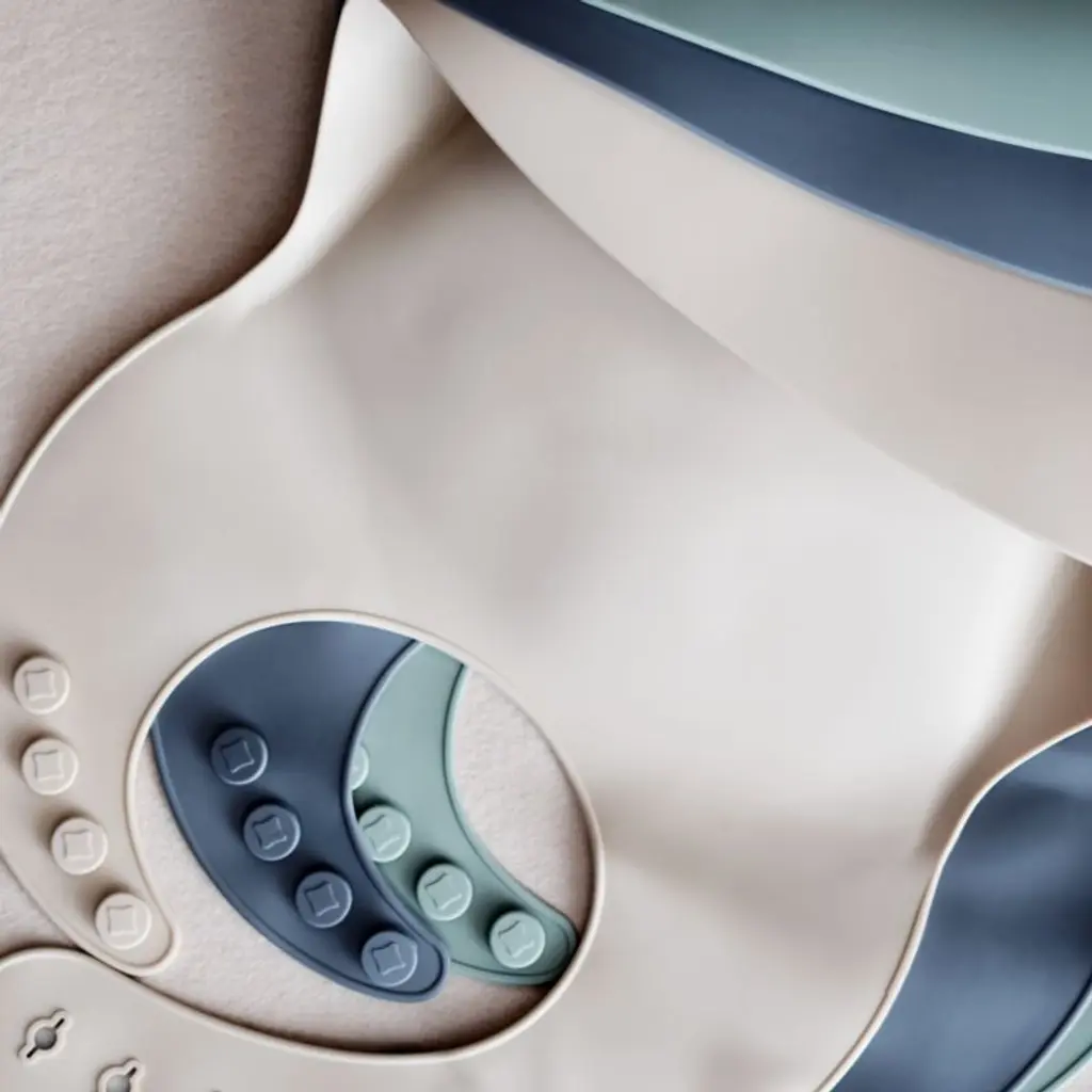 Dress for dinner. This silicone baby bib keeps the littlest gourmandsand your furniture and floorclean and dry as they master their dining skills. Made of food-grade silicone that resists stains and repels liquids, the stylishly simple bib curves into a deep pocket that catches crumbs, spills and more. The modern bib in creamy green fits snugly thanks to adjustable neck fasteners and cleans up easily with a quick wash after snack time and meals.
