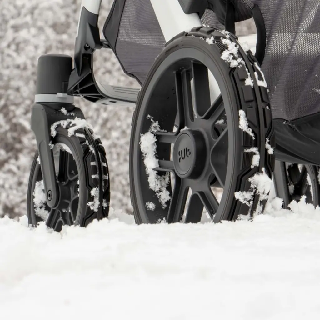 These innovative wheels turn your UPPAbaby® Vista or V2 stroller into an all-terrain vehicle capable of navigating over cobblestones, cracked sidewalks and even snow with ease. The rugged, never-flat tires cushion the ride and feature deep grooves for a strong grip on rough terrain. They swap out for your regular wheels in seconds, no tools (or mechanic skills) needed.