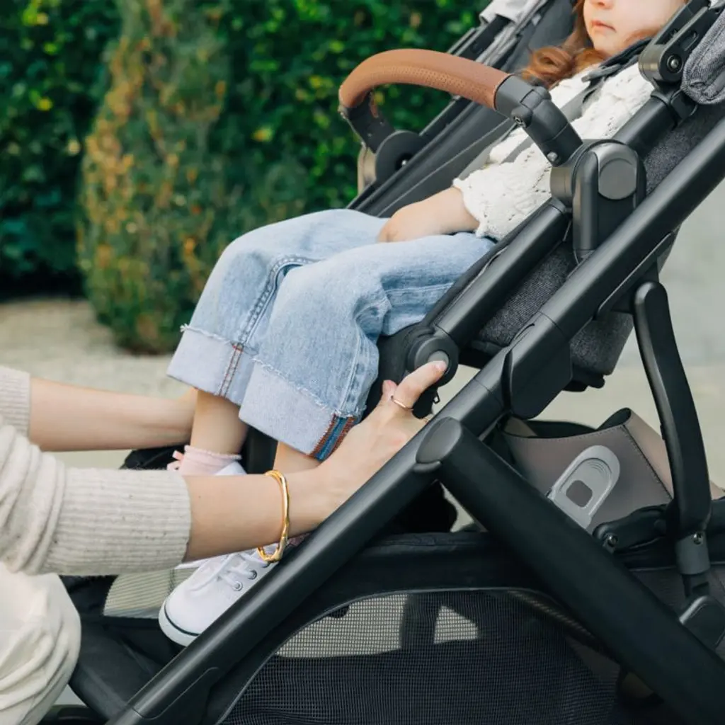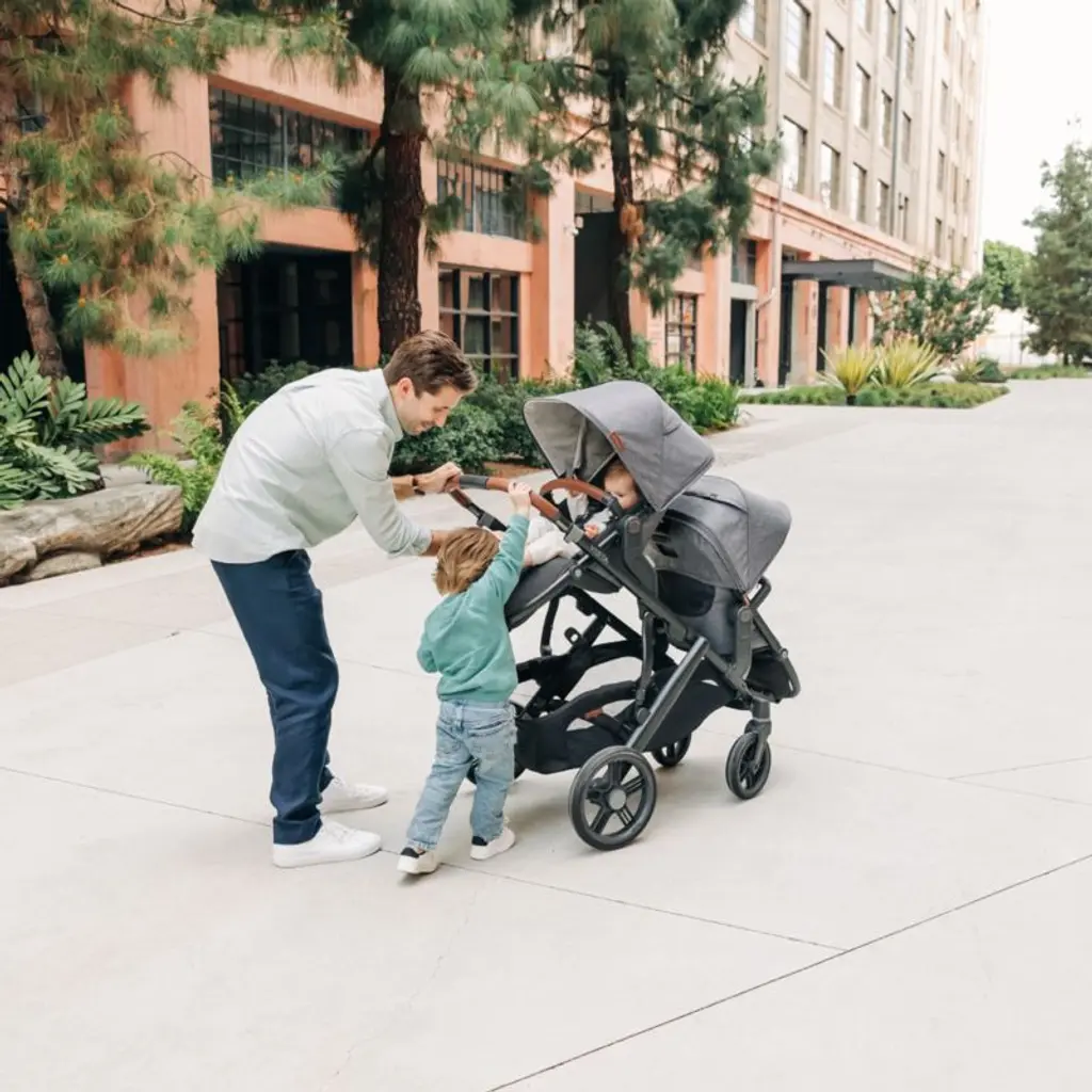 As your family grows, this game-changing stroller does too. The Vista starts out as a single ride, usable from birth with the addition of an UPPAbaby® bassinet or car seat (sold separately; no adapter needed). As your child gets older and maybe even welcomes new siblings, the stroller can be reconfigured in more than 30 ways and can accommodate up to 3 kids (with additional accessories). In every iteration, the Vista delivers a smooth and comfy ride, thanks to never-flat tires, an adjustable footrest, multi-position recline, an extendable UPF 50+ canopy and mesh panels for ventilation. The leather trim and stylish charcoal melange fabric are durable and have timeless appeal, too.