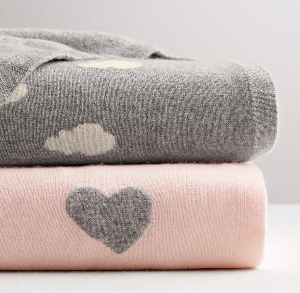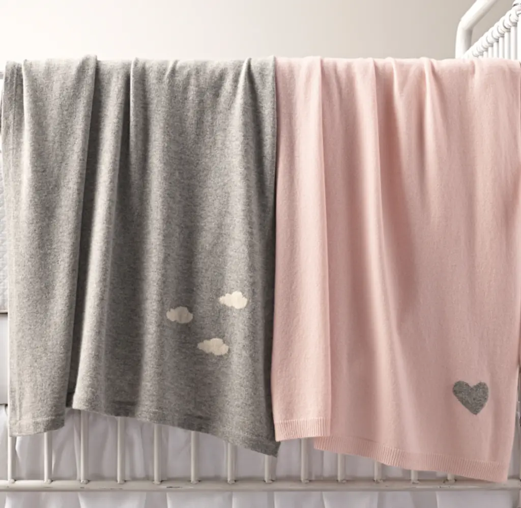 Woven from the most coveted of natural fibers, our cashmere stroller blanket cradles baby in lightweight luxury. Accented with a heart or cloud design, it's as charming as it is sumptuously soft.
