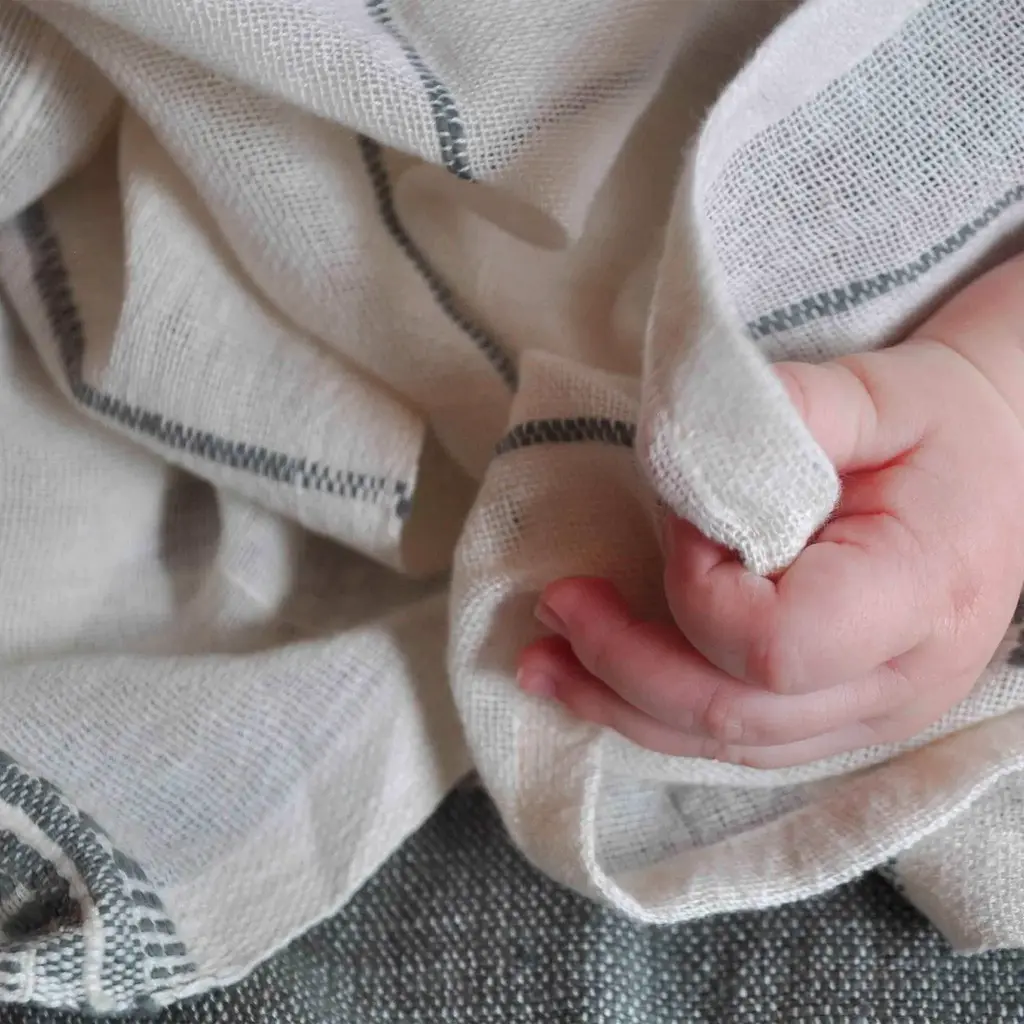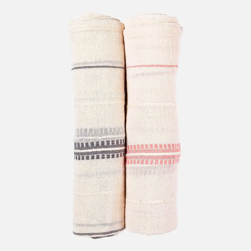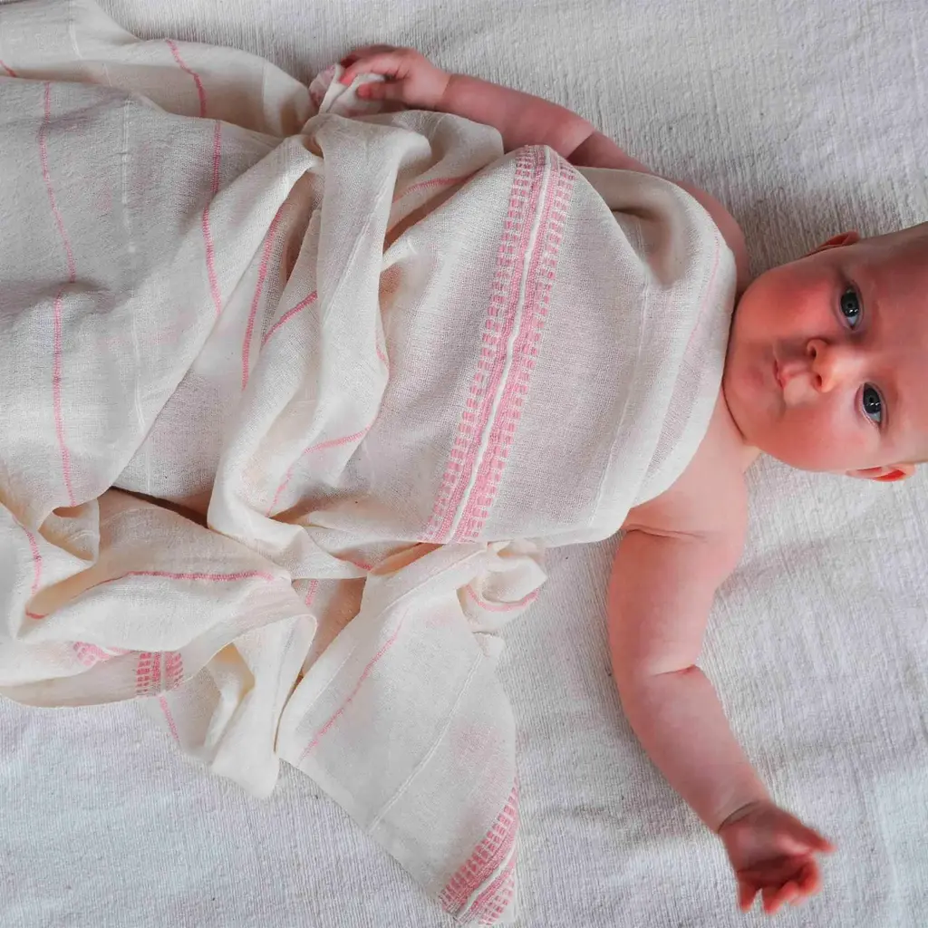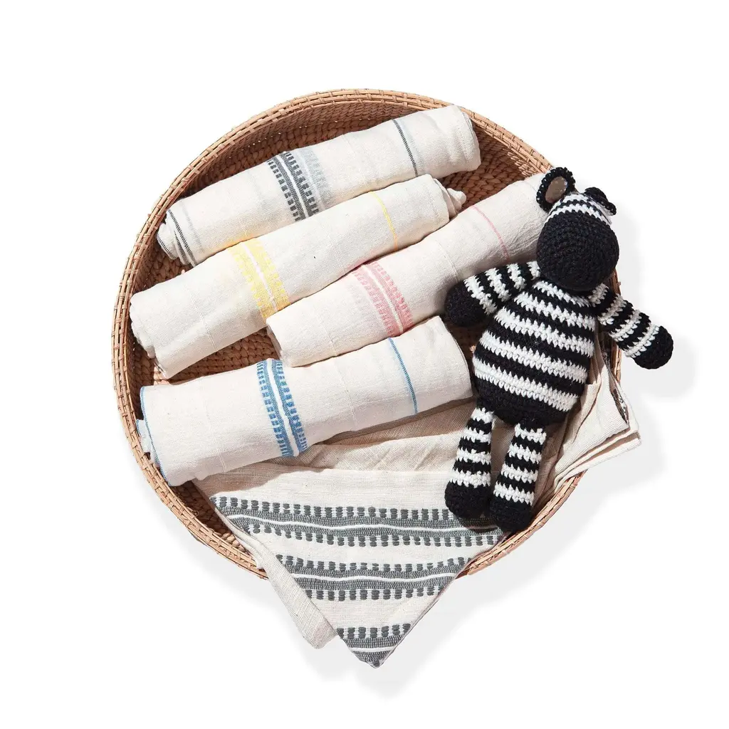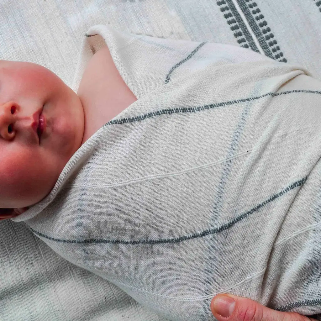 The Lali Swaddle Set of 2 is handmade in Ethiopia from locally sourced Ethiopian cotton. Wrap your newborn up with this baby security blanket or use it as a stroller blanket for added warmth. This contemporary infant swaddle is luxuriously soft for the baby. The swaddle set comes in a set of two including one gray and one pink swaddle.