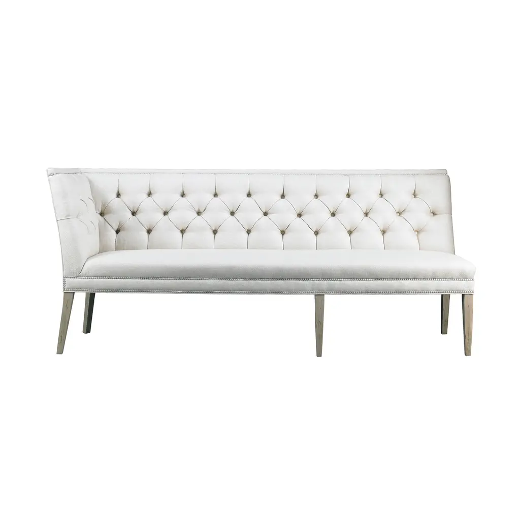 Meet the Armand Corner Banquette, a seamless fusion of classic allure and contemporary coziness. This exquisite furniture piece is a fantastic addition to any breakfast nook or refined dining area, boasting a sumptuous diamond button tufted back and sophisticated nail trim accents. You can select either a left or right arm configuration to perfectly complement your space. The Armand Armless Banquette beckons you to unwind and savor your meals in elegance, thanks to its timeless design and plush padding. The Armand collection also includes an armless banquette (sold separately). Ships In 8-10 Weeks Diamond button tufted back Tight seat As Shown Fabric: Chiswell Linen As Shown Finish: Mineral If you choose to purchase COM, once you have placed your order a customer service rep will contact you regarding where to send your fabric. Please note that current lead time is 17-19 weeks once your fabric arrives at the factory, and if unused fabric is under 1.5 yards, it cannot be sent back to you.This product can be special ordered in additional fabrics, leathers, finishes, and cushion fillings. Click here to email us for for additional information about special ordering.This image is for illustrative purposes only. The colors shown are accurate within the constraints of lighting, photography, and the color accuracy of your screen.