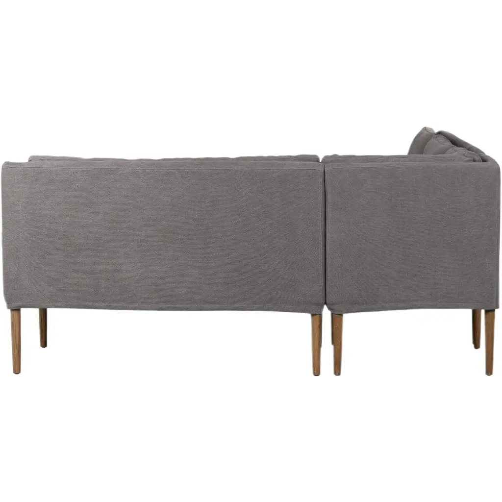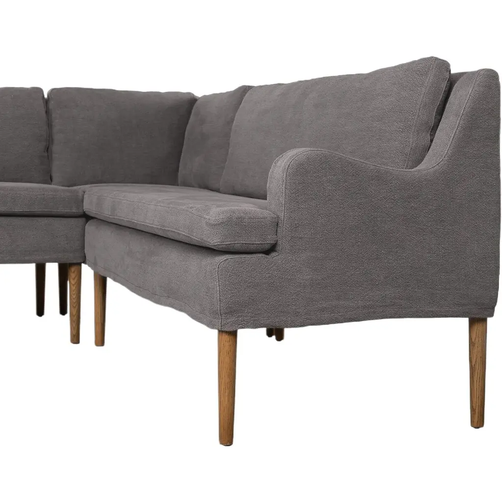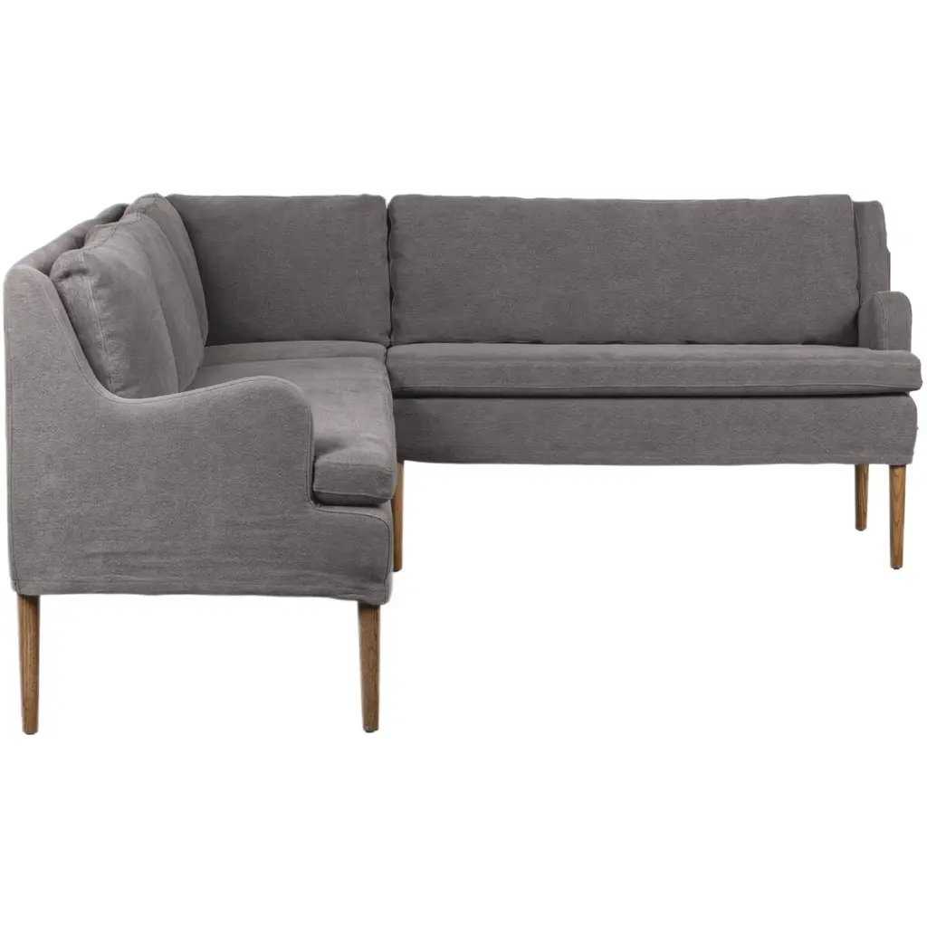 Heritage-inspired comfort. Sloping track arms are a study in playful forms, while the banquette frame's fluid shape creates a simple, polished look. Tapered legs extend beyond a short skirt for a more relaxed style. Covered in 100% linen. A design collaboration by Amber Lewis and Four Hands.