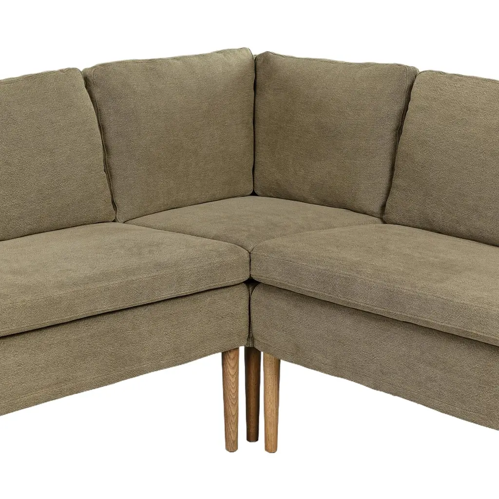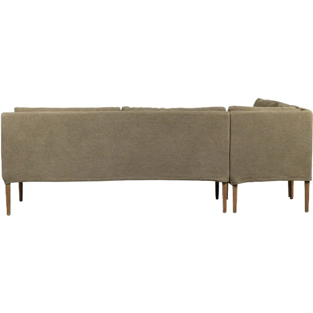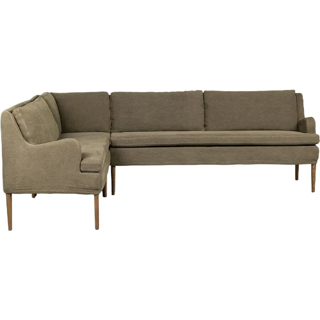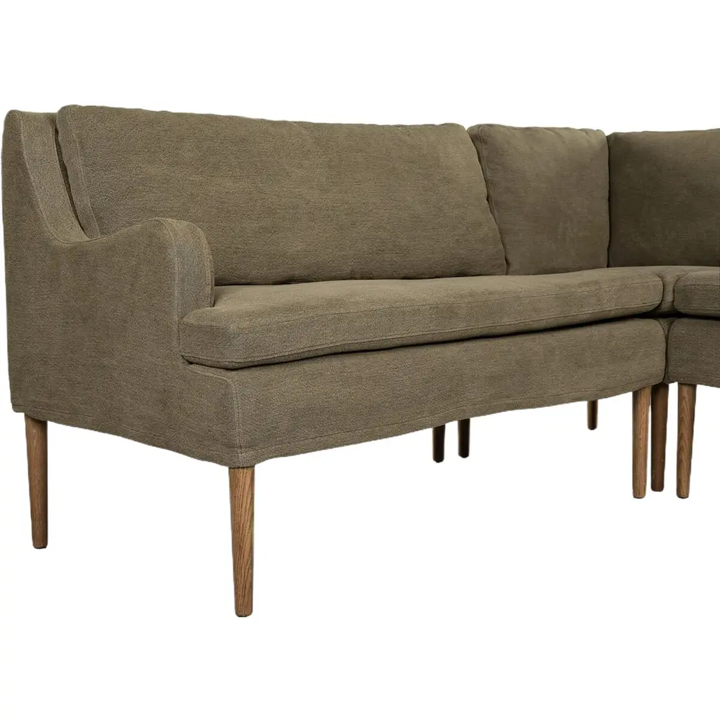 Heritage-inspired comfort. Sloping track arms are a study in playful forms, while the banquette frame's fluid shape creates a simple, polished look. Tapered legs extend beyond a short skirt for a more relaxed style. Covered in 100% linen. A design collaboration by Amber Lewis and Four Hands.