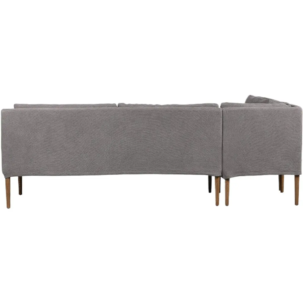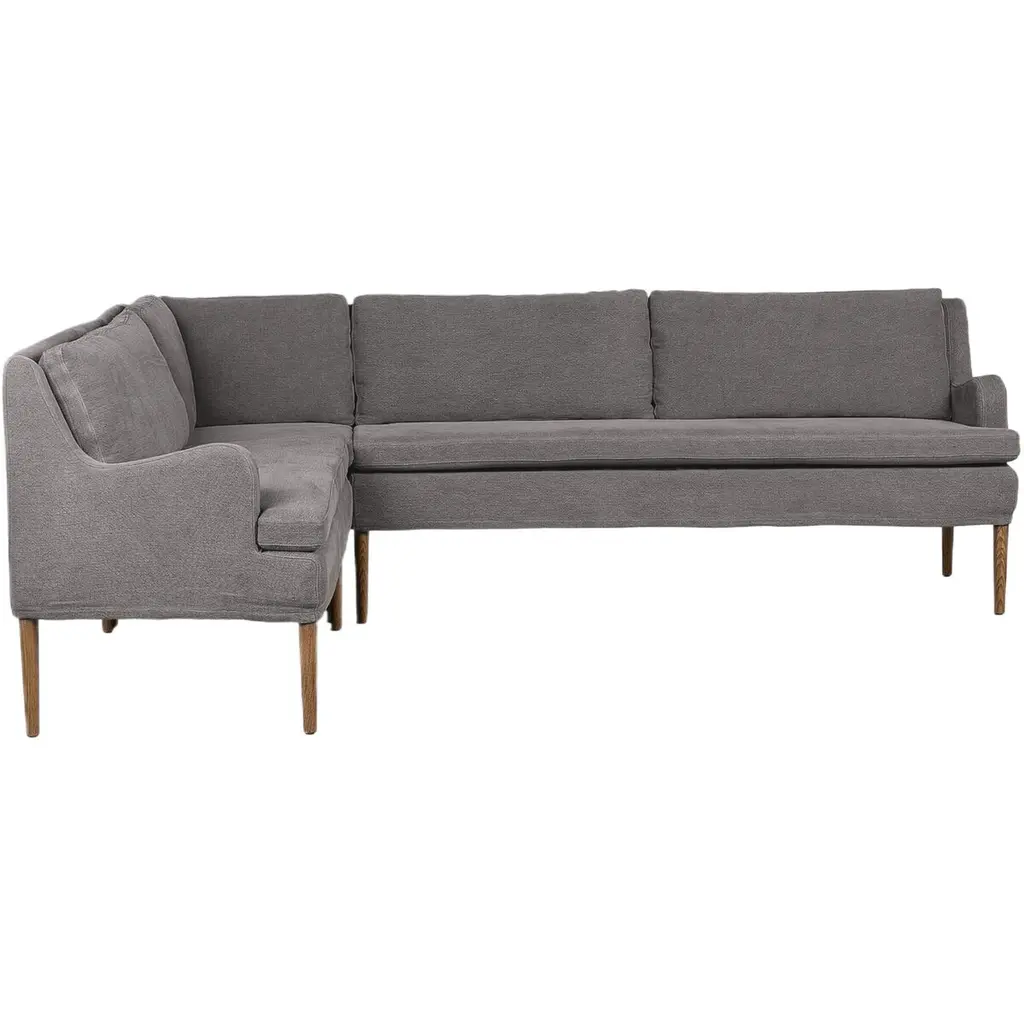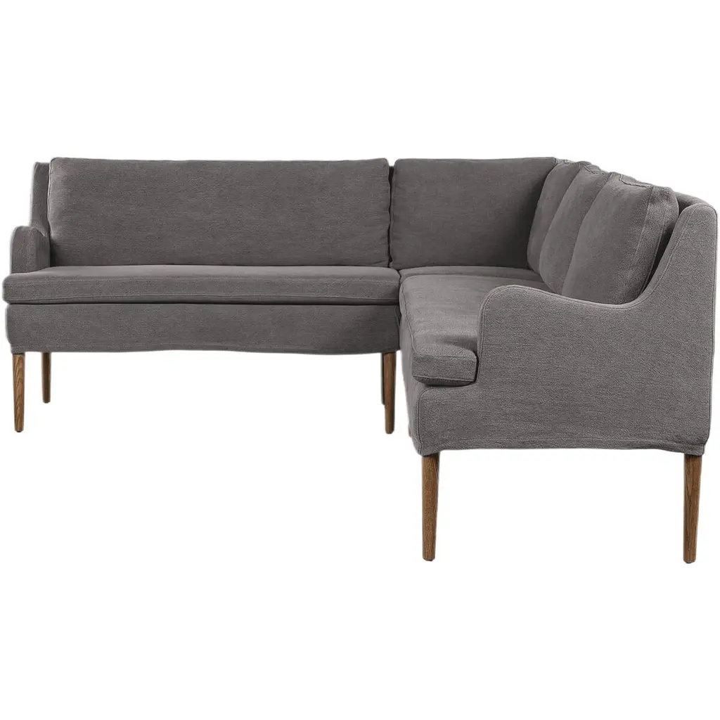 Heritage-inspired comfort. Sloping track arms are a study in playful forms, while the banquette frame's fluid shape creates a simple, polished look. Tapered legs extend beyond a short skirt for a more relaxed style. Covered in 100% linen. A design collaboration by Amber Lewis and Four Hands.