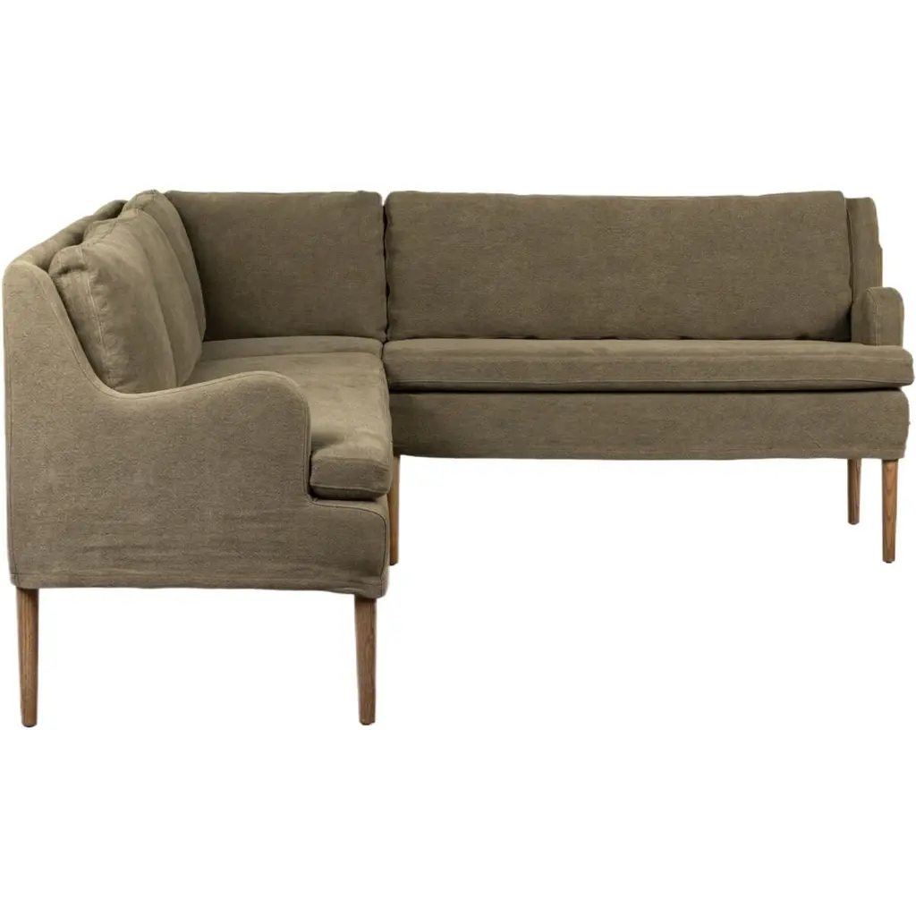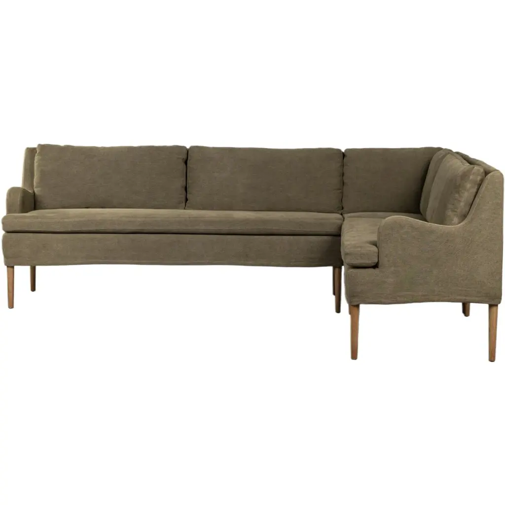 Heritage-inspired comfort. Sloping track arms are a study in playful forms, while the banquette frame's fluid shape creates a simple, polished look. Tapered legs extend beyond a short skirt for a more relaxed style. Covered in 100% linen. A design collaboration by Amber Lewis and Four Hands.