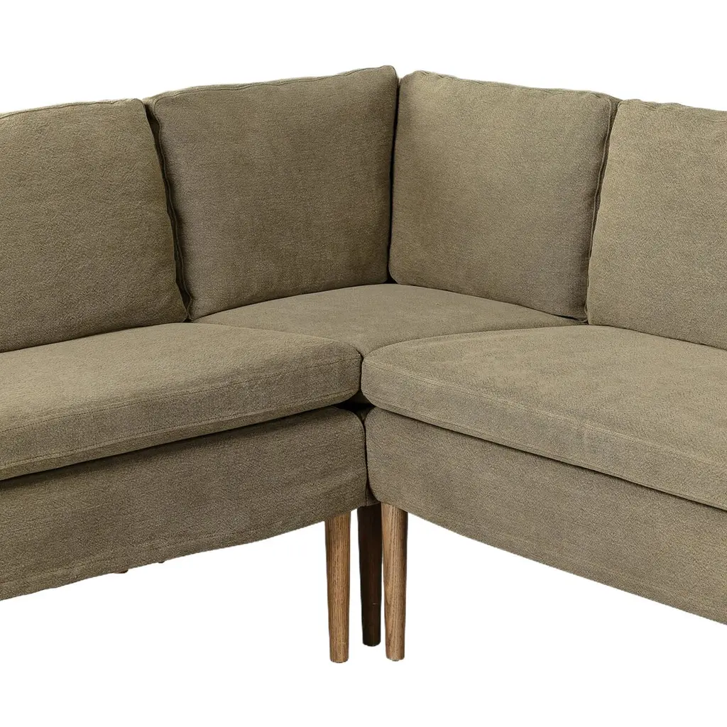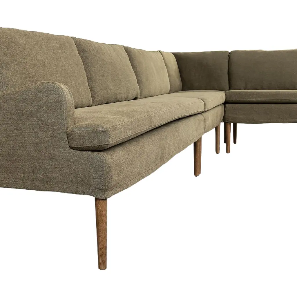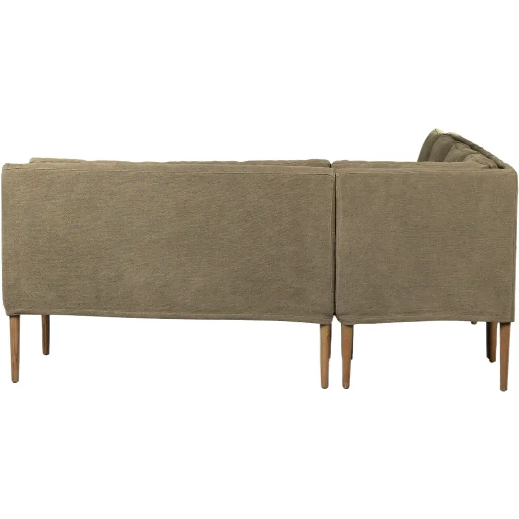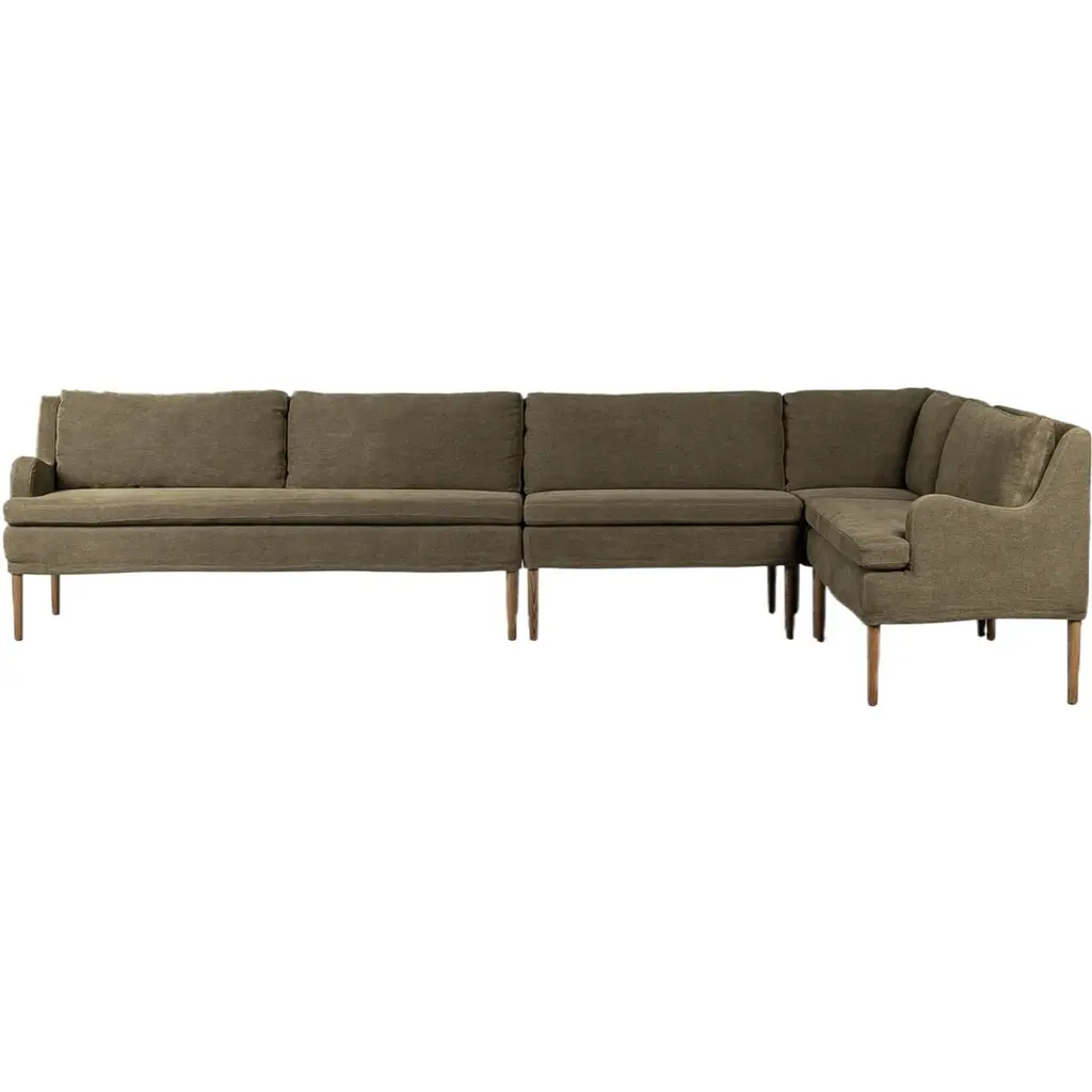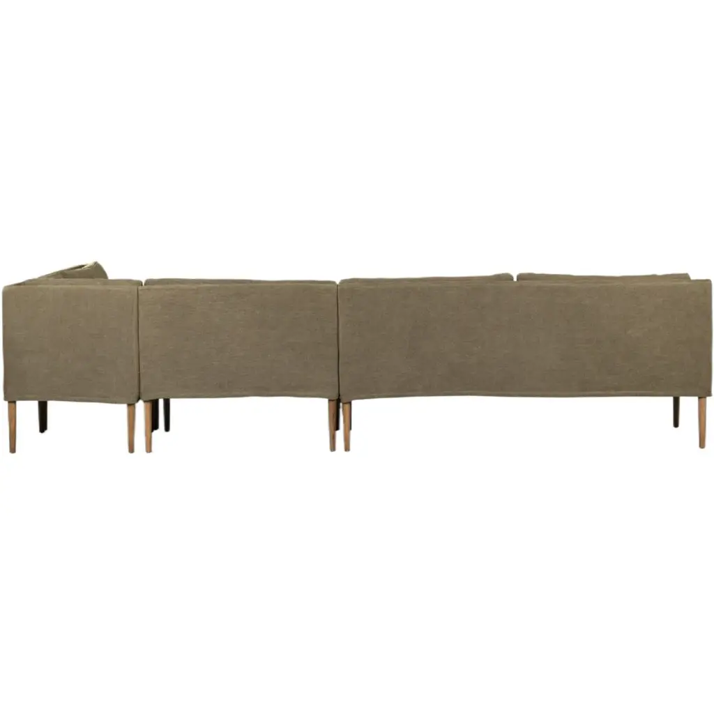 Heritage-inspired comfort. Sloping track arms are a study in playful forms, while the banquette frame's fluid shape creates a simple, polished look. Tapered legs extend beyond a short skirt for a more relaxed style. Covered in 100% linen. A design collaboration by Amber Lewis and Four Hands.