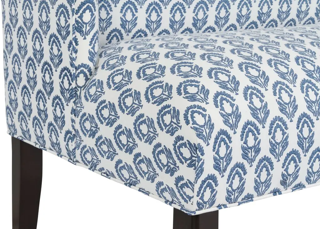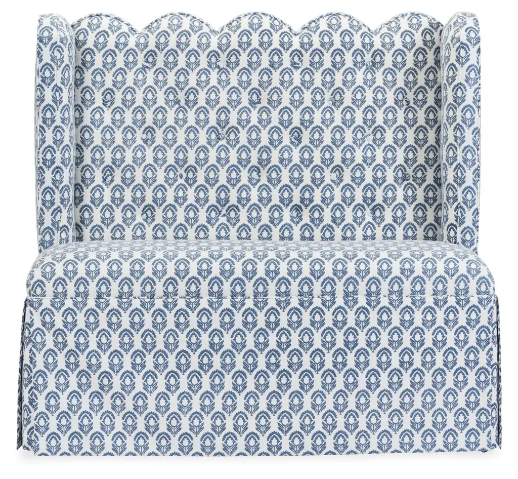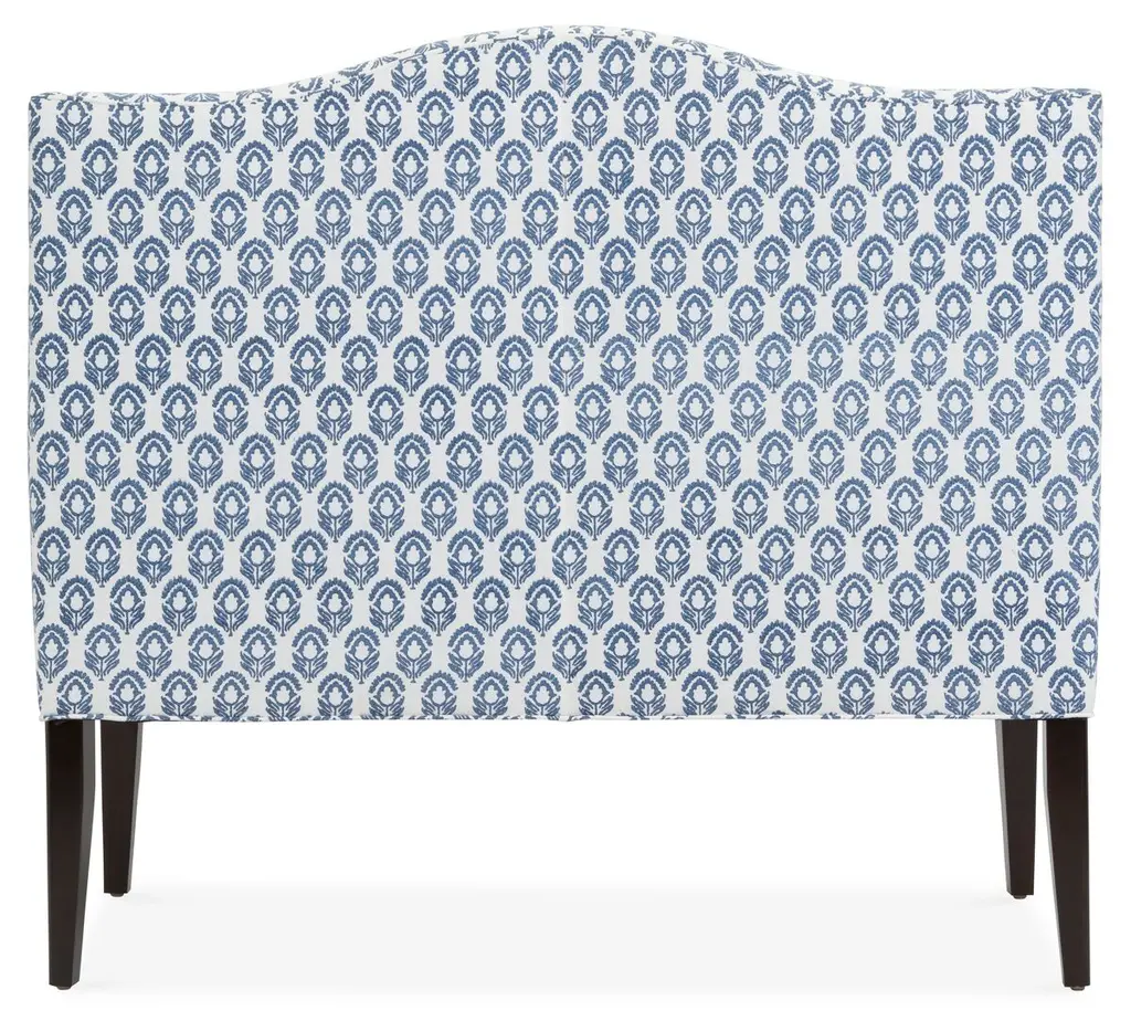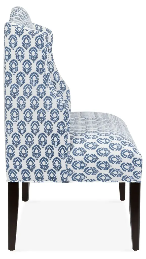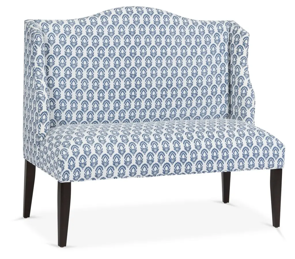 Designed by us and available only at One Kings Lane: A modern take on the classic banquette, this piece features a camelback silhouette upholstered in midnight-blue velvet with winged side panels and exposed, tapered legs. Ideal for a breakfast nook but right at home in the dining room, this piece is filled with foam for a comfortable seat wherever it's placed.One Kings Lane brings you a line of handcrafted, made-to-order furnishings and decor designed by us and available only here. In keeping with our distinctive aesthetic, the pieces range from classic to contemporary and are available in a gorgeous variety of handpicked fabrics, finishes, and hardware.
