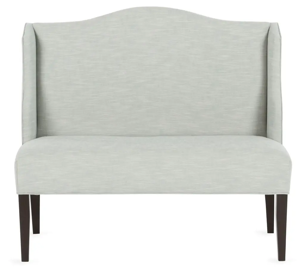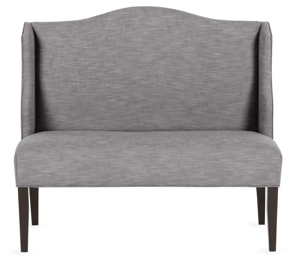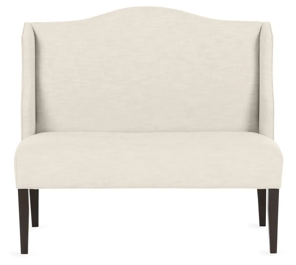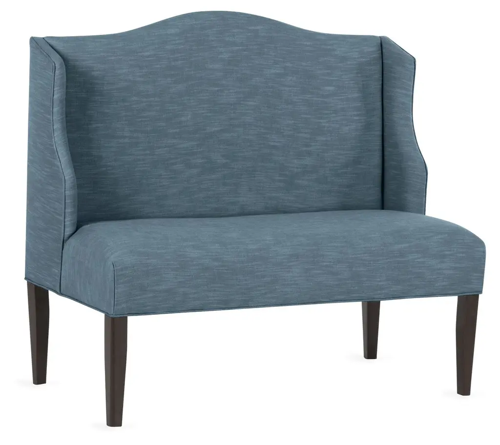 Designed by us and available only at One Kings Lane: A modern take on the classic banquette, this piece features a camelback silhouette upholstered in midnight-blue velvet with winged side panels and exposed, tapered legs. Ideal for a breakfast nook but right at home in the dining room, this piece is filled with foam for a comfortable seat wherever it's placed.One Kings Lane brings you a line of handcrafted, made-to-order furnishings and decor designed by us and available only here. In keeping with our distinctive aesthetic, the pieces range from classic to contemporary and are available in a gorgeous variety of handpicked fabrics, finishes, and hardware.