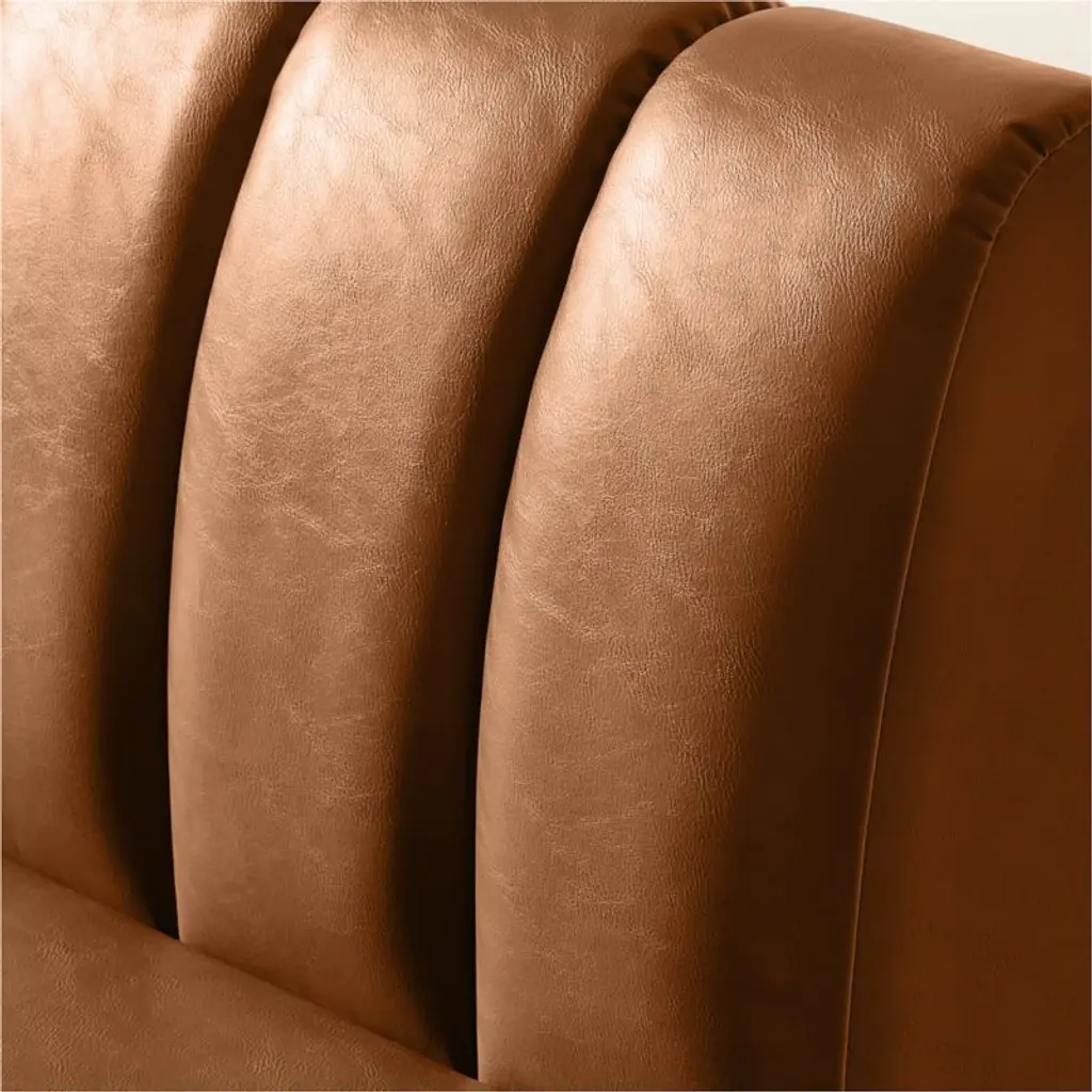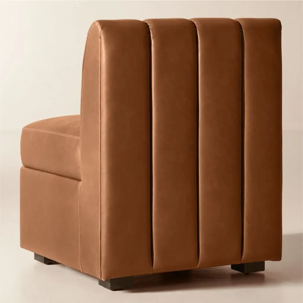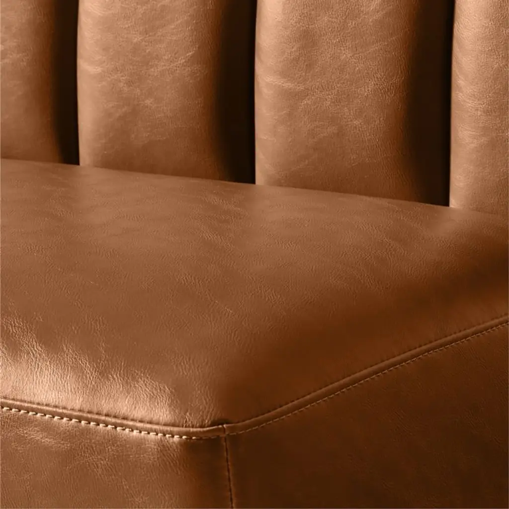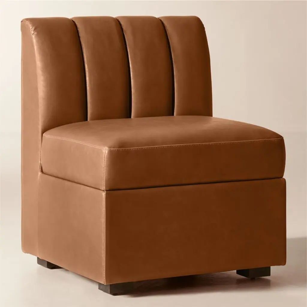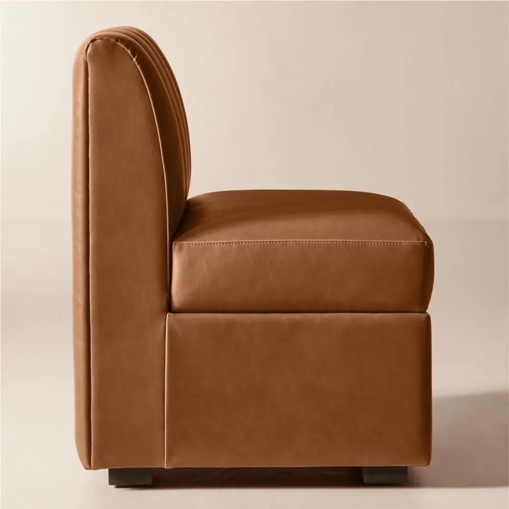 Defined by clean lines and thoughtful proportions, dining banquette by Mermelada Estudio brings sculptural presence to the dining space. Vertical channel tufting adds depth to the backrest, while the streamlined form is equally suited to wall placement or open floor plans. Upholstered in brown bonded leather, it offers a smooth, durable surface that's easy to care for. Solid red oak legs, certified sustainable by the Forest Stewardship Council (FSC), are finished in a warm mid-tone stain to ground the piece with natural character. Pieces from the Duncan collection are available individually or in multiples to create a custom banquette configuration. CB2 exclusive.