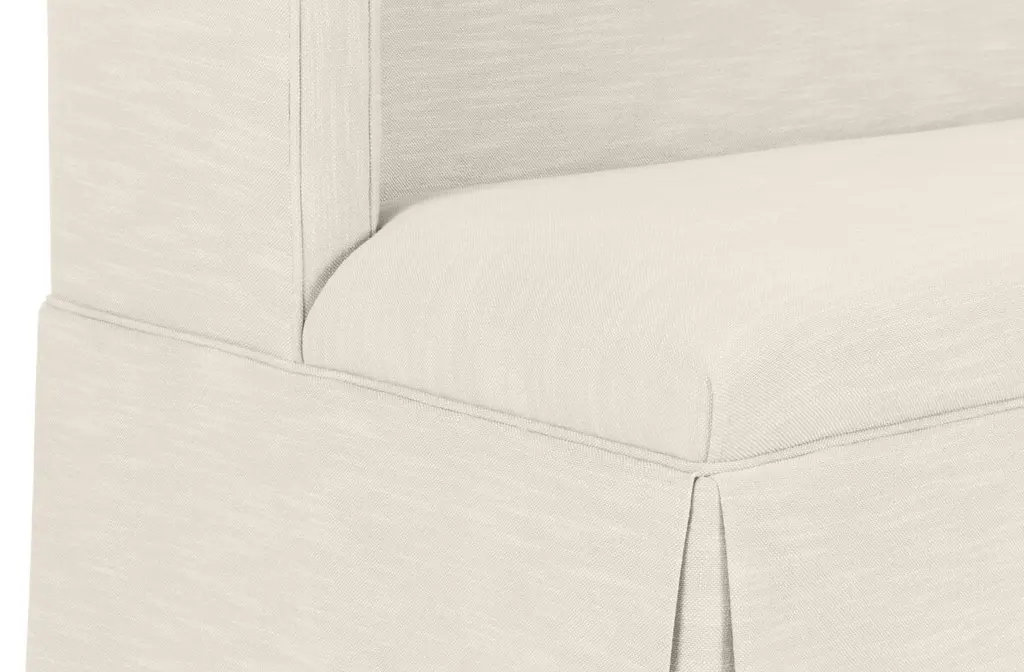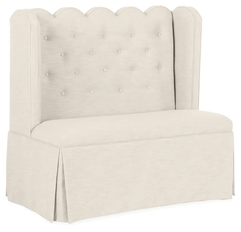 Designed by us and available only at One Kings Lane: A modern take on the classic banquette, this piece features a wingback silhouette fully upholstered in flamingo-pink velvet with button tufting and a skirted apron with pleated corners. Ideal for a breakfast nook but right at home in the dining room, this piece is filled with foam for a comfortable seat wherever it's placed.One Kings Lane brings you a line of handcrafted, made-to-order furnishings and decor designed by us and available only here. In keeping with our distinctive aesthetic, the pieces range from classic to contemporary and are available in a gorgeous variety of handpicked fabrics, finishes, and hardware.