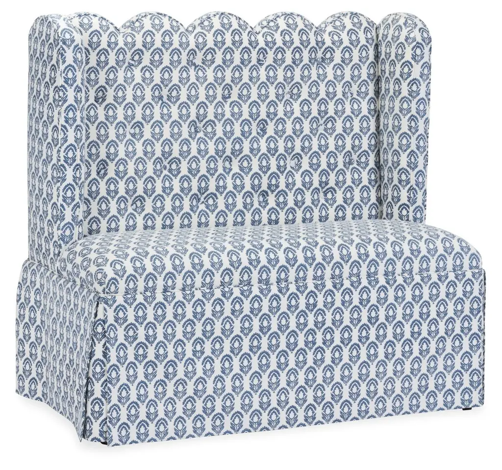 Designed by us and available only at One Kings Lane: A modern take on the classic banquette, this piece features a wingback silhouette fully upholstered in flamingo-pink velvet with button tufting and a skirted apron with pleated corners. Ideal for a breakfast nook but right at home in the dining room, this piece is filled with foam for a comfortable seat wherever it's placed.One Kings Lane brings you a line of handcrafted, made-to-order furnishings and decor designed by us and available only here. In keeping with our distinctive aesthetic, the pieces range from classic to contemporary and are available in a gorgeous variety of handpicked fabrics, finishes, and hardware.