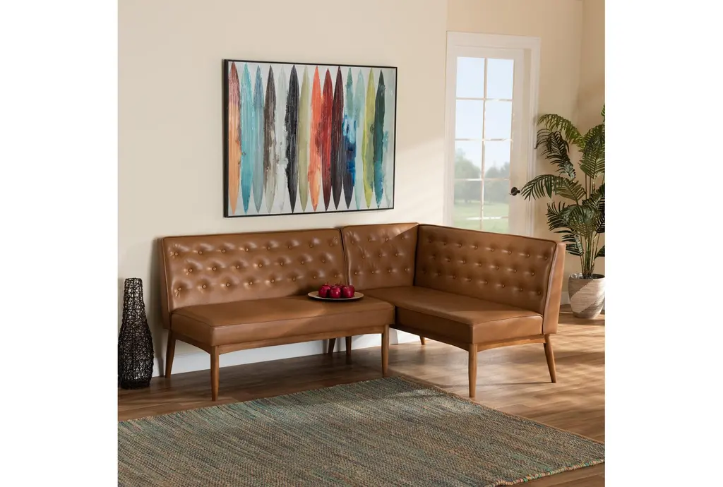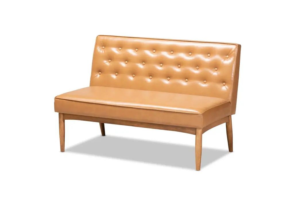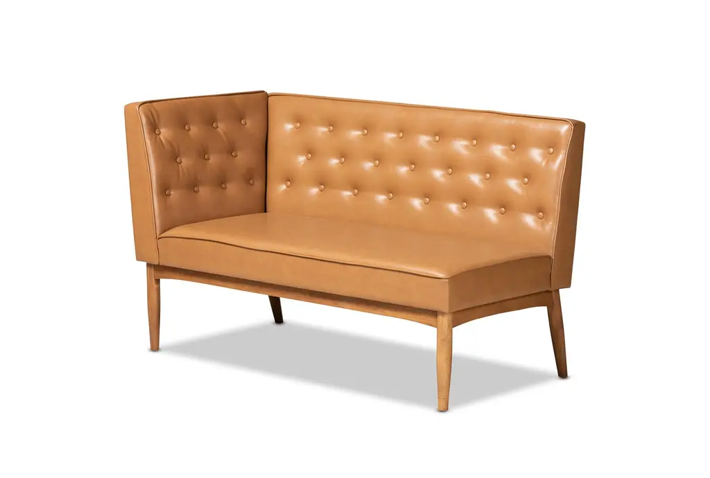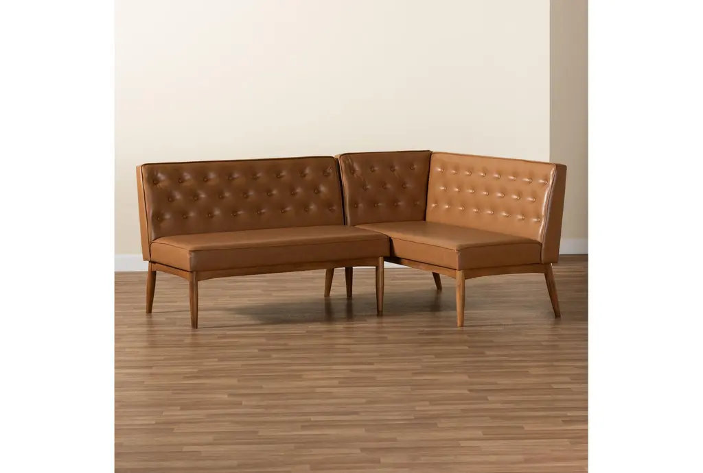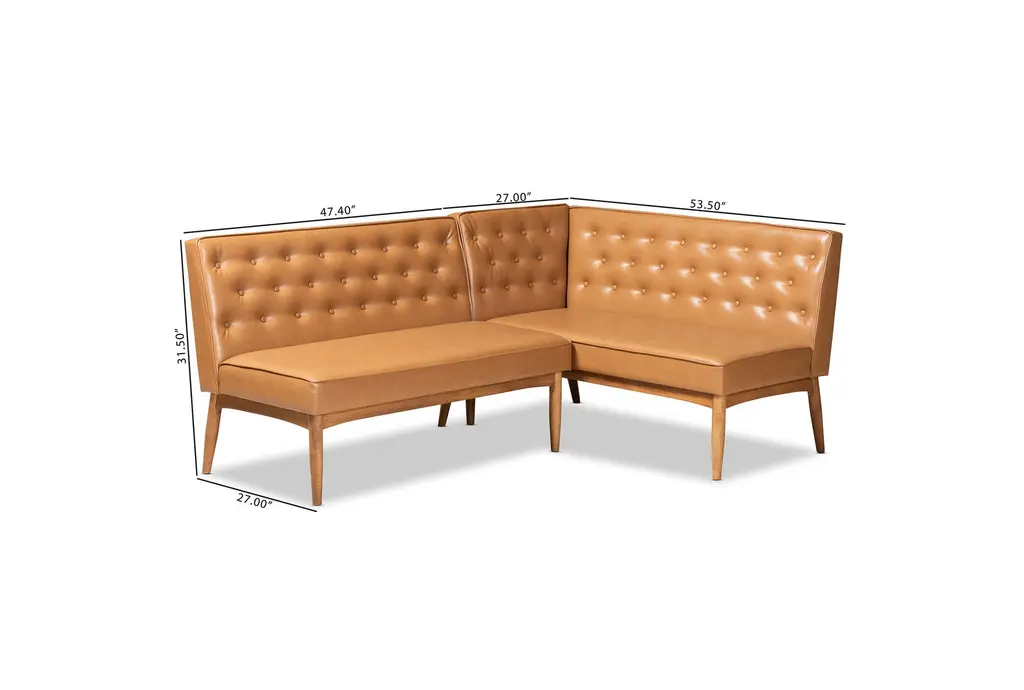 Riordan Mid-Century Modern Tan Faux Leather Upholstered And Walnut Brown Wood 2-Piece Dining Nook Banquette | Tufted