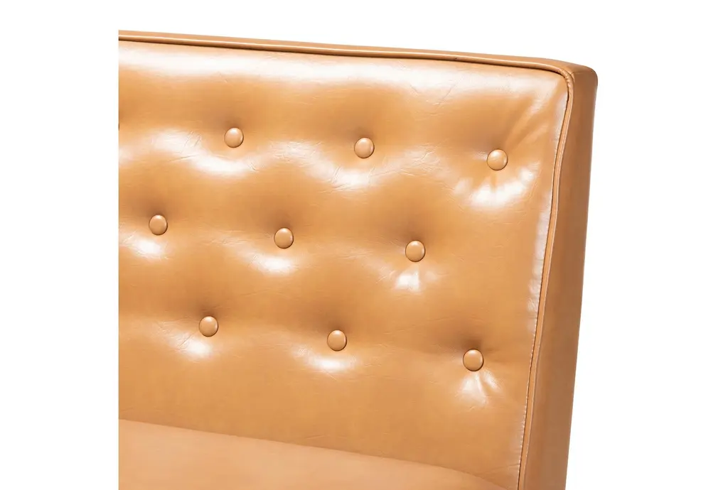 Enhance your dining or living room with the Riordan Mid-Century Modern Tan Faux Leather Upholstered and Walnut Brown Wood 2-Piece Dining Nook Banquette. This stylish nook features a high back and tufted detailing, providing both comfort and a touch of retro charm. The tan faux leather upholstery and walnut brown wood legs create a warm and inviting atmosphere for any room.