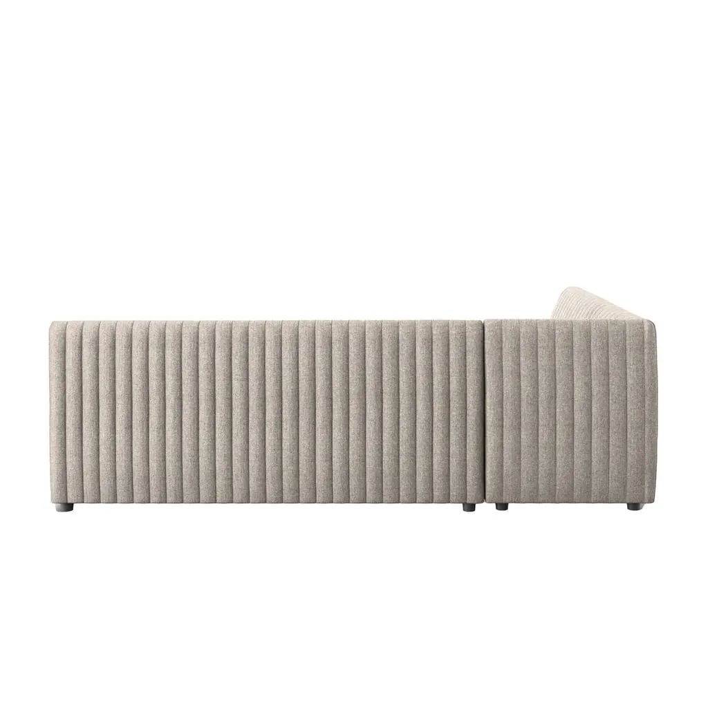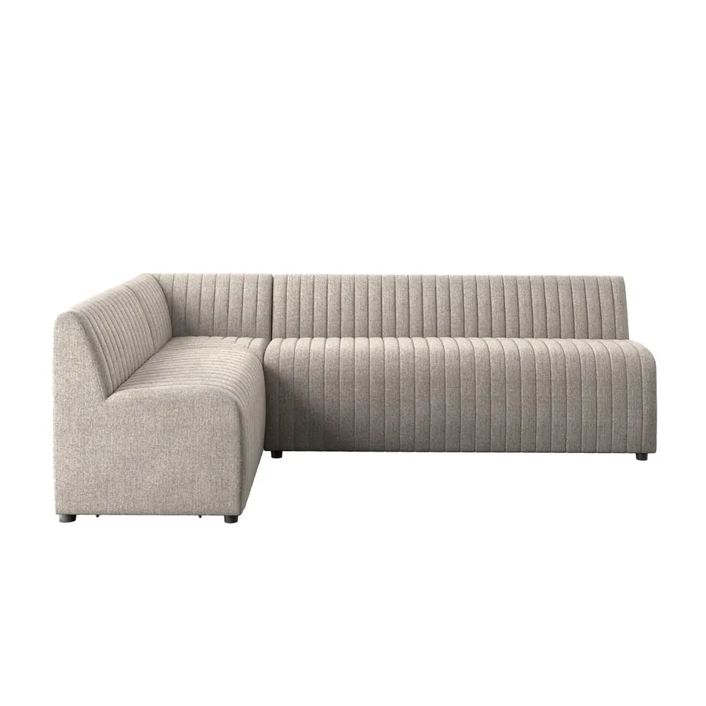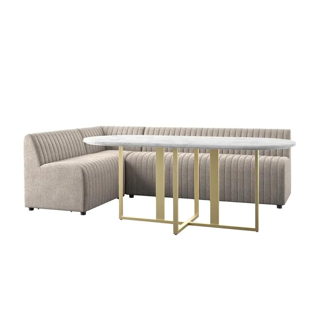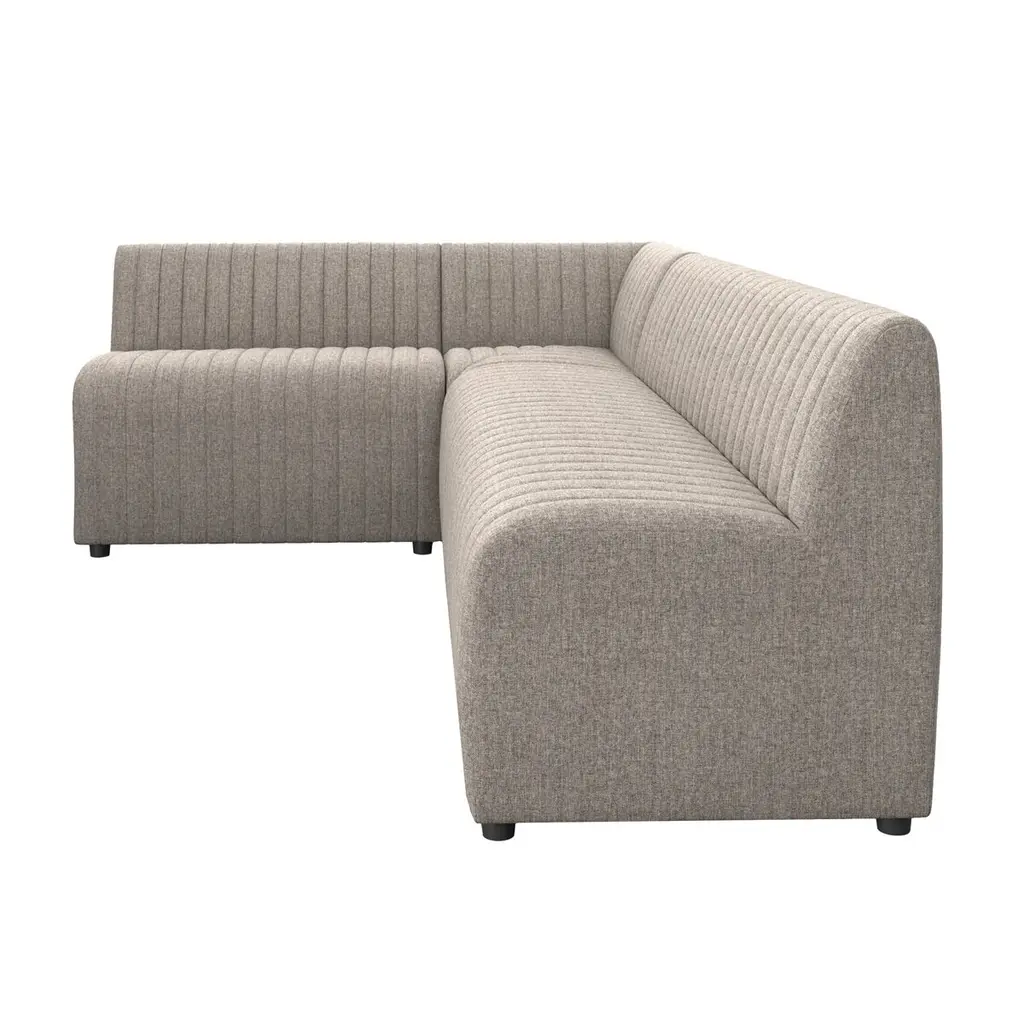 The Vivian Dining Banquette, L-Shape, is a sophisticated addition to any dining space, showcasing dramatic channeling that enhances its elegant design. Inspired by classic menswear patterns, this banquette offers a sumptuous seating experience. Its versatile design allows for pairing with matching pieces, providing flexible modularity to suit various room configurations. Crafted with high-performance fabric, it ensures both style and comfort, making it a timeless choice for modern interiors.
