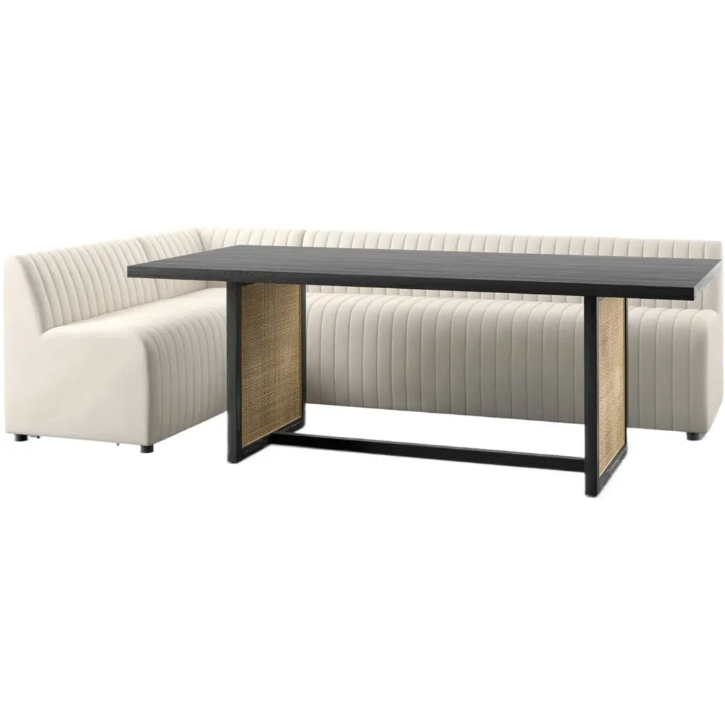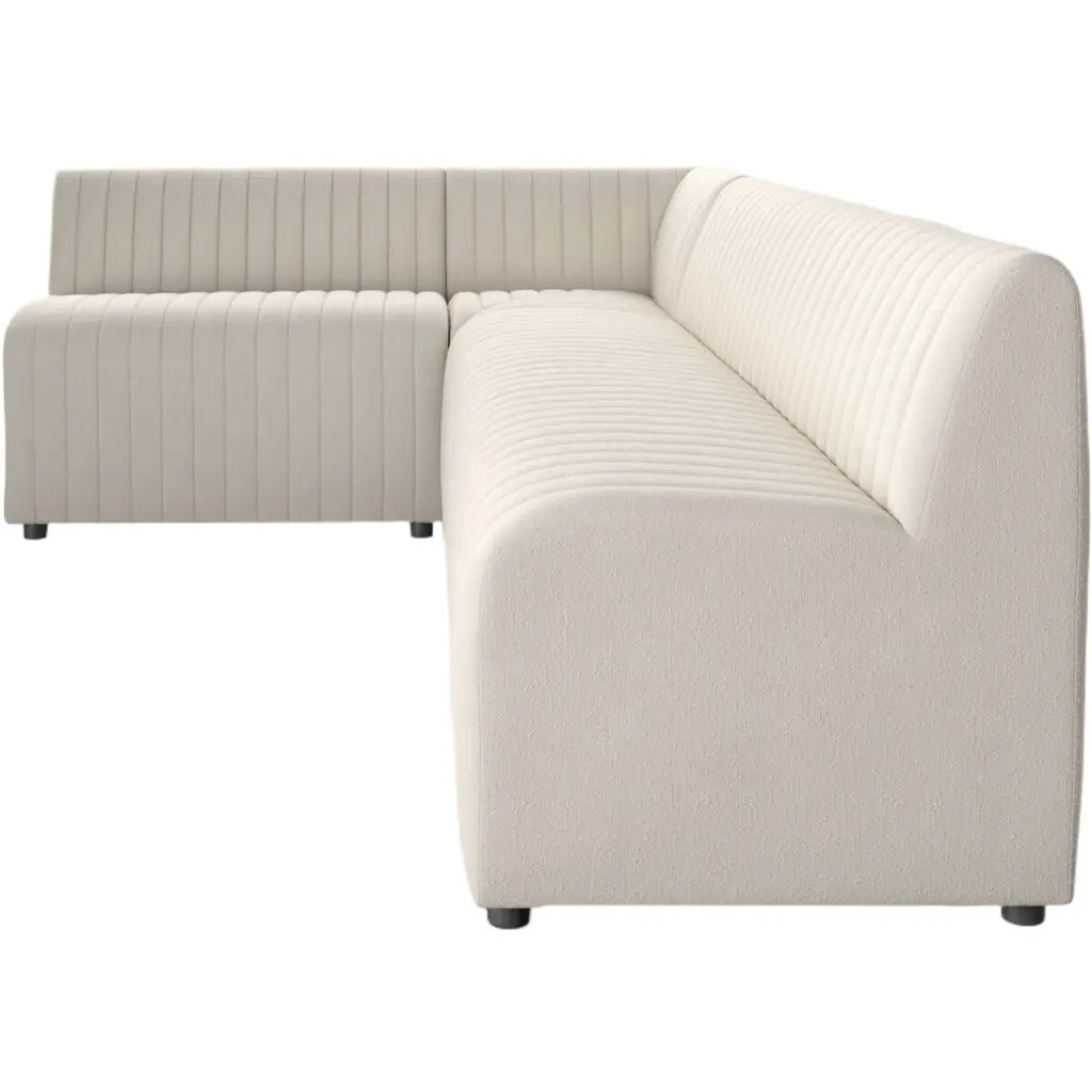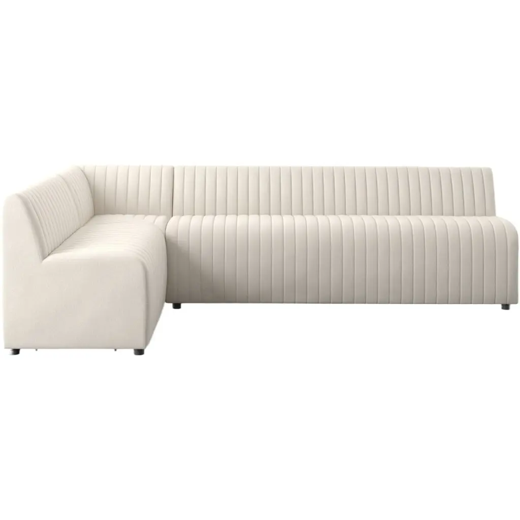 The Vivian Dining Banquette, L-Shape, is a sophisticated addition to any dining space, showcasing dramatic channeling that enhances its elegant design. Inspired by classic menswear patterns, this banquette offers a sumptuous seating experience. Its versatile design allows for pairing with matching pieces, providing flexible modularity to suit various room configurations. Crafted with high-performance fabric, it ensures both style and comfort, making it a timeless choice for modern interiors.