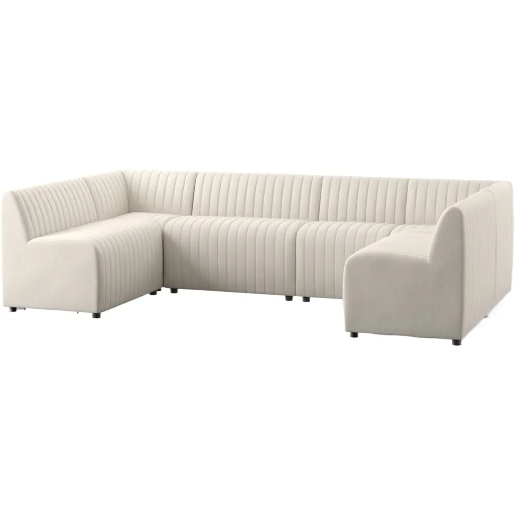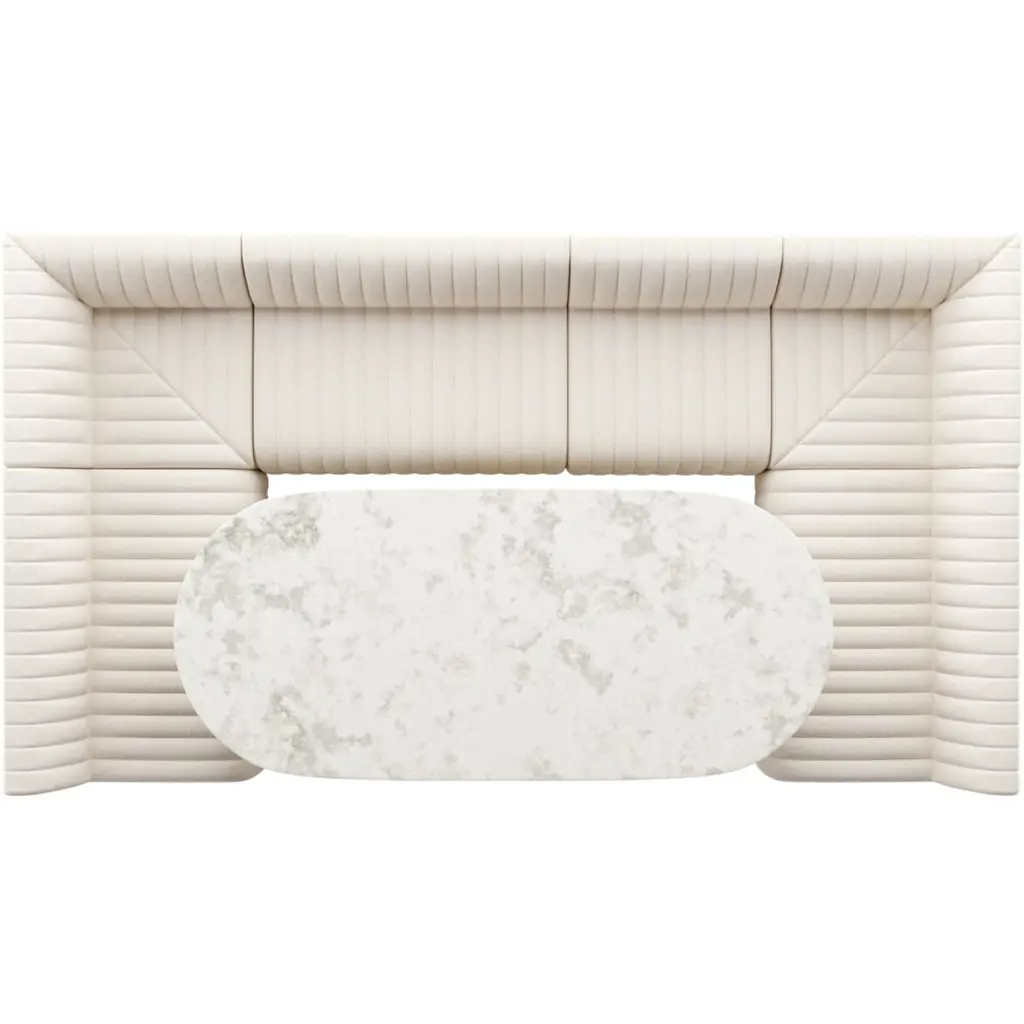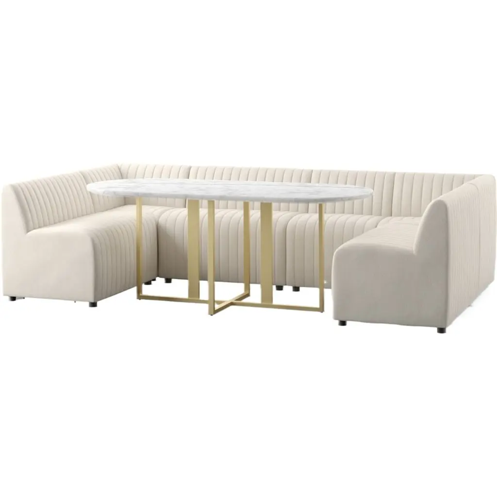 The Vivian Dining Banquette, U Shape, is a masterpiece of design and functionality. Its dramatic channeling and tailored fabric, inspired by classic patterns, create a sophisticated and inviting atmosphere. This banquette offers the flexibility of modularity, allowing you to pair it with matching pieces to suit your space and style. Whether you're hosting a dinner party or enjoying a quiet meal, the Vivian Dining Banquette provides a sumptuous and comfortable seating experience.