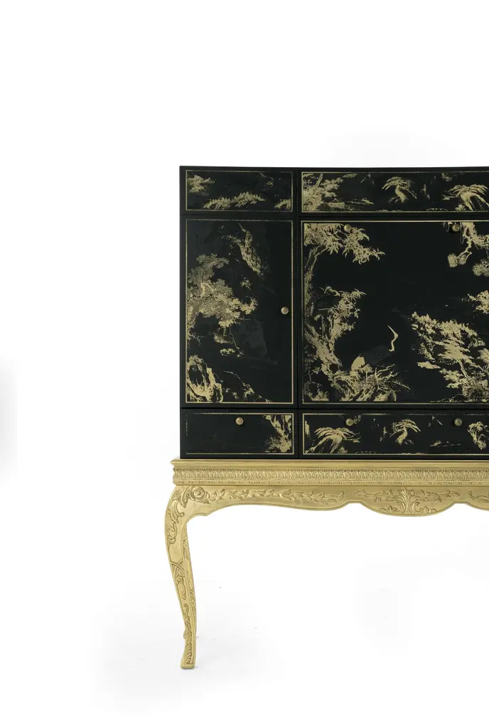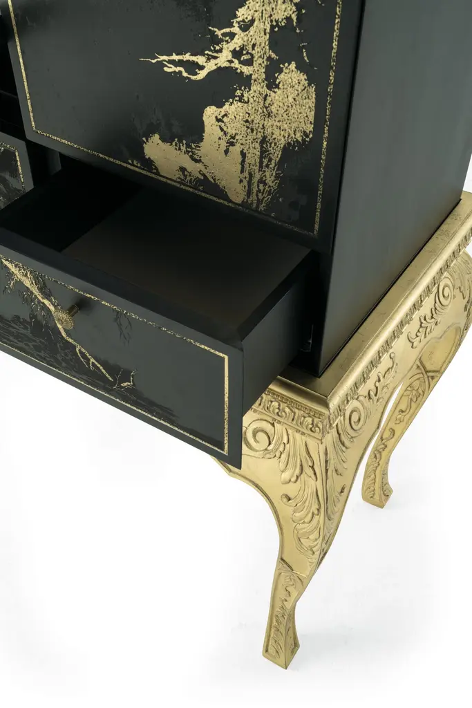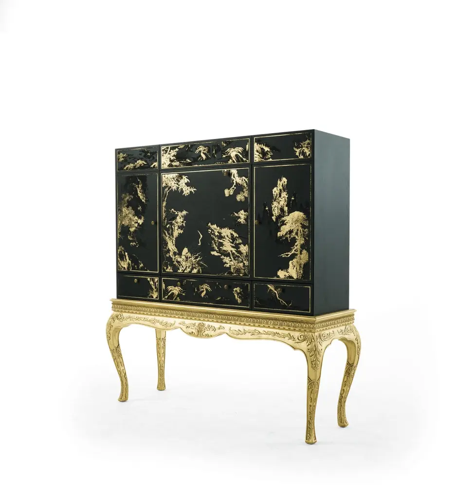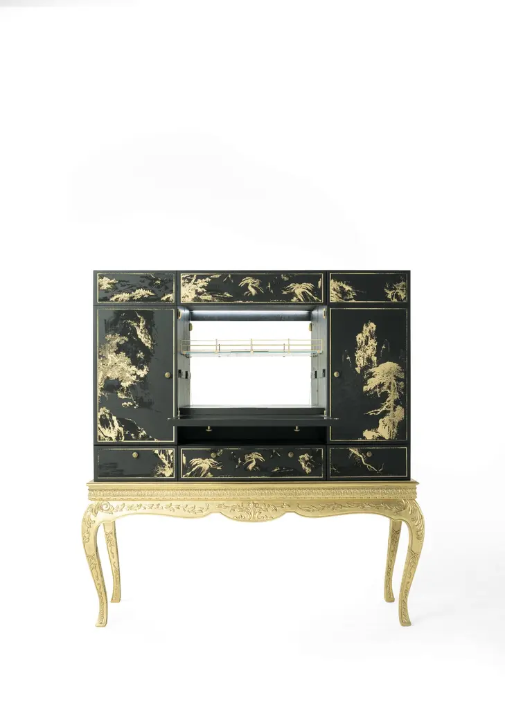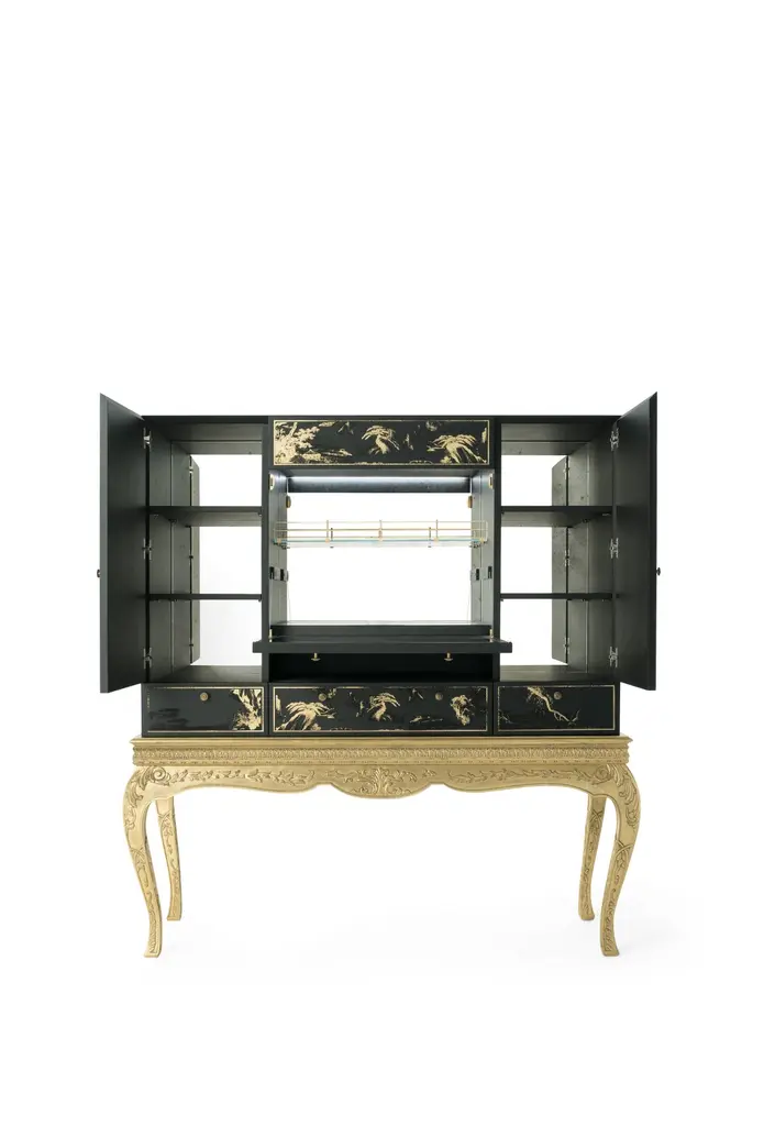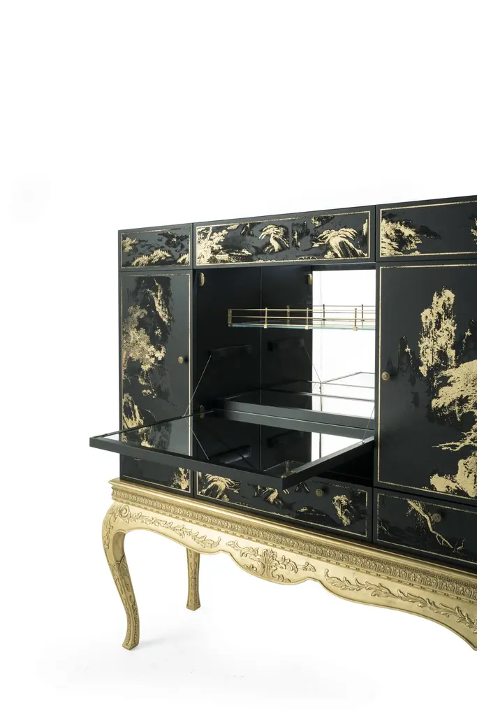 Brocart is a precious and decorative bar cabinet where classic style meets oriental inspirations. The hand-carved legs and decorative frame finished in patinated antique gold recall the baroque style, while the structure in black lacquered wood with gold leaf laser is engraved with oriental decoration. Bar cabinet with base in wood, hand-carved legs and decorative frame finished in patinated antique gold. Structure in black lacquered wood with gold leaf laser engraved oriental decoration JG302. Two doors and three drawers with inner cover in microfiber MIL. 21.13A. Central door and internal compartments with glass shelves and brass railing for glasses and bottles. Back covered in antique mirror.