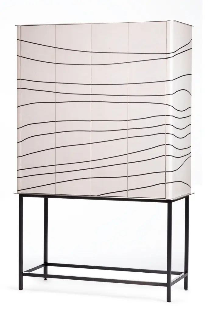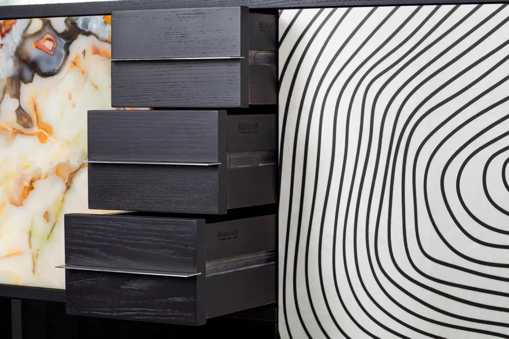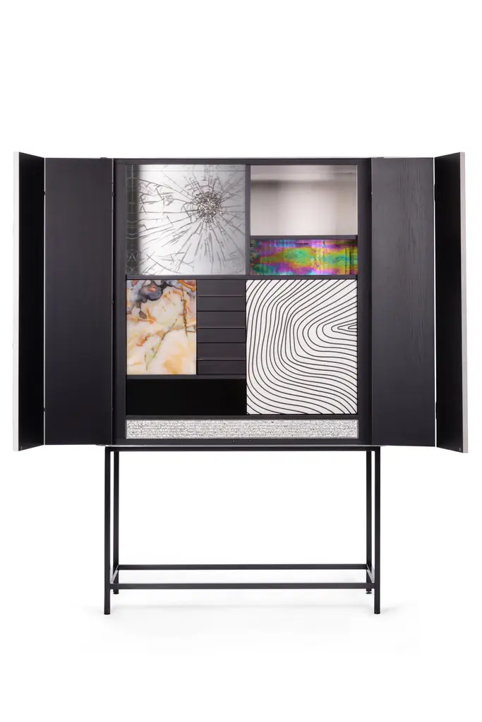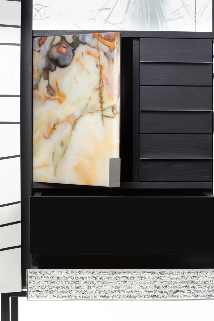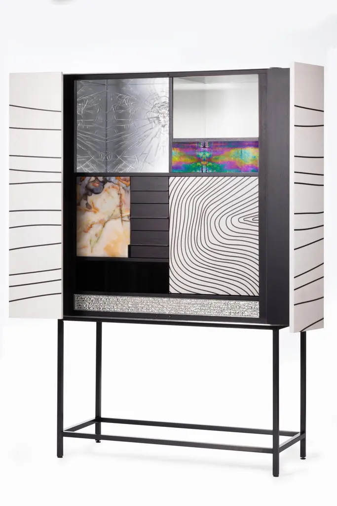 Inspired by antique European luxury cabinet and reworked in a contemporary style, the cabinet de salon Corde materializes from the Stefano Trapani's idea of creating a refined, modern piece of furniture using the ancient inlay tecnique of wood marquetry. The dialogue that takes place between materials and form represent the hearth of Corde cabinet, an interplay of exquisite elements wich connect it to a higher dimension, the artistic one, where design and art are the main protagonists. FeaturesCrafted in Italy by Hebanon's master cabinet, the exterior marquetry is made in whitened birdseye maple wood with strips of black ash. The interior is a balance of geometries and volumes, achived using various exceptional materials, such as onyx, artistic glass, dichroic glass, mirror, metal and wood inlay. Designer - Stefano Trapani Graduated in architecture in Italy, Stefano Trapani began his first work experience in Paris in 2001 working on various projects including interior design, villas, flats and hotels. The architect has designed a collection of designer furniture still on display in a Home Gallery in Paris and created a chandelier for Plumbum that will be presented at the next Brussels Design Market 2021. In his creative universe, the architect harmoniously links interior architecture, decoration, design and fashion, where Italian culture is combined with French eclecticism and sophistication. In the projects carried out between the Côte d'Azur and Paris, Italy and Belgium play a leading role: perspectives, study of light, quality of materials and trait d'union between male and female, lightness and intensity, beautiful and useful.The Company Identity - Hebanon Fratelli Basile - 183042 are the wooden species kept in our vault of centuries-old veneers, 5 of which are endangered; 2 are the result of anomalies: woods tell as much about humanity as people do.In Hebanon Fratelli Basile 1830 we operate with respect for man and the environment,using only non-toxic products for human health, formaldehyde free, wood with forest certifications and recovering processing waste as a source of complementary energy.All products are 100% certified Designed and manufactured in Italy, branded and identified by an identification number and holographic mark that guarantee their uniqueness and originality in the world.LanguageOur language stems from our cultural heritage coming from the Kingdom of the two Sicilies and from cabinetmaking of which we have internalized the discipline, technique and vision. - The carvings: they become elements that sculpt the air and dictate the rhythm of space; a game of seduction between opposites: hot and cold, masculine and feminine, natural and precious materials, pure and primary shapes alternating with organic forms of nature.- The inlays: they lose the only decorative value, acquiring in themselves the narrative value of the object; perspectives, optical illusions, sometimes provocative, sometimes sensual, sometimes ethereal and elusive, natural materials and textures that anthropomorphize nature.Prices do not include shipping from Italy.