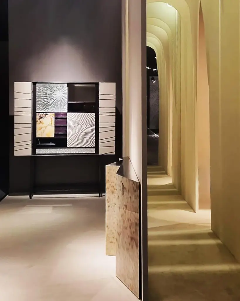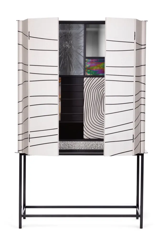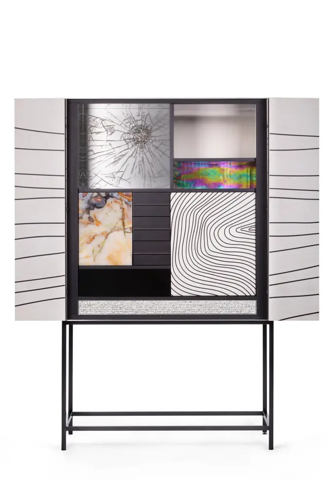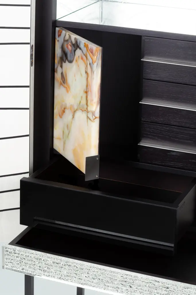 Inspired by antique European luxury cabinet and reworked in a contemporary style, the cabinet de salon Corde materializes from the Stefano Trapani's idea of creating a refined, modern piece of furniture using the ancient inlay tecnique of wood marquetry. The dialogue that takes place between materials and form represent the hearth of Corde cabinet, an interplay of exquisite elements wich connect it to a higher dimension, the artistic one, where design and art are the main protagonists. FeaturesCrafted in Italy by Hebanon's master cabinet, the exterior marquetry is made in whitened birdseye maple wood with strips of black ash. The interior is a balance of geometries and volumes, achived using various exceptional materials, such as onyx, artistic glass, dichroic glass, mirror, metal and wood inlay. Designer - Stefano Trapani Graduated in architecture in Italy, Stefano Trapani began his first work experience in Paris in 2001 working on various projects including interior design, villas, flats and hotels. The architect has designed a collection of designer furniture still on display in a Home Gallery in Paris and created a chandelier for Plumbum that will be presented at the next Brussels Design Market 2021. In his creative universe, the architect harmoniously links interior architecture, decoration, design and fashion, where Italian culture is combined with French eclecticism and sophistication. In the projects carried out between the Côte d'Azur and Paris, Italy and Belgium play a leading role: perspectives, study of light, quality of materials and trait d'union between male and female, lightness and intensity, beautiful and useful.The Company Identity - Hebanon Fratelli Basile - 183042 are the wooden species kept in our vault of centuries-old veneers, 5 of which are endangered; 2 are the result of anomalies: woods tell as much about humanity as people do.In Hebanon Fratelli Basile 1830 we operate with respect for man and the environment,using only non-toxic products for human health, formaldehyde free, wood with forest certifications and recovering processing waste as a source of complementary energy.All products are 100% certified Designed and manufactured in Italy, branded and identified by an identification number and holographic mark that guarantee their uniqueness and originality in the world.LanguageOur language stems from our cultural heritage coming from the Kingdom of the two Sicilies and from cabinetmaking of which we have internalized the discipline, technique and vision. - The carvings: they become elements that sculpt the air and dictate the rhythm of space; a game of seduction between opposites: hot and cold, masculine and feminine, natural and precious materials, pure and primary shapes alternating with organic forms of nature.- The inlays: they lose the only decorative value, acquiring in themselves the narrative value of the object; perspectives, optical illusions, sometimes provocative, sometimes sensual, sometimes ethereal and elusive, natural materials and textures that anthropomorphize nature.Prices do not include shipping from Italy.