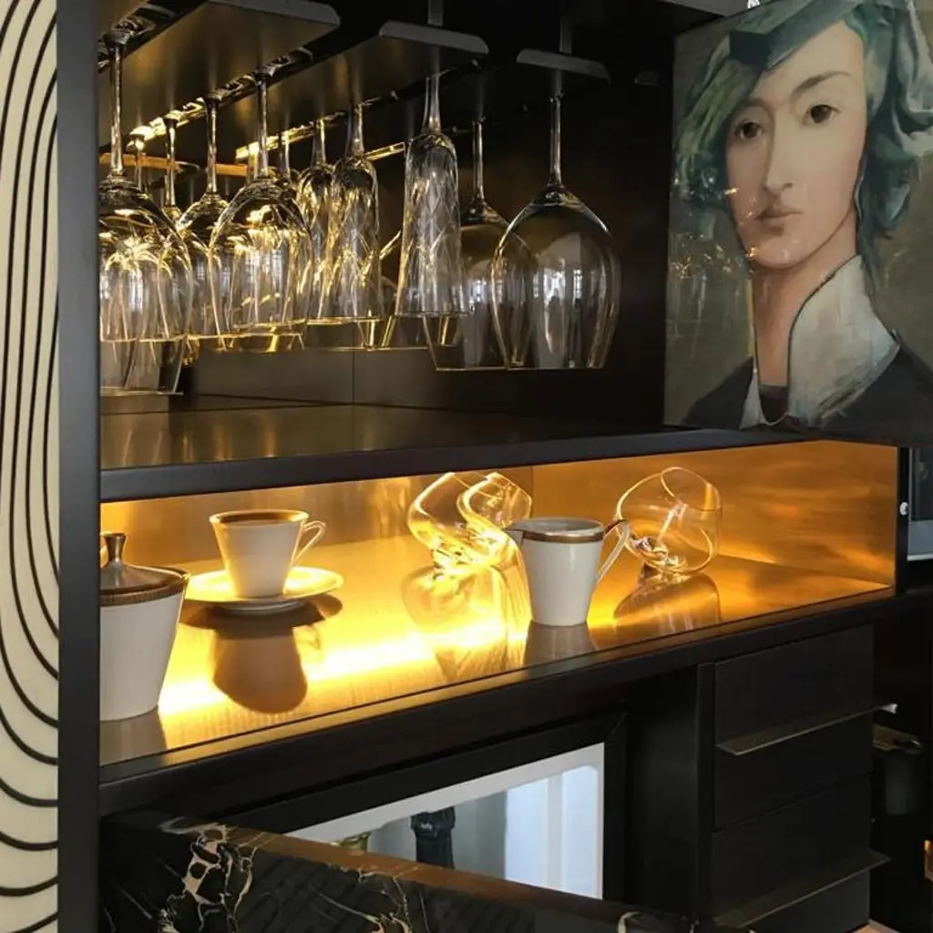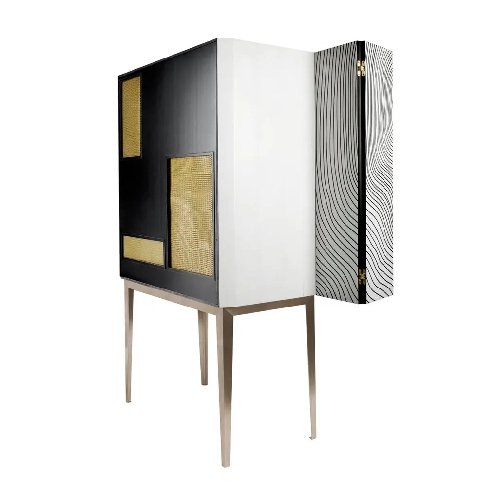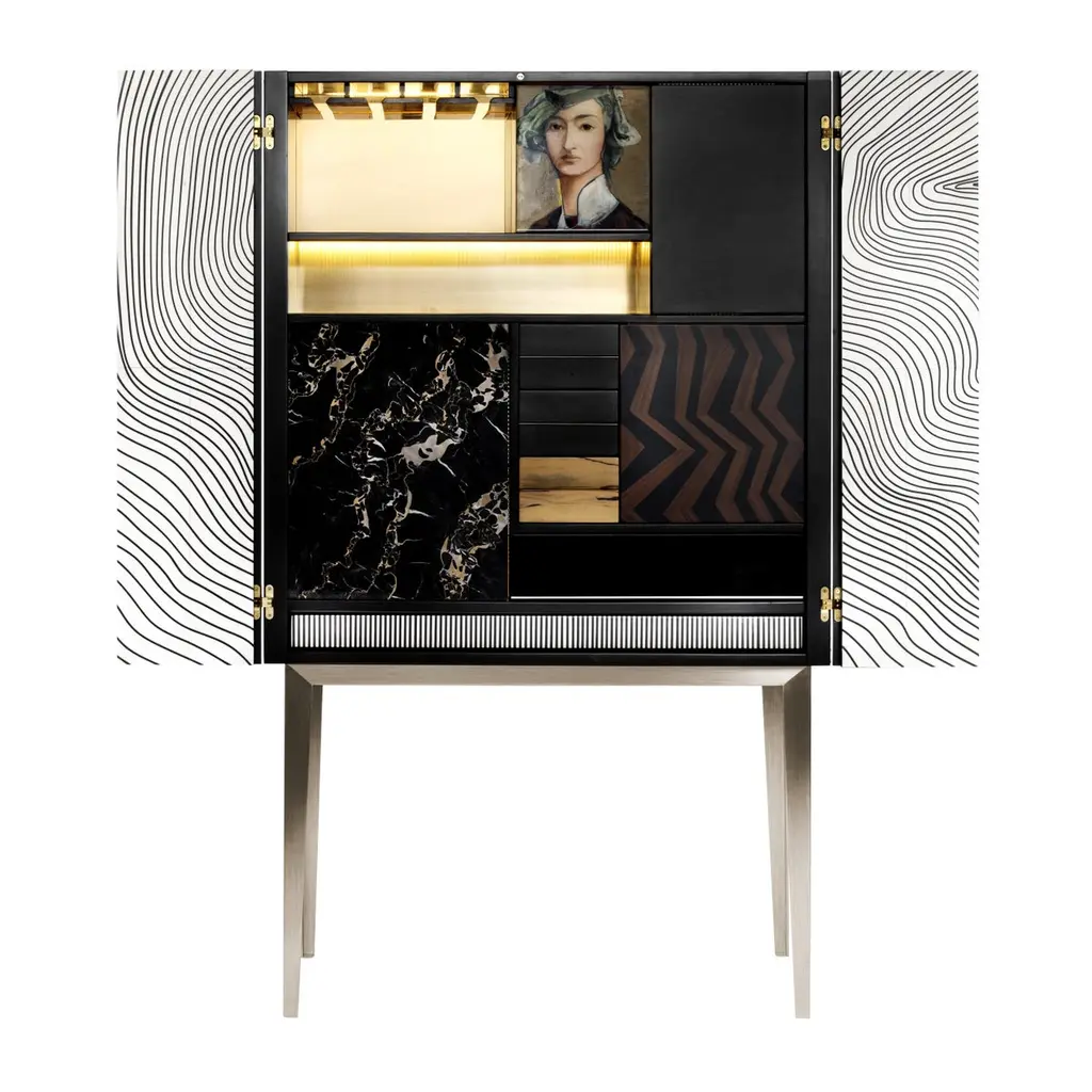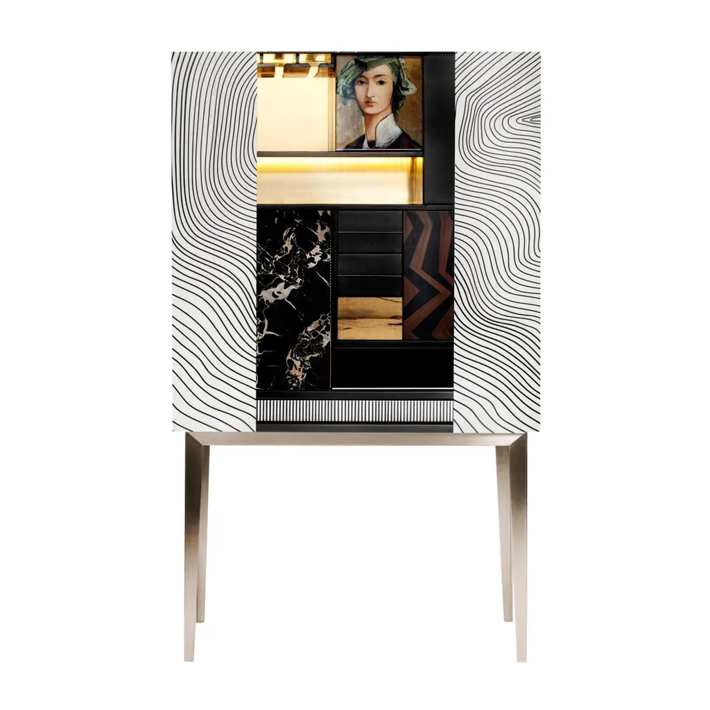 Majord'Home inspires to reflect to our identity, our origins.A journey into precious woods, seductive inlays, manufacture where quality and craftsmanship reach their maximum expression. It enrich a living room or an office, it helps to guest our friends or our clients.It's not only beautiful, he is useful with his warming drawer, wine cellars, coffee machine and mini fridge.It's a bistrot in your home. Design by Stefano Trapani and Brigitte Noelle Legendre.FeaturesCabinet in white maple and black ebony with steel base with acid-etched finish. Interior in black stained oak, Portoro marble, inlays and hand painted decorations. Mini fridge, wine cellar, Nespresso machine and food warmer complete the design, also available without appliances.Designer - Stefano Trapani and Brigitte Noelle Legendre Graduated in architecture in Italy, Stefano Trapani began his first work experience in Paris in 2001 working on various projects including interior design, villas, flats and hotels. The architect has designed a collection of designer furniture still on display in a Home Gallery in Paris and created a chandelier for Plumbum that will be presented at the next Brussels Design Market 2021. In his creative universe, the architect harmoniously links interior architecture, decoration, design and fashion, where Italian culture is combined with French eclecticism and sophistication. In the projects carried out between the Côte d'Azur and Paris, Italy and Belgium play a leading role: perspectives, study of light, quality of materials and Trait d'Union between male and female, lightness and intensity, beautiful and useful.The Company identity - Hebanon Fratelli Basile - 183042 are the wooden species kept in our vault of centuries-old veneers, 5 of which are endangered; 2 are the result of anomalies: woods tell as much about humanity as people do.In Hebanon Fratelli Basile 1830 we operate with respect for man and the environment,using only non-toxic products for human health, formaldehyde free, wood with forest certifications, and recovering processing waste as a source of complementary energy.All products are 100% certified Designed and manufactured in Italy, branded and identified by an identification number and holographic mark that guarantee their uniqueness and originality in the world.LanguageOur language stems from our cultural heritage coming from the Kingdom of the two Sicilies and from cabinetmaking of which we have internalized the discipline, technique and vision. - The carvings: they become elements that sculpt the air and dictate the rhythm of space; a game of seduction between opposites: hot and cold, masculine and feminine, natural and precious materials, pure and primary shapes alternating with organic forms of nature.- The inlays: they lose the only decorative value, acquiring in themselves the narrative value of the object; perspectives, optical illusions, sometimes provocative, sometimes sensual, sometimes ethereal and elusive, natural materials and textures that anthropomorphize nature.Prices do not include shipping from Italy.