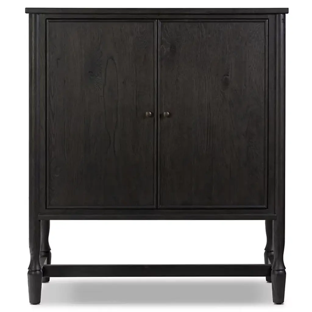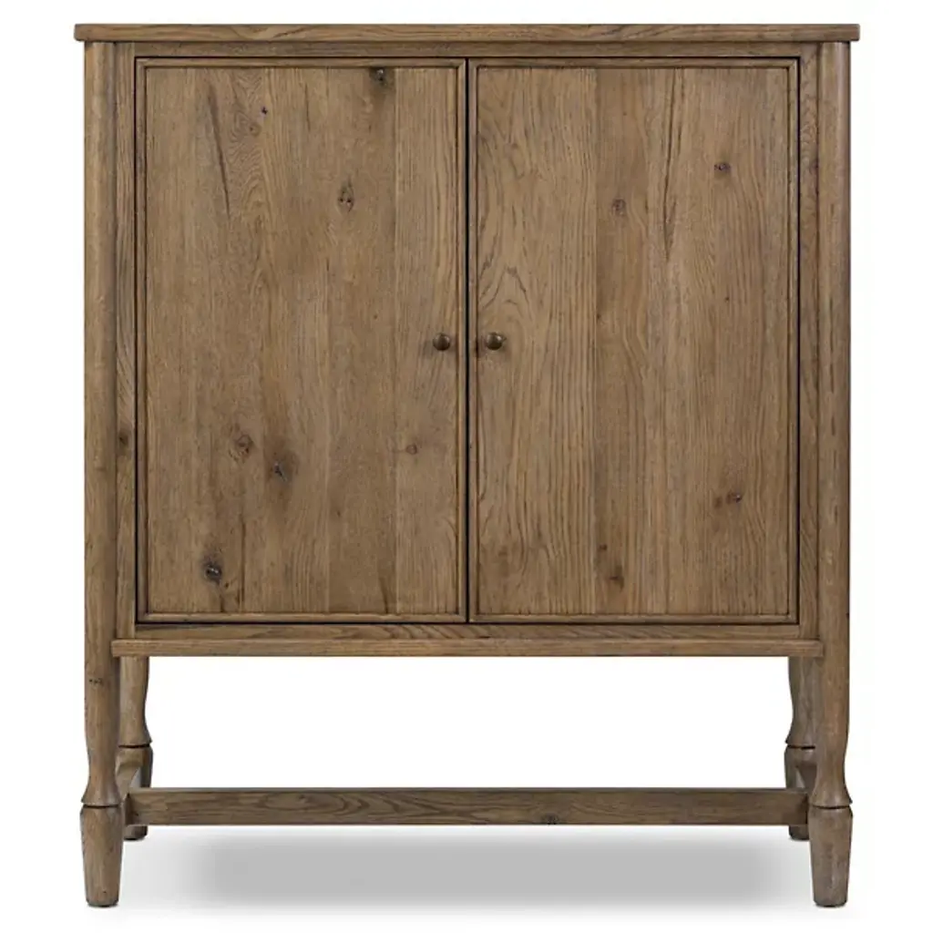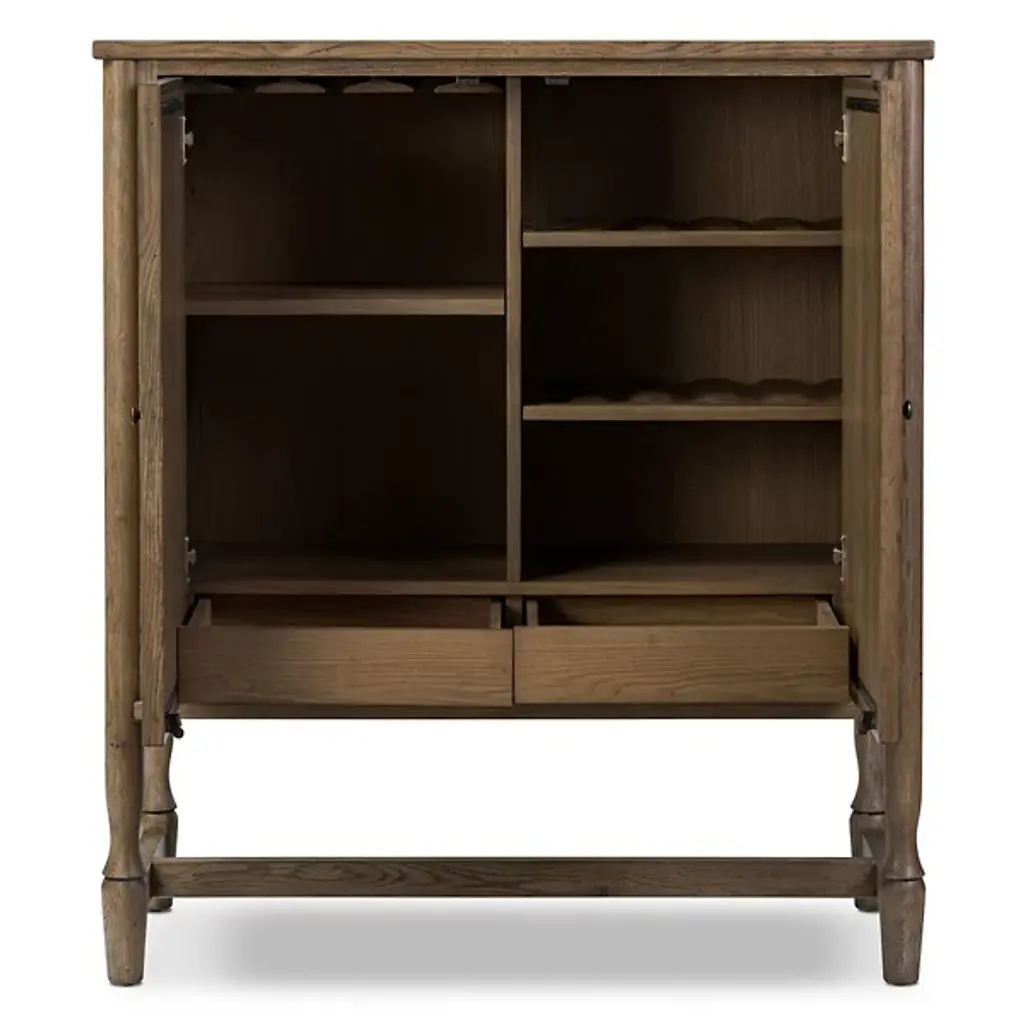 The Amber Lewis x Four Hands Bari Bar Cabinet from Four Hands is a storage solution that elegantly combines rustic modem and contemporary styles. Your cabinet is meticulously crafted from solid oak and thick oak veneer. This durable fixture reveals shelves that are removable and adjustable for your convenience. Hinged doors keep your organized accessories concealed. This cabinet boasts pulls that offer quick access to your possessions. Bari Bar has a shelf capacity of 40 pounds.