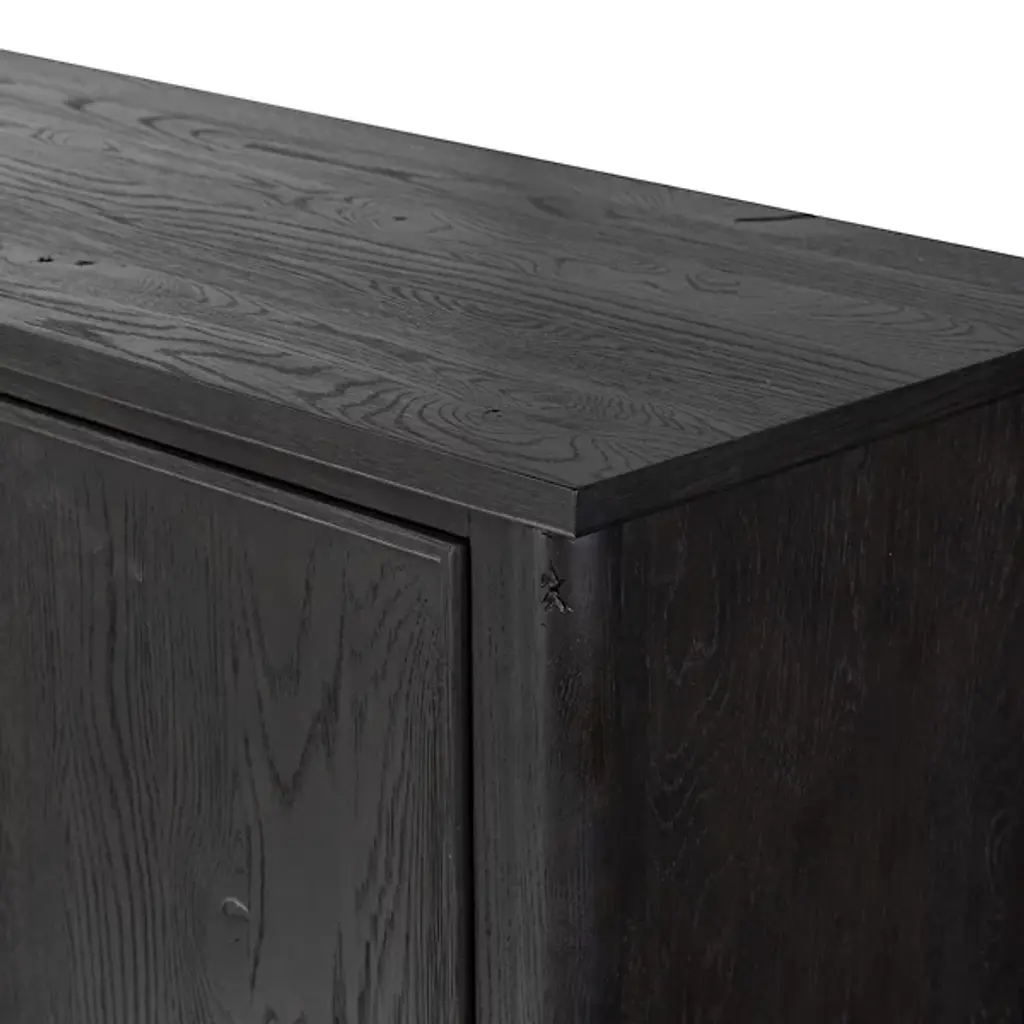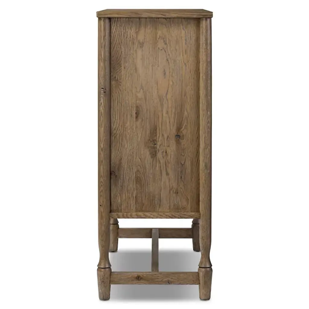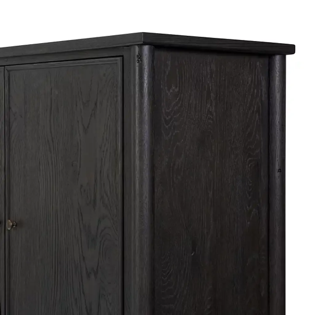 The Amber Lewis x Four Hands Bari Bar Cabinet from Four Hands is a storage solution that elegantly combines rustic modem and contemporary styles. Your cabinet is meticulously crafted from solid oak and thick oak veneer. This durable fixture reveals shelves that are removable and adjustable for your convenience. Hinged doors keep your organized accessories concealed. This cabinet boasts pulls that offer quick access to your possessions. Bari Bar has a shelf capacity of 40 pounds.