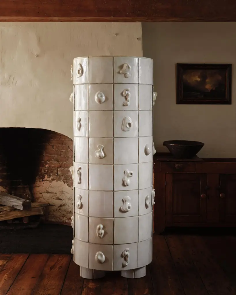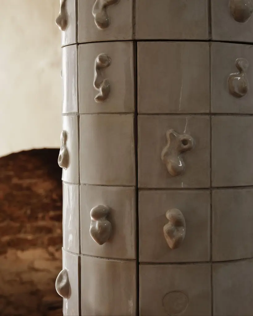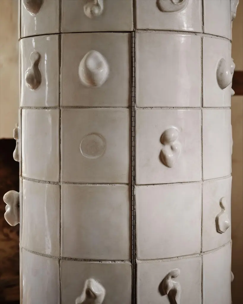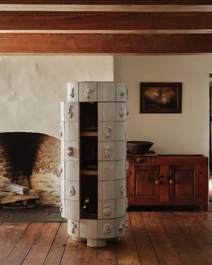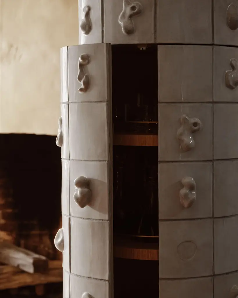 A monumental cabinet clad in handmade ceramic tiles which are curved to fit the contour of the piece, and punctuated with sculptural appliques. The interior is a rich cerused oak, with antique nickel rails on the shelves and a hatch in the floor for additional storage. Each cabinet is made to order so we can customize the internal details for ulterior uses as well as cabinet overall dimensions if needed.Materials: Handmade Ceramic Tiles, Cerused Oak, and Antique Nickel Metal DetailsDimensions: 27-1/8" W x 27-1/8" D x 65-3/8" HCustomization: Available.