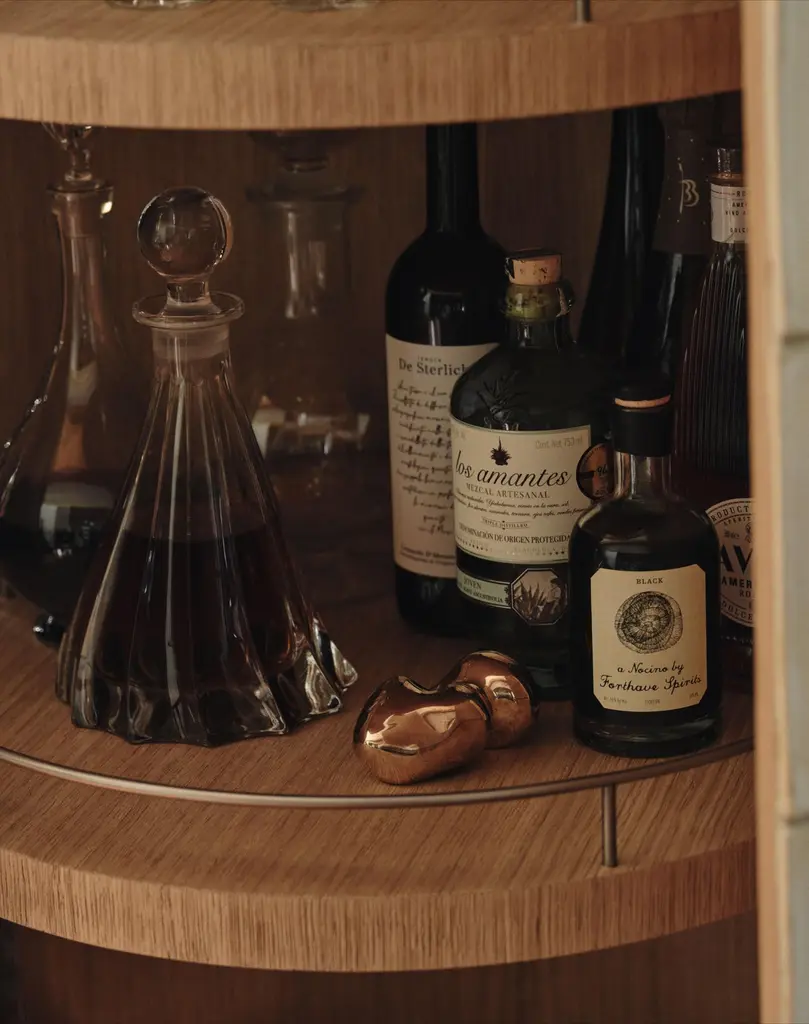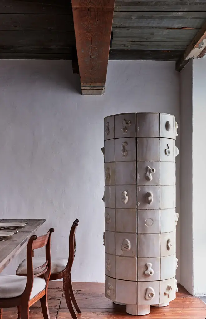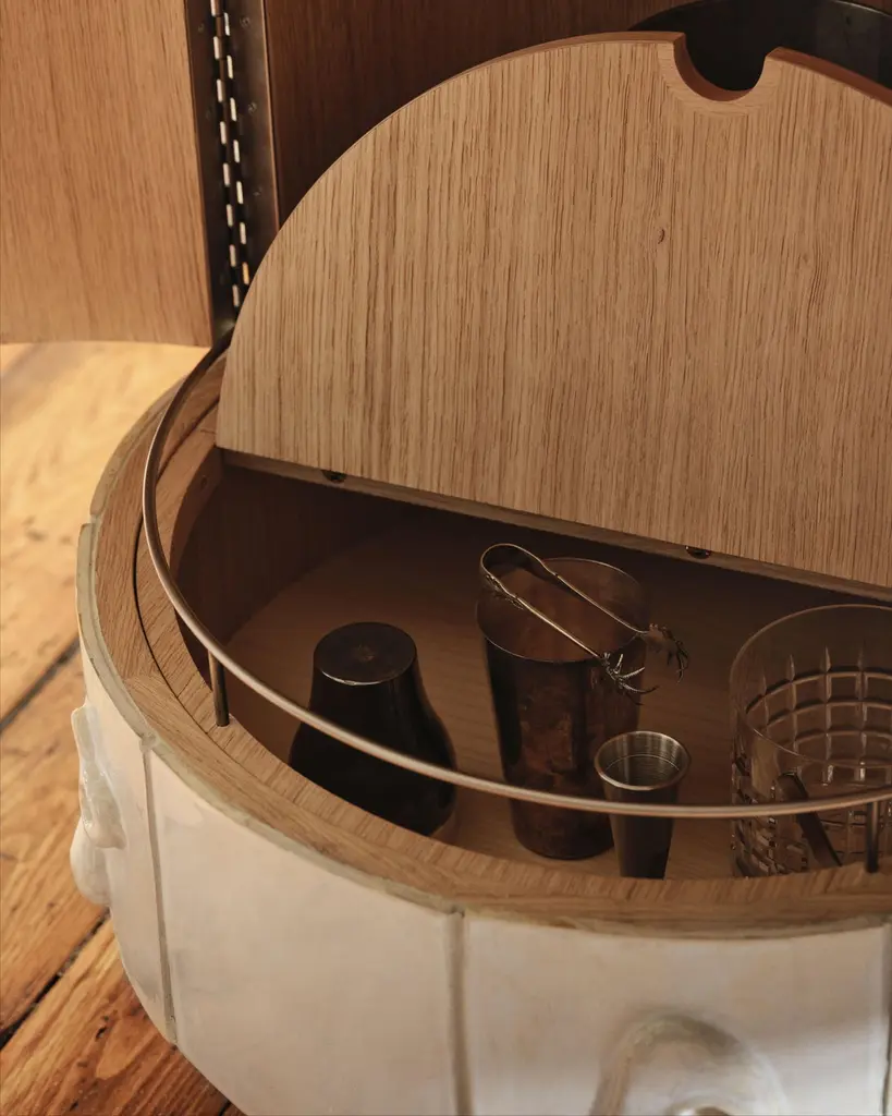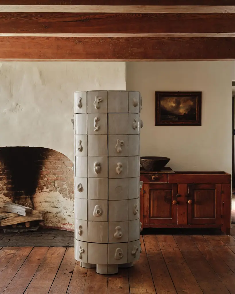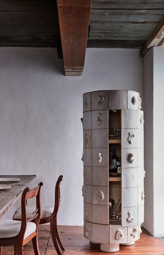 A monumental cabinet clad in handmade ceramic tiles which are curved to fit the contour of the piece, and punctuated with sculptural appliques. The interior is a rich cerused oak, with antique nickel rails on the shelves and a hatch in the floor for additional storage. Each cabinet is made to order so we can customize the internal details for ulterior uses as well as cabinet overall dimensions if needed.Materials: Handmade Ceramic Tiles, Cerused Oak, and Antique Nickel Metal DetailsDimensions: 27-1/8" W x 27-1/8" D x 65-3/8" HCustomization: Available.