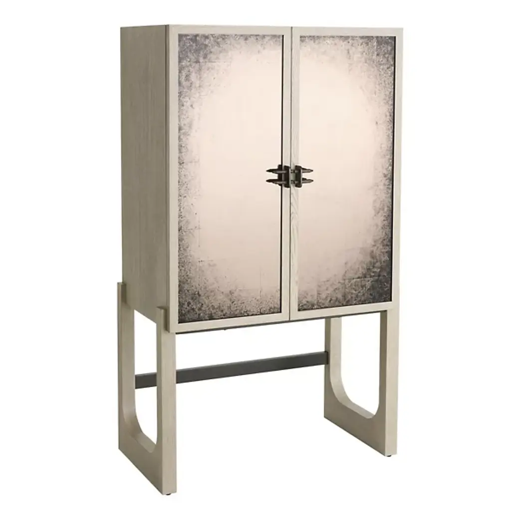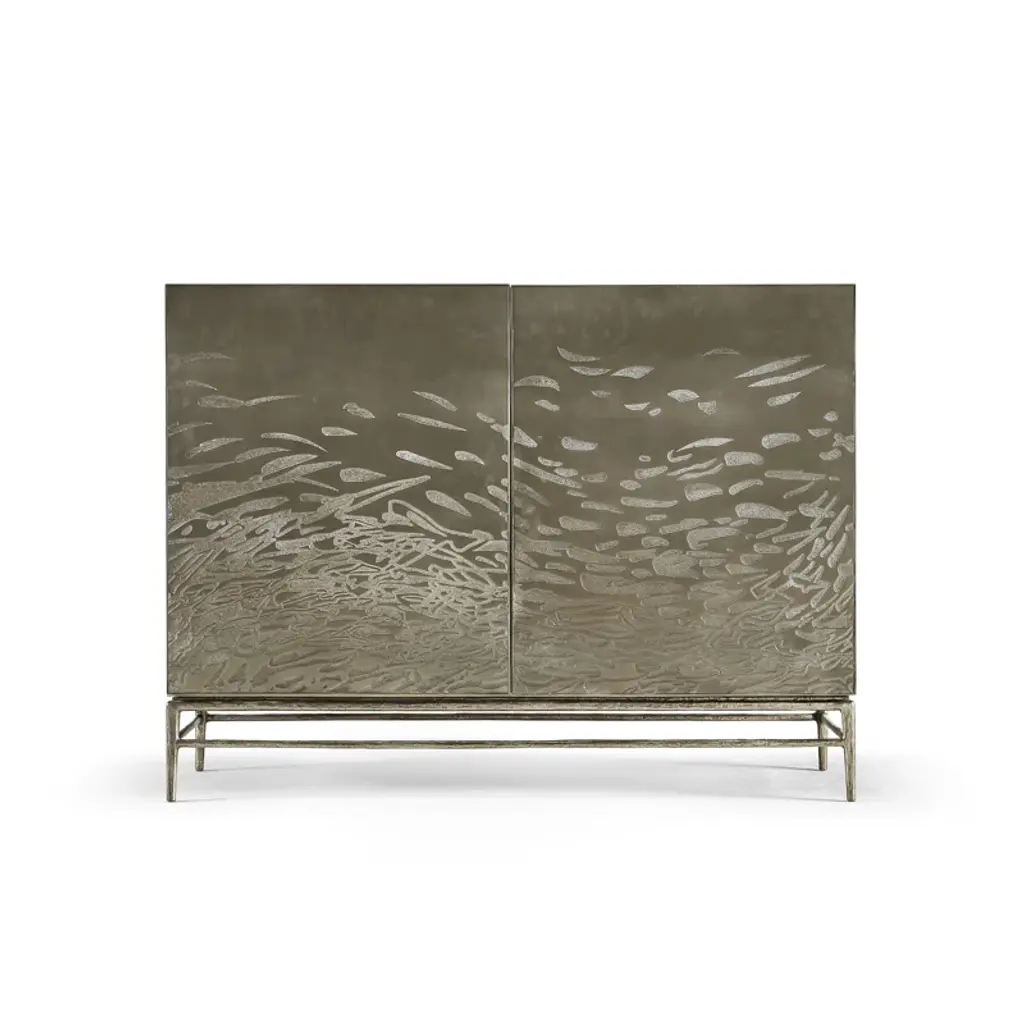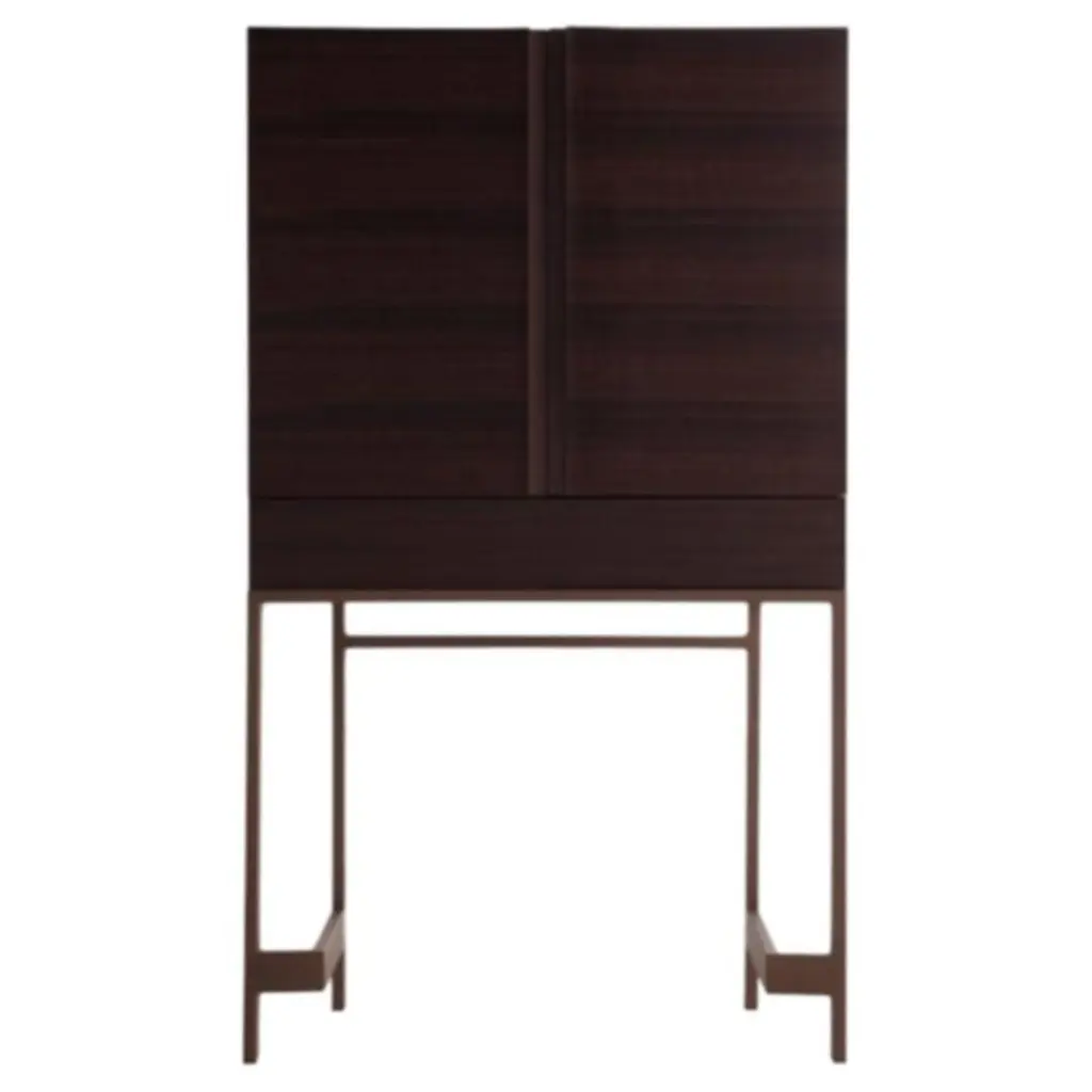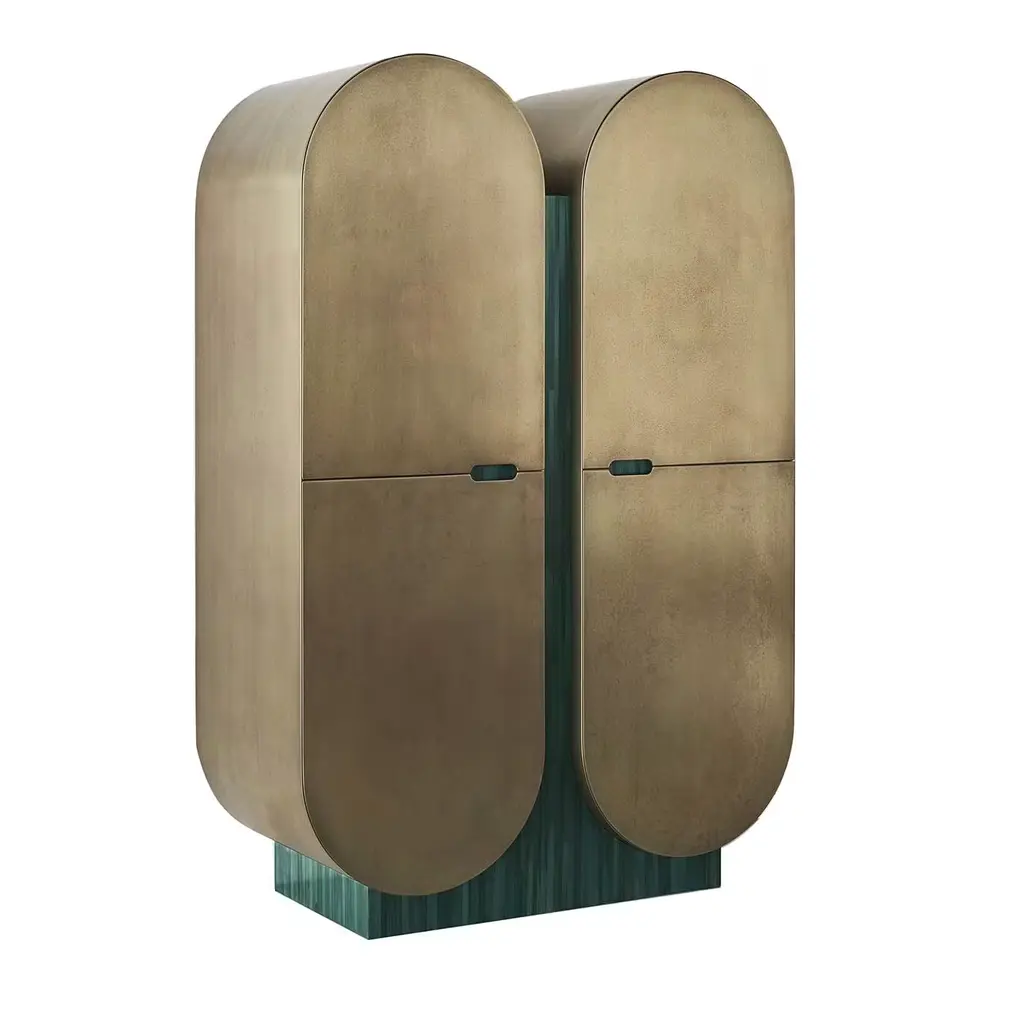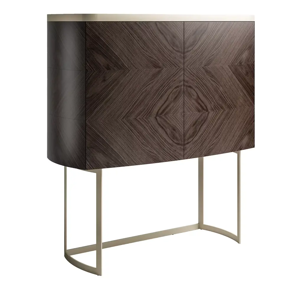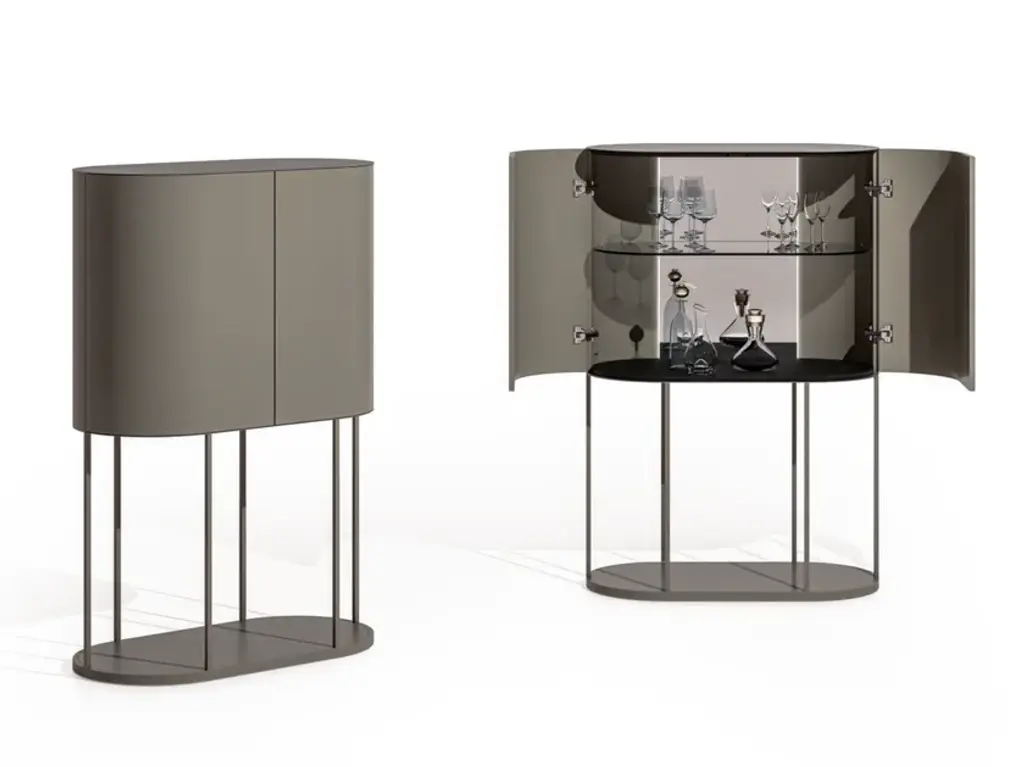 Asteria Lounge is a bar cabinet with a metal base and top, featuring curved lacquered wood doors with side hinges. It is freestanding and finished on the back as well, making it perfect for placement at the center of a room as a statement piece in the living space.The interior bottom is lined with a mirrored surface and includes two optional internal LED lights.Also available in a sideboard and TV stand version.