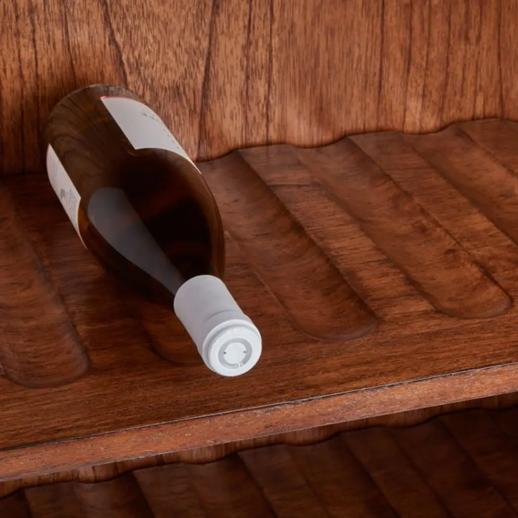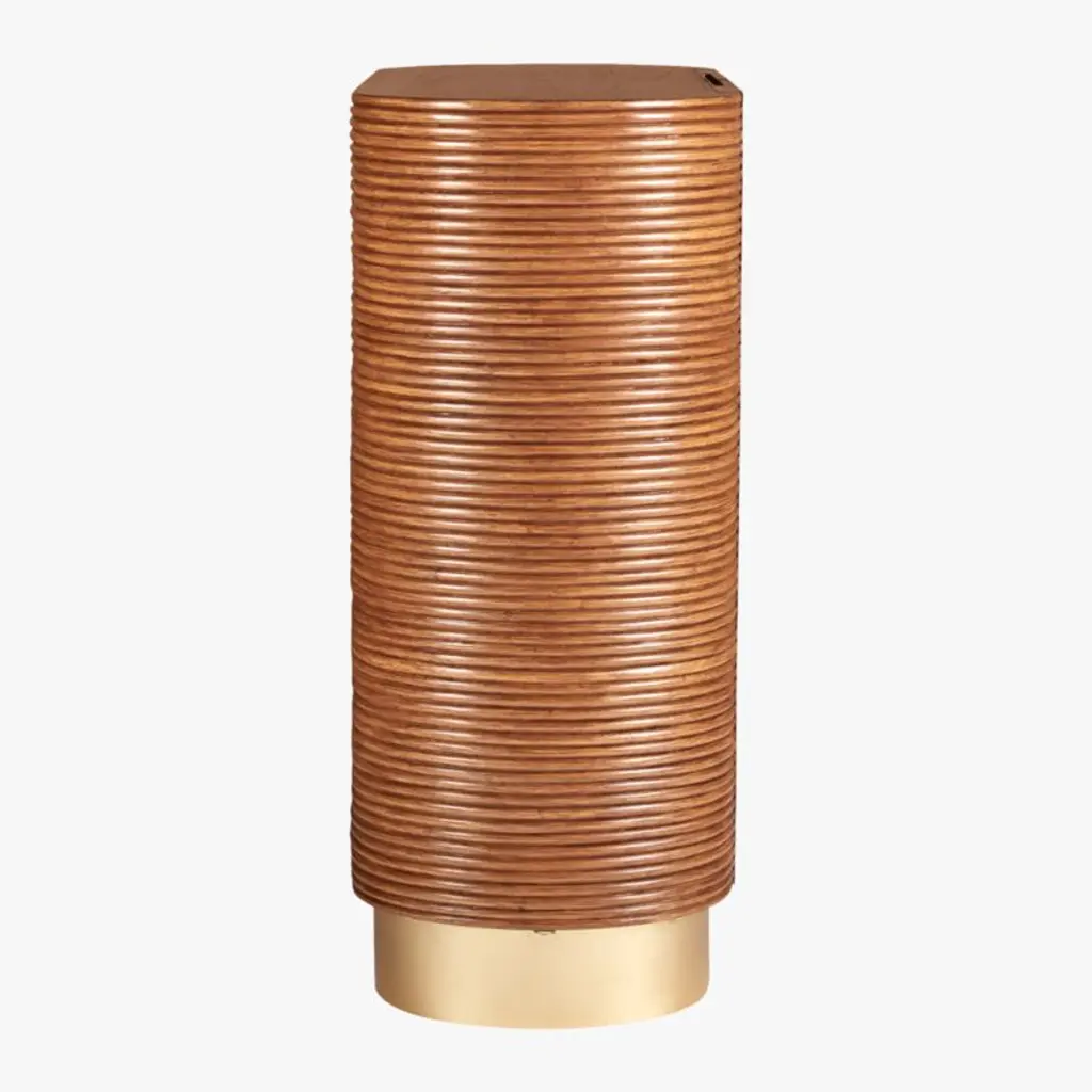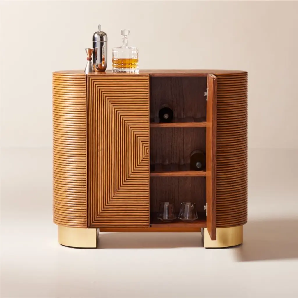 Brett Beldock serves a traditional rattan bar cabinet up with a twist. Solid wood frame with rattan core patterned detail stands modern on a brass half moon base. Inside, shelves hold flat bottomed glasses or flip to store wine bottles in divots. CB2 exclusive.