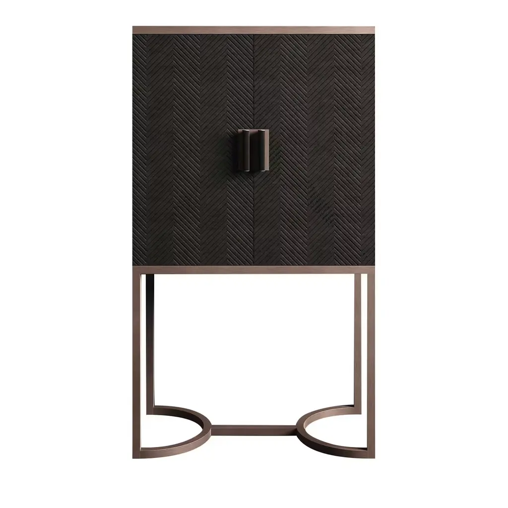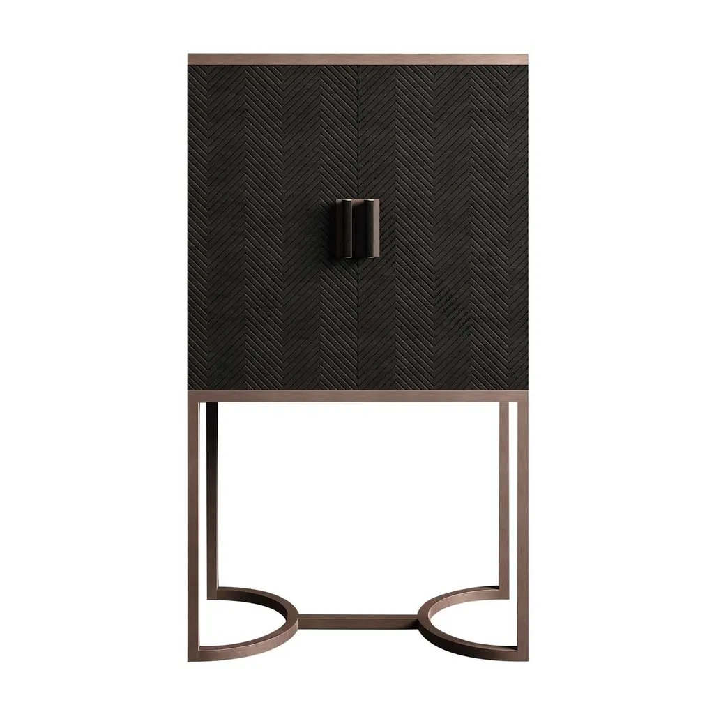 Combining aesthetic balance and functionality, the linear silhouette of this stunning bar cabinet will add bold personality and instant glamour to any living room. This striking piece rests on a trestle base with two semicircular sides crafted of metal with a brushed-copper finish that complement the engraved checkered copper/cerulean pattern of the top unit. The front doors open to reveal an ample storage space with ivory and blue lacquered panels with a mirrored back, a glass shelf, and two bottom drawers for the utmost display case.