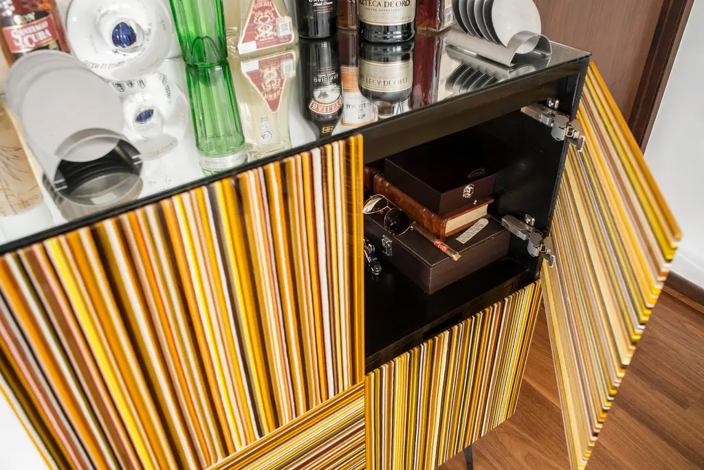 Bar designed by Orfeo Quagliata in collaboration with Taracea furniture. An object of fused glass created with the exclusive barcode technique. The Bar's simple and retro design mixed with designer's exceptional glass expertise put together a cutting edge interiors proposal.