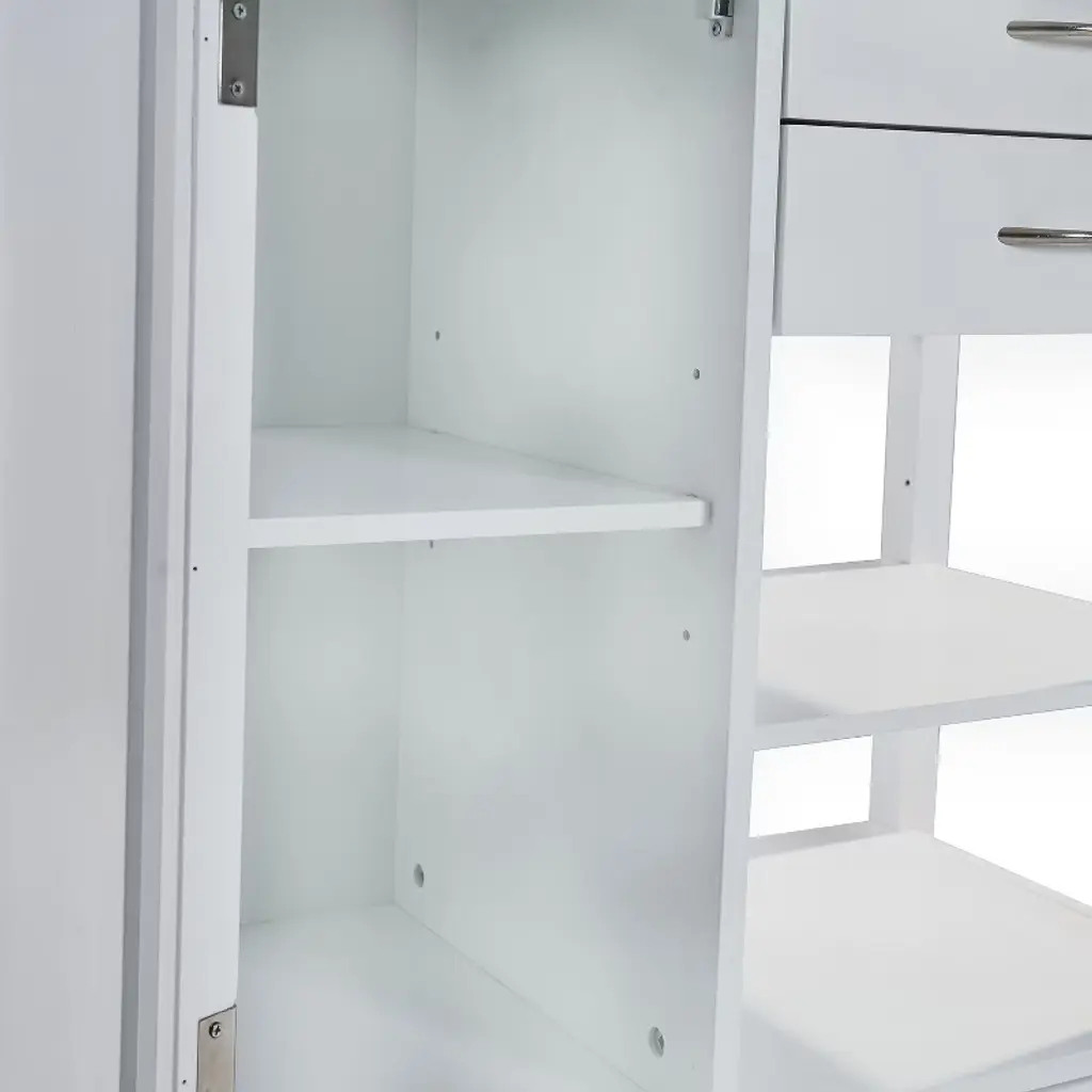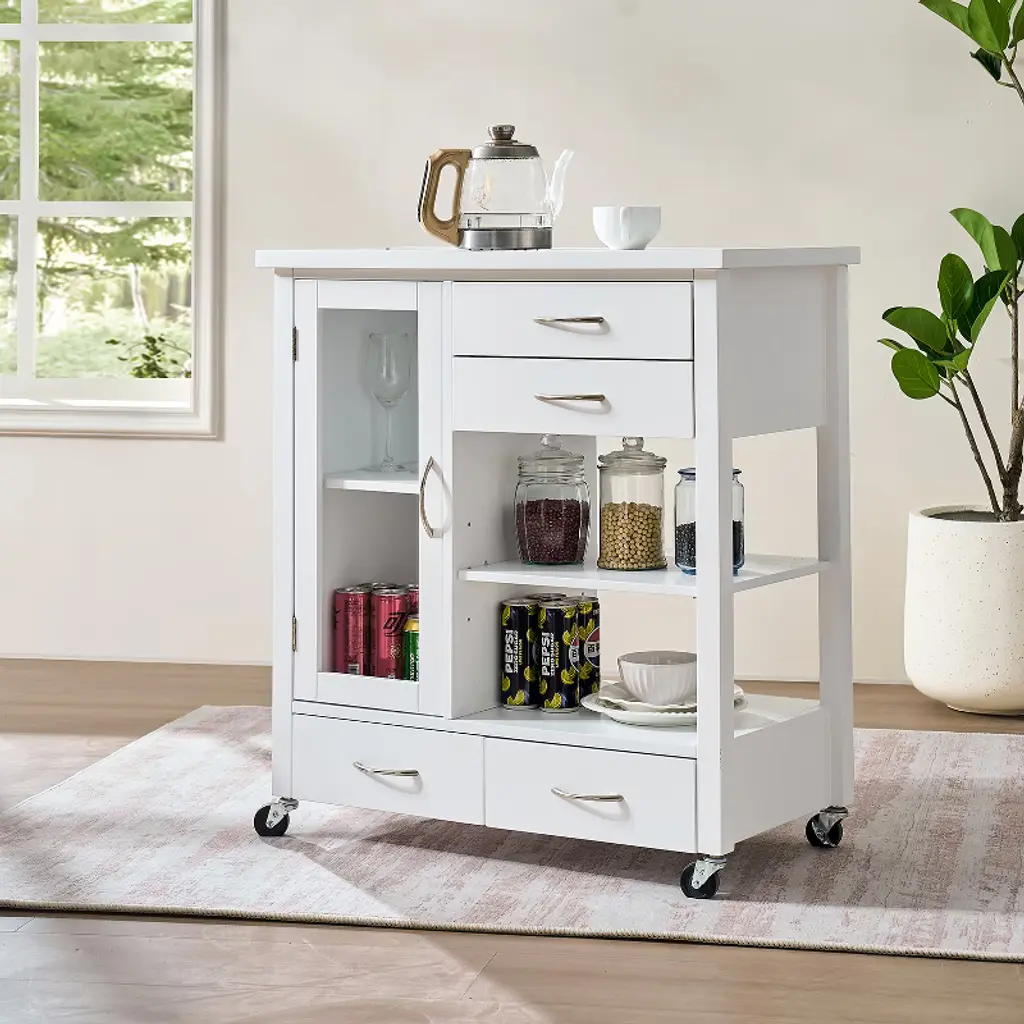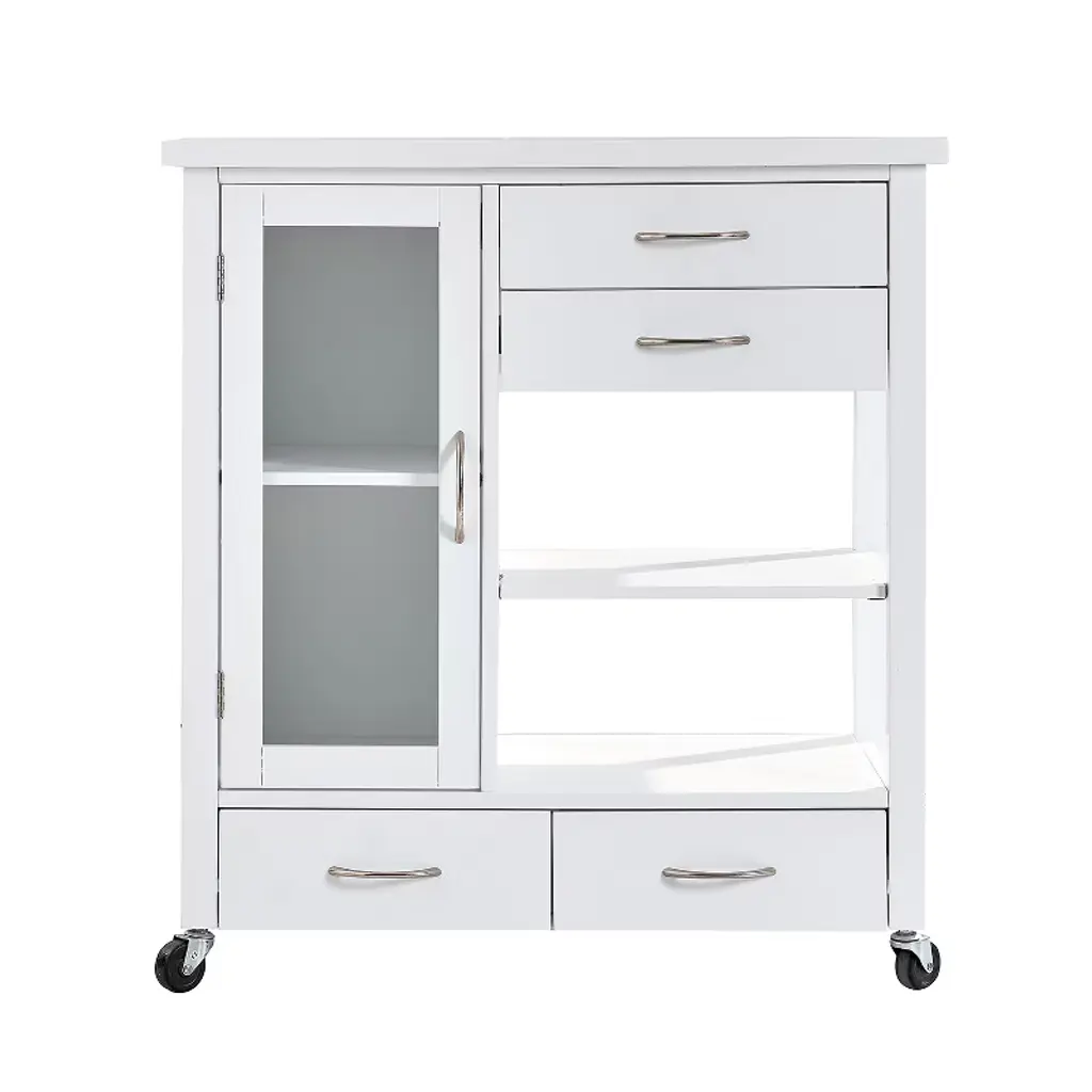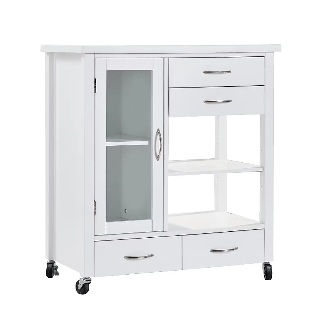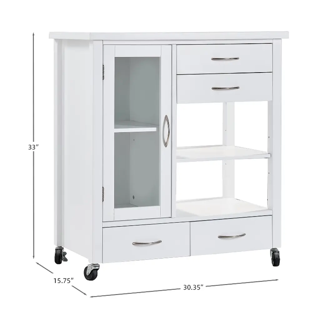 Introducing the versatile Dining Cart, designed to maximize your kitchen and dining space without compromising on style. This sleek kitchen cart features a durable engineered wood frame in a clean white finish, seamlessly complemented by modern silver-tone handles and stylish glass panel accents. With multiple storage options including open shelving, drawers, and a glass-door cabinet, it offers practical yet chic organization for tableware, dry goods, and cooking essentials. Effortlessly move it wherever you need it with the four smooth-rolling caster wheels, two of which can lock for stable positioning. Enhance your home with this functional and attractive addition that fits beautifully in both modern and transitional interiors.