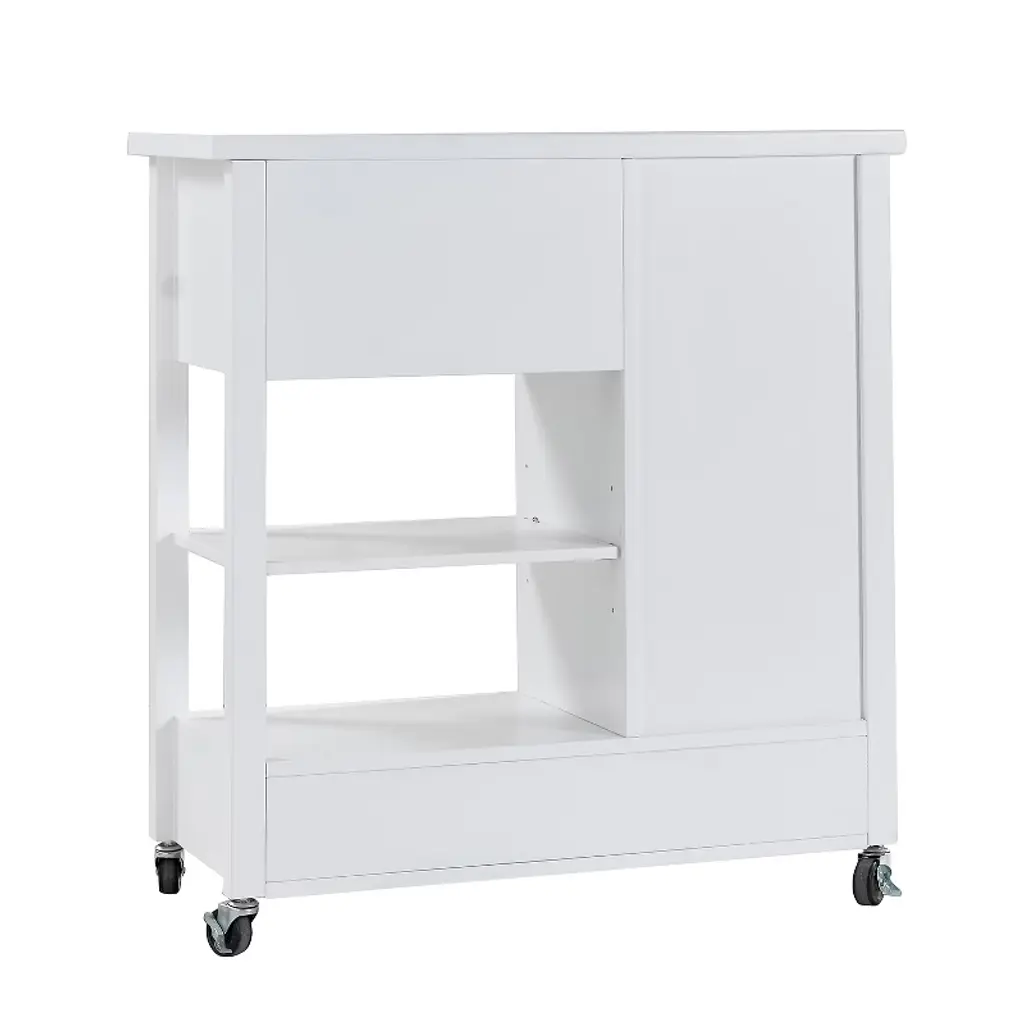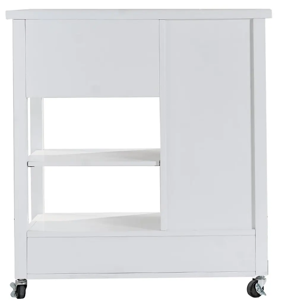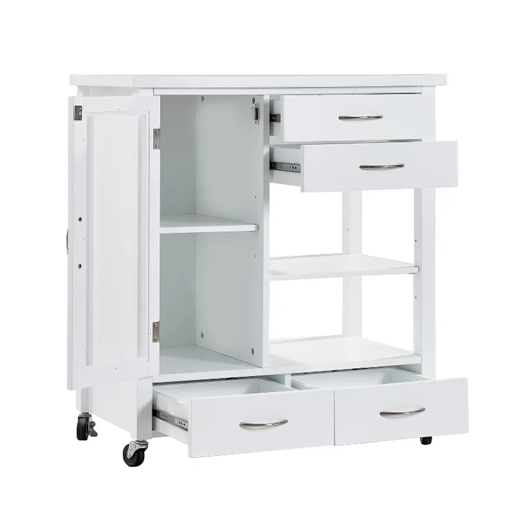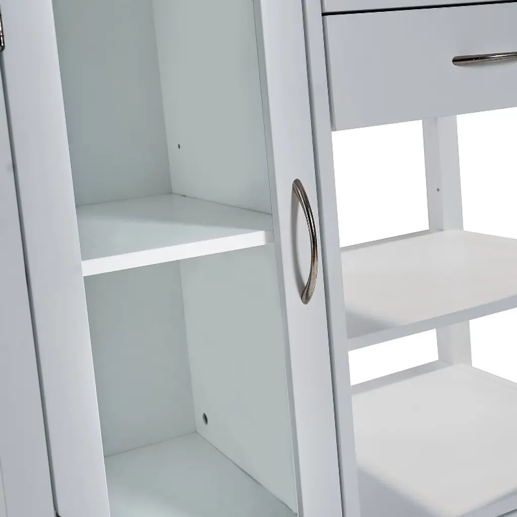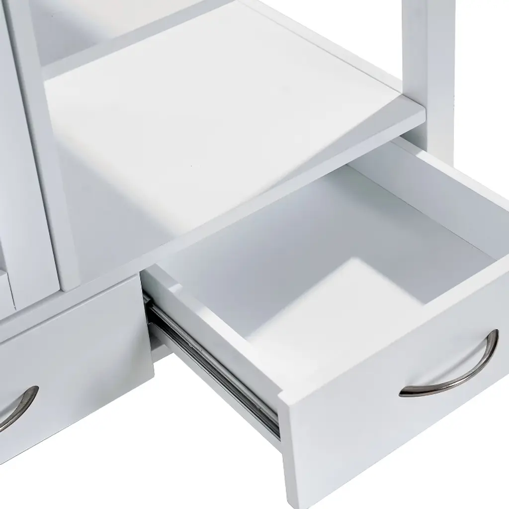 Introducing the versatile Dining Cart, designed to maximize your kitchen and dining space without compromising on style. This sleek kitchen cart features a durable engineered wood frame in a clean white finish, seamlessly complemented by modern silver-tone handles and stylish glass panel accents. With multiple storage options including open shelving, drawers, and a glass-door cabinet, it offers practical yet chic organization for tableware, dry goods, and cooking essentials. Effortlessly move it wherever you need it with the four smooth-rolling caster wheels, two of which can lock for stable positioning. Enhance your home with this functional and attractive addition that fits beautifully in both modern and transitional interiors.