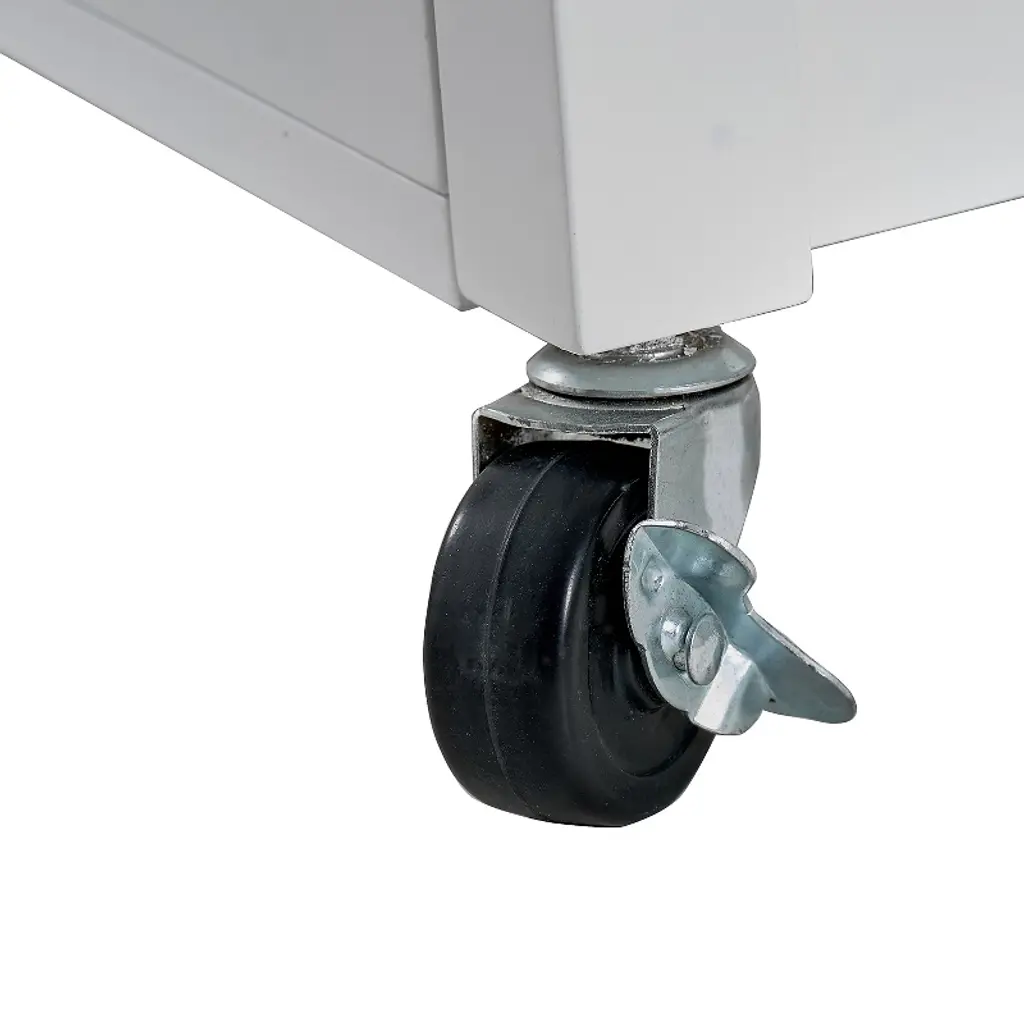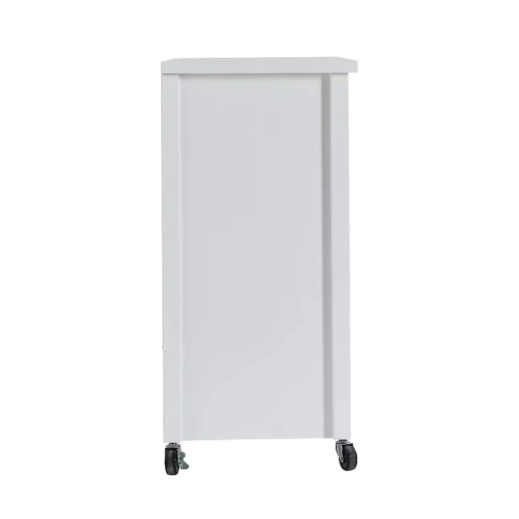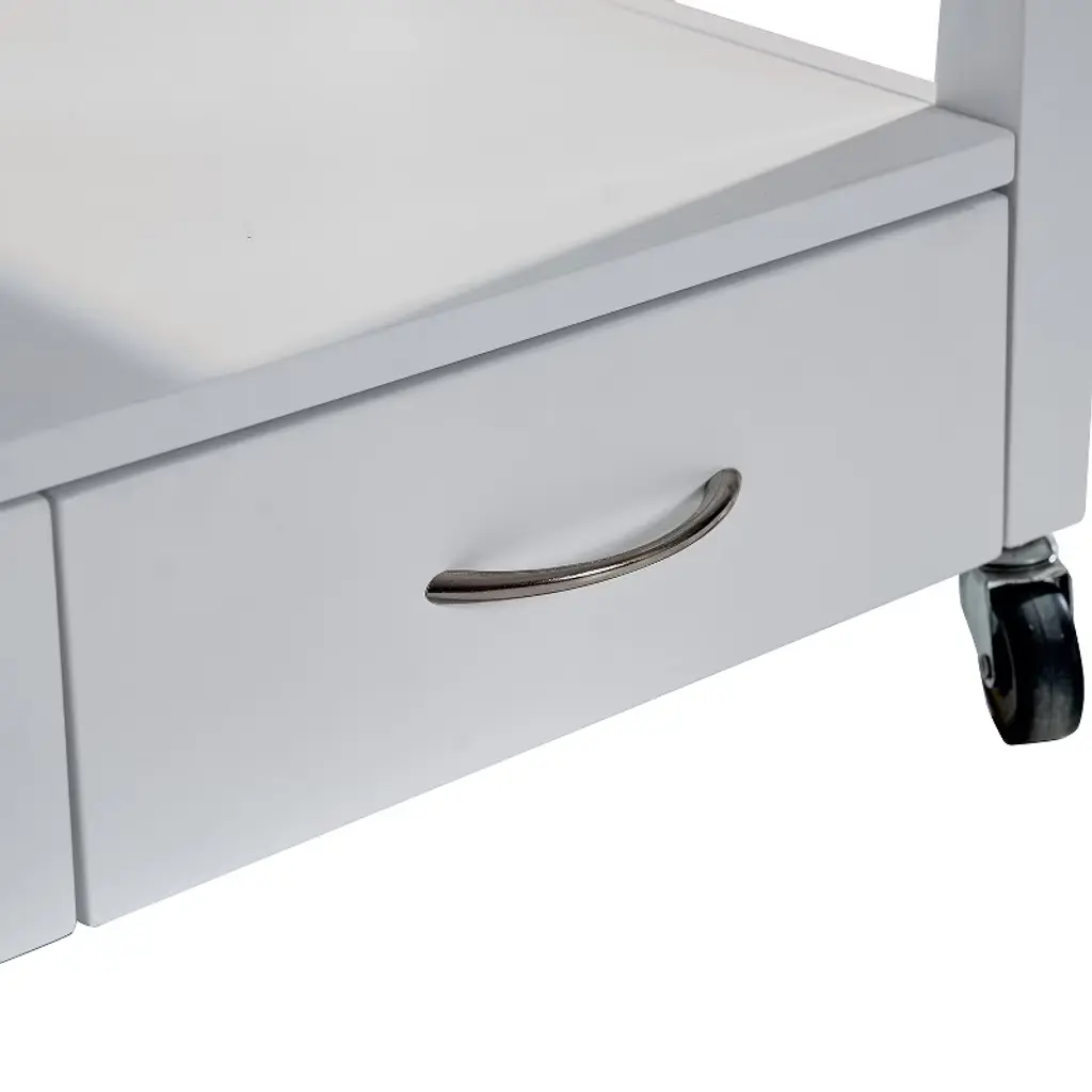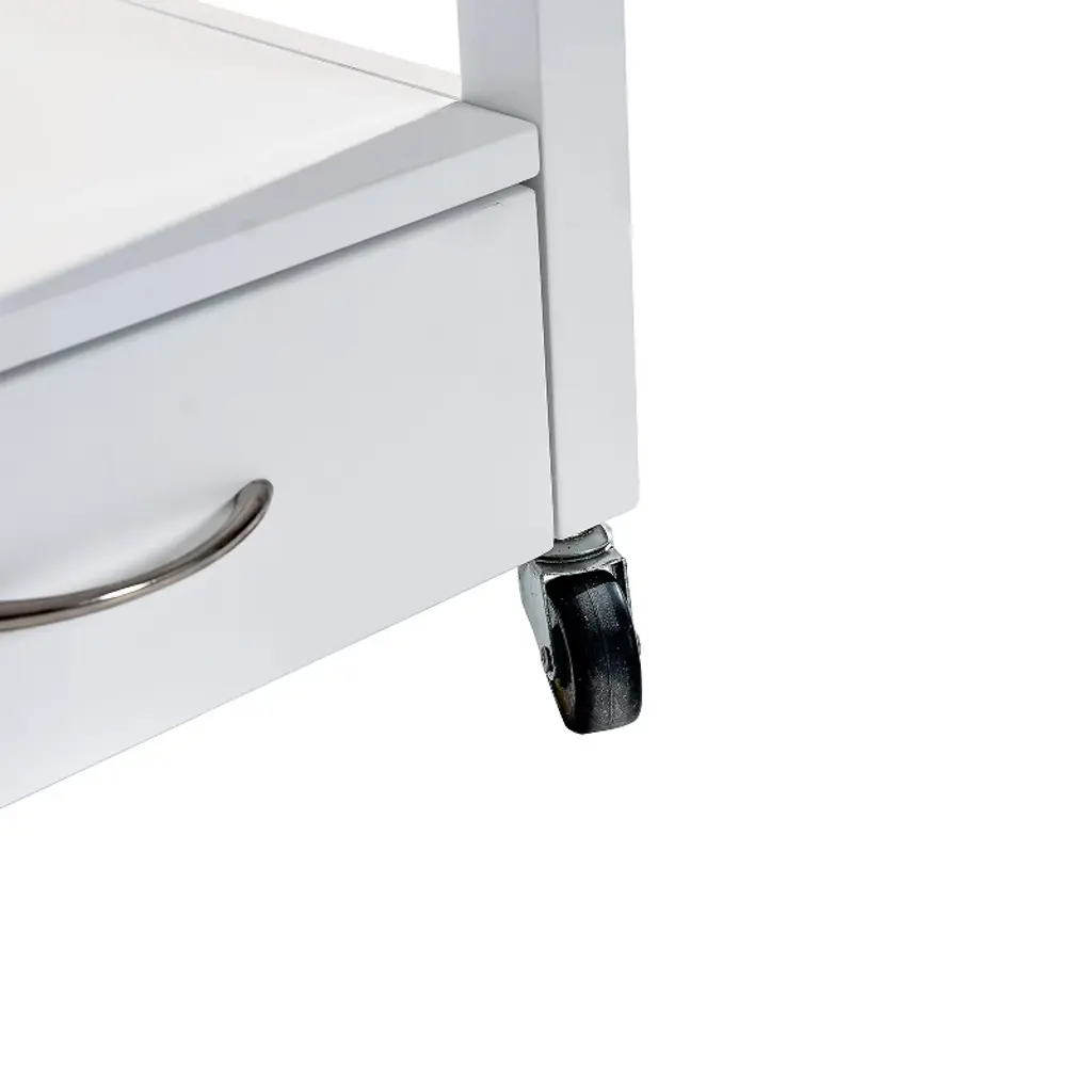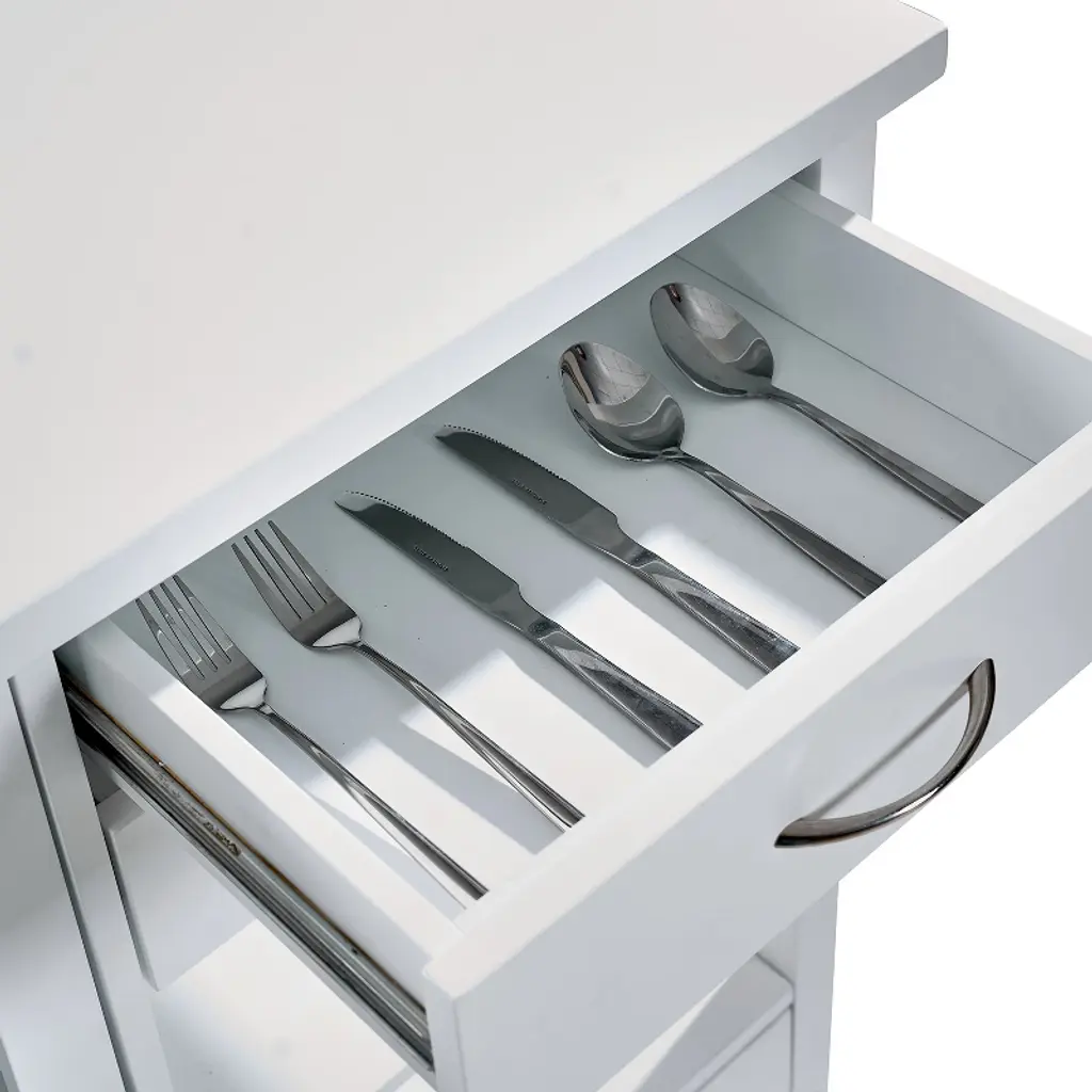 Introducing the versatile Dining Cart, designed to maximize your kitchen and dining space without compromising on style. This sleek kitchen cart features a durable engineered wood frame in a clean white finish, seamlessly complemented by modern silver-tone handles and stylish glass panel accents. With multiple storage options including open shelving, drawers, and a glass-door cabinet, it offers practical yet chic organization for tableware, dry goods, and cooking essentials. Effortlessly move it wherever you need it with the four smooth-rolling caster wheels, two of which can lock for stable positioning. Enhance your home with this functional and attractive addition that fits beautifully in both modern and transitional interiors.