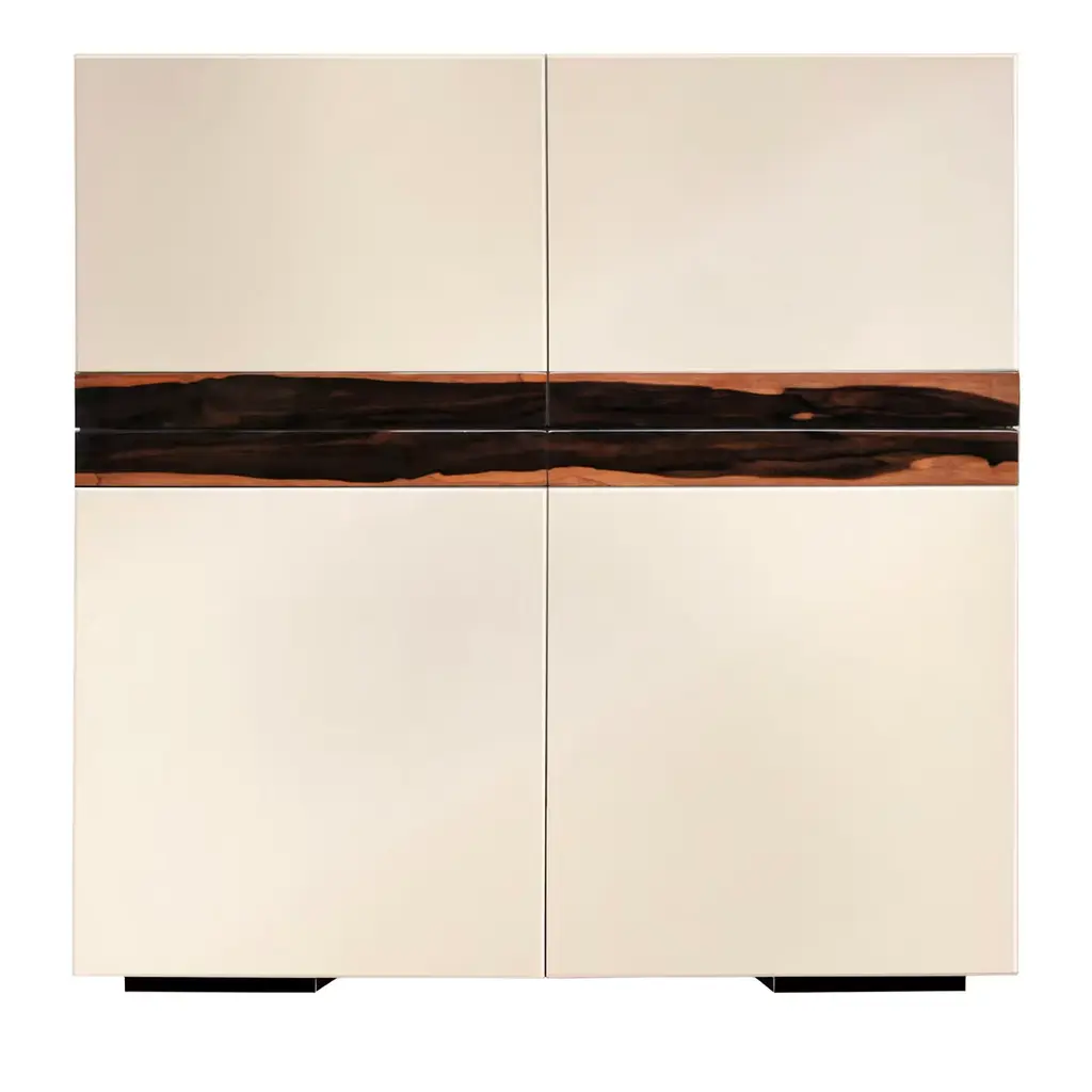 This striking bar cabinet will create a singular focal point in a modern living or dining room, infusing it with unparalleled sophistication. Lacquered in a cream polished polyurethane ink, the structure features four doors enriched with a refined central board in Makassar ebony. Lined with elegant dark stained mirrors, it features a chromed pull-out drawer for bar accessories and glassware. Illuminated with LED lights, it is available for customizations.